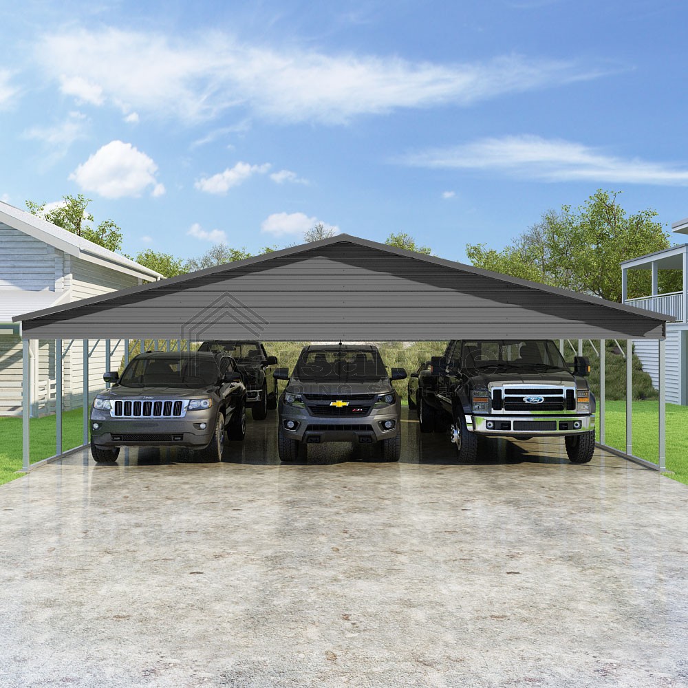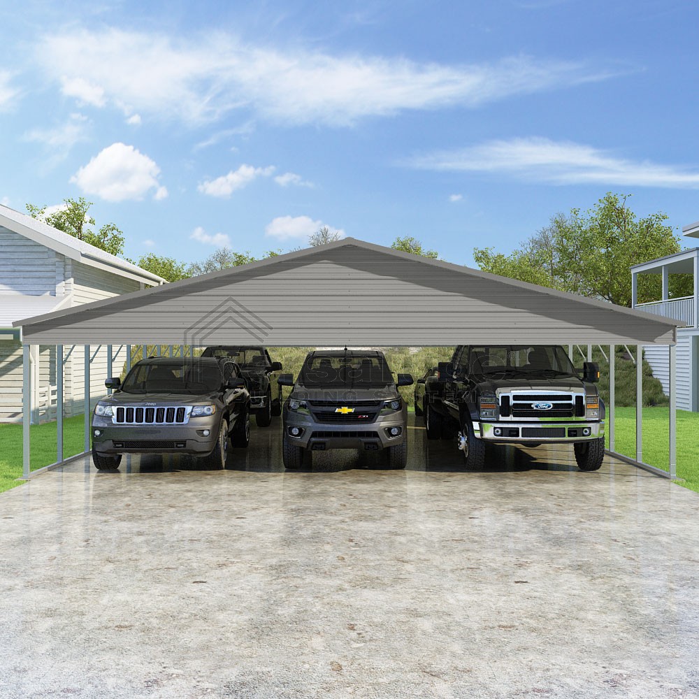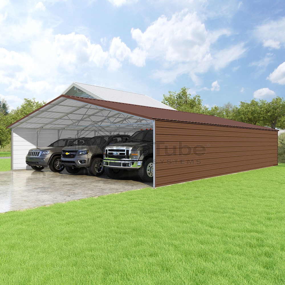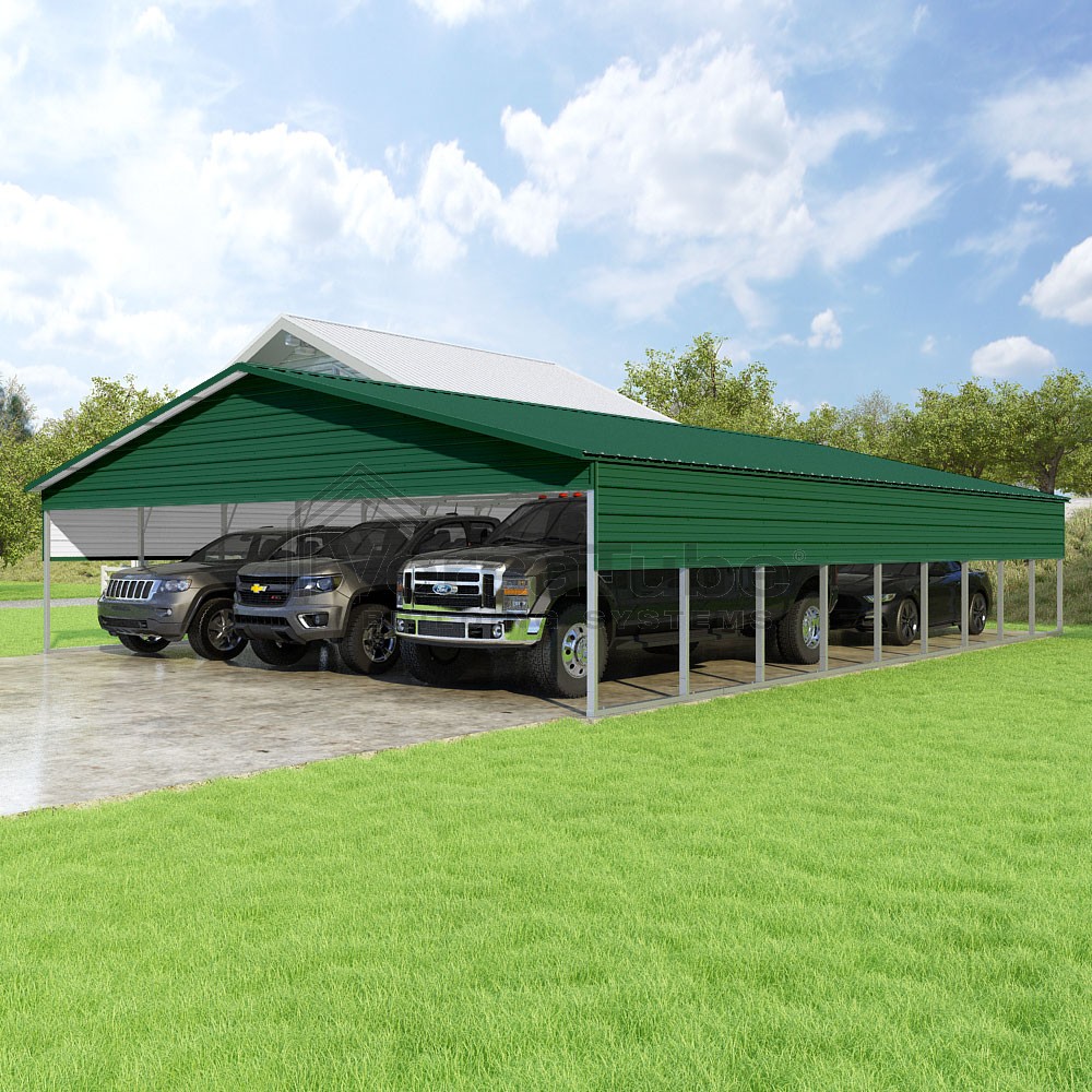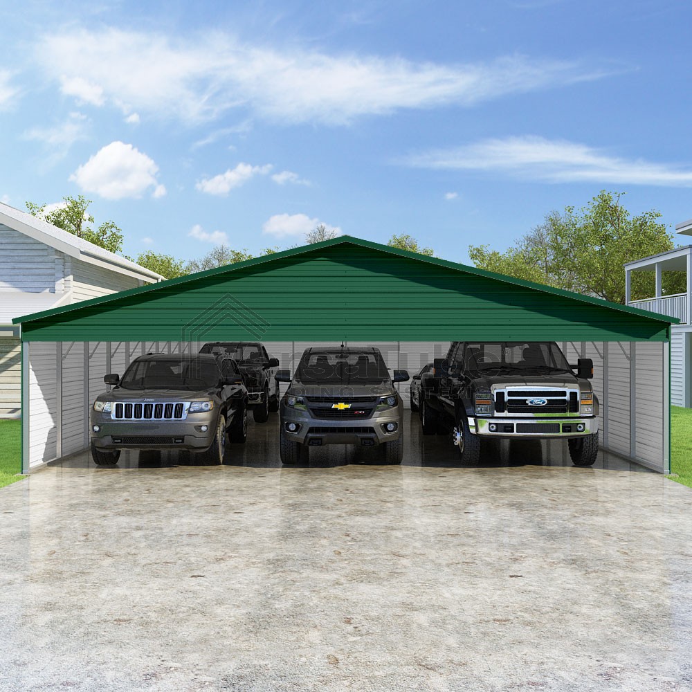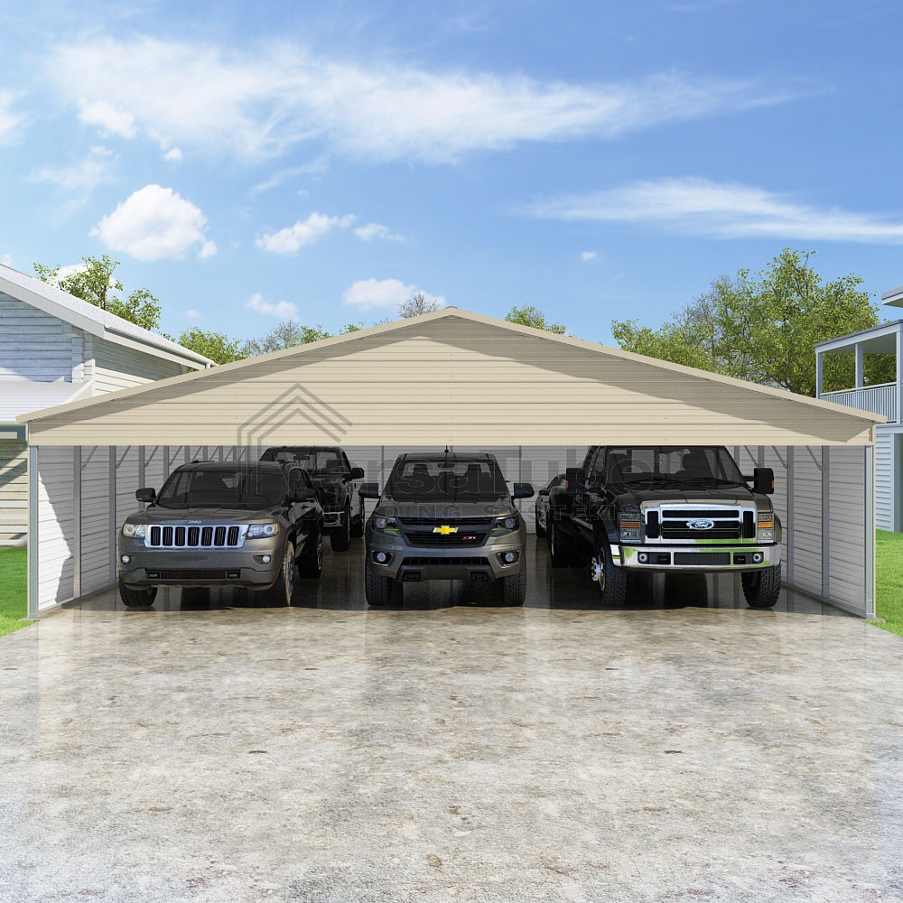 Pinnacle Series DIY carport kit features vertical sheet metal roof panels with ridge cap, gable and eave trim for an A-frame roof style and extended coverage on both ends.