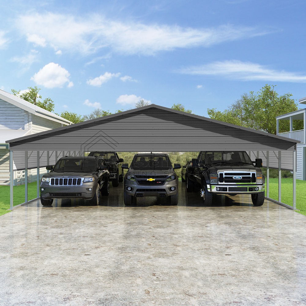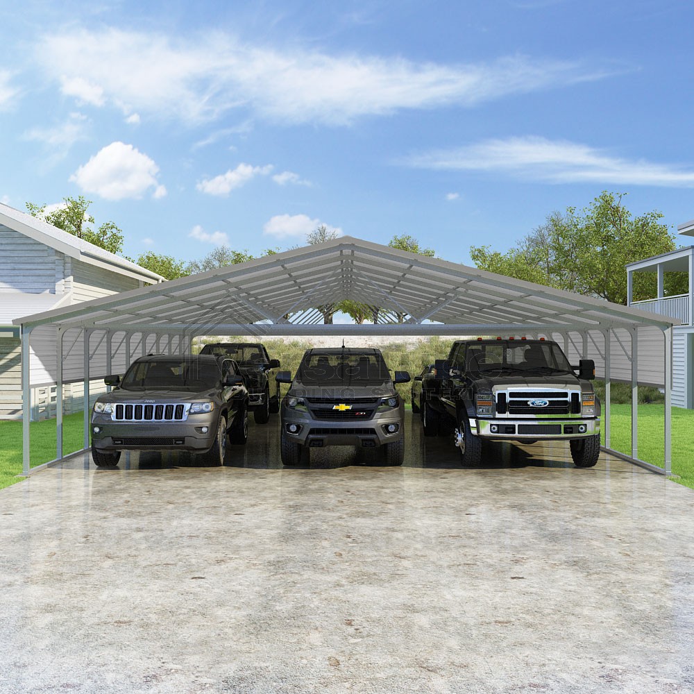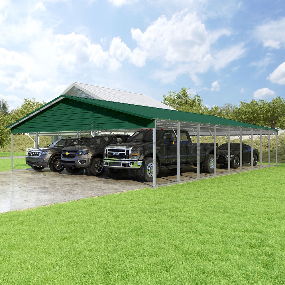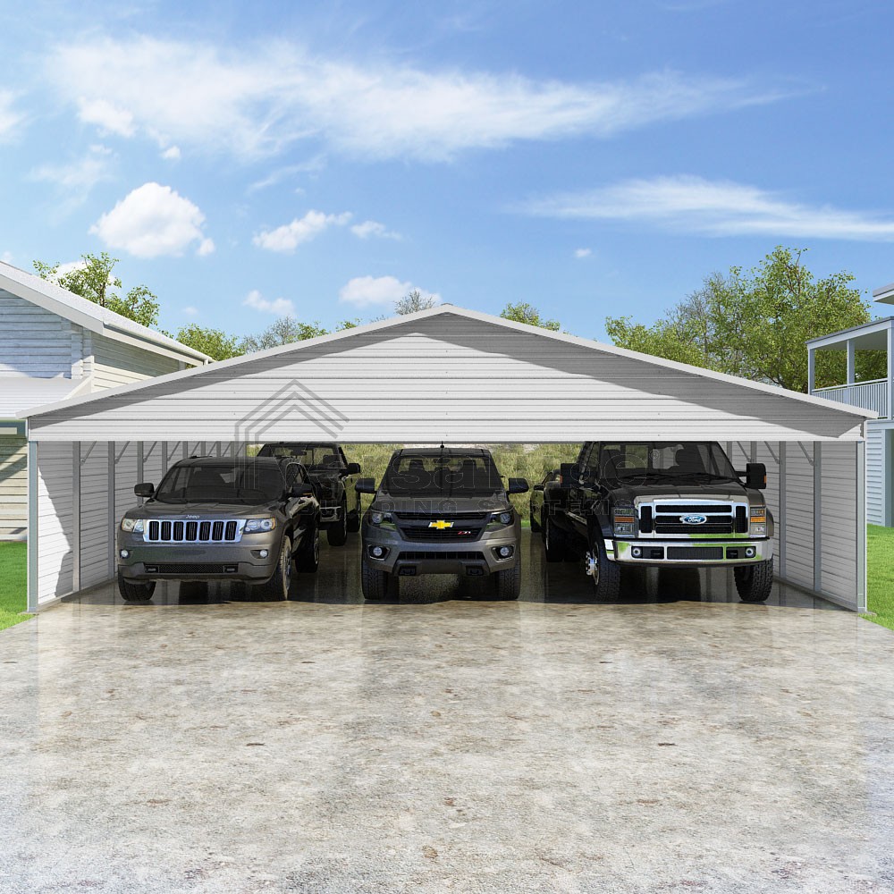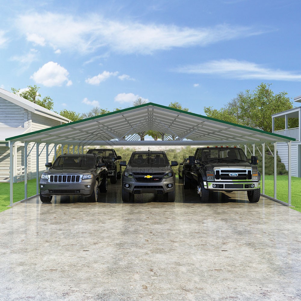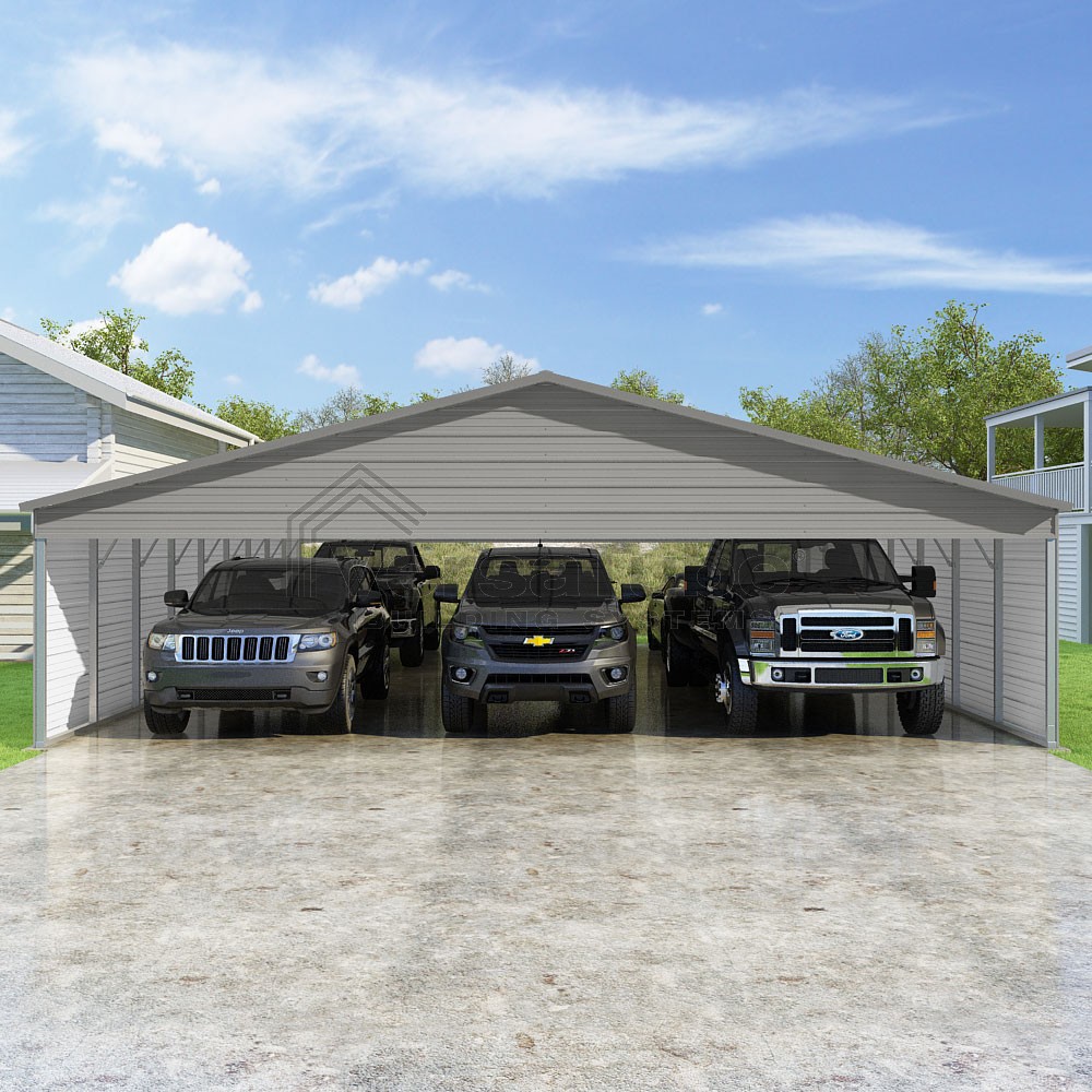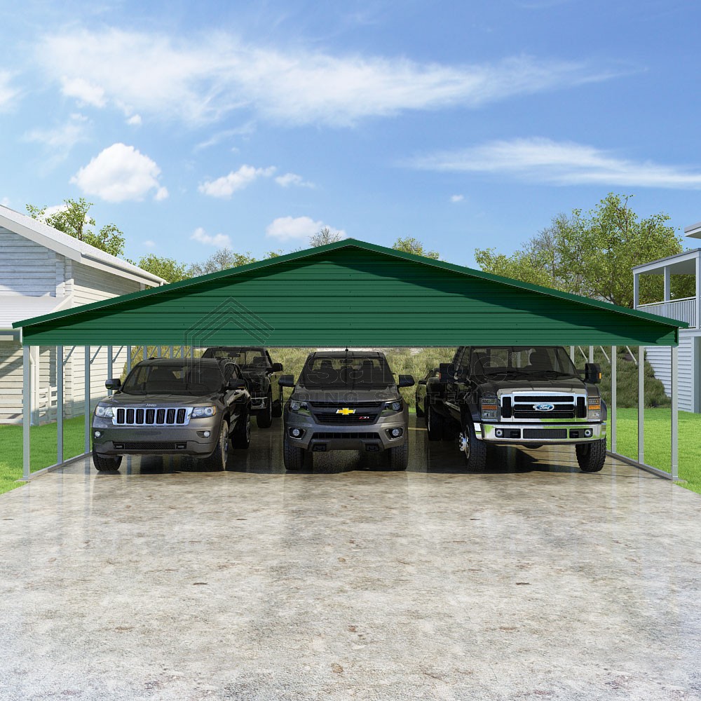 Pinnacle Series DIY carport kit features vertical sheet metal roof panels with ridge cap, gable and eave trim for an A-frame roof style and extended coverage on both ends.