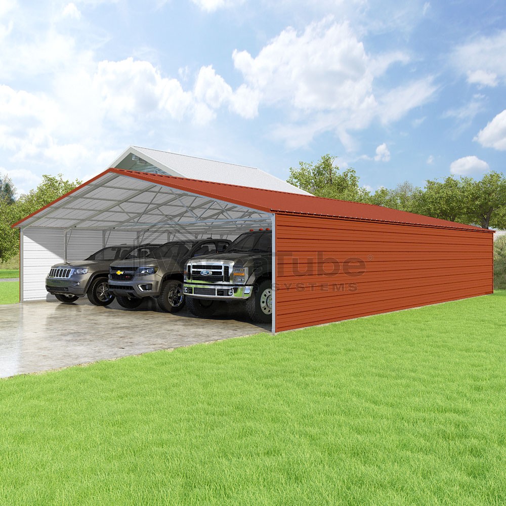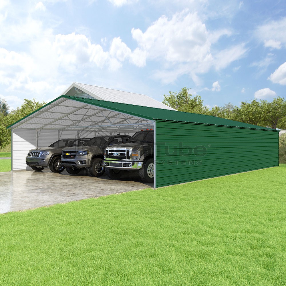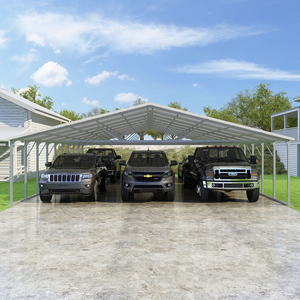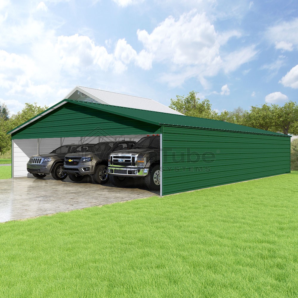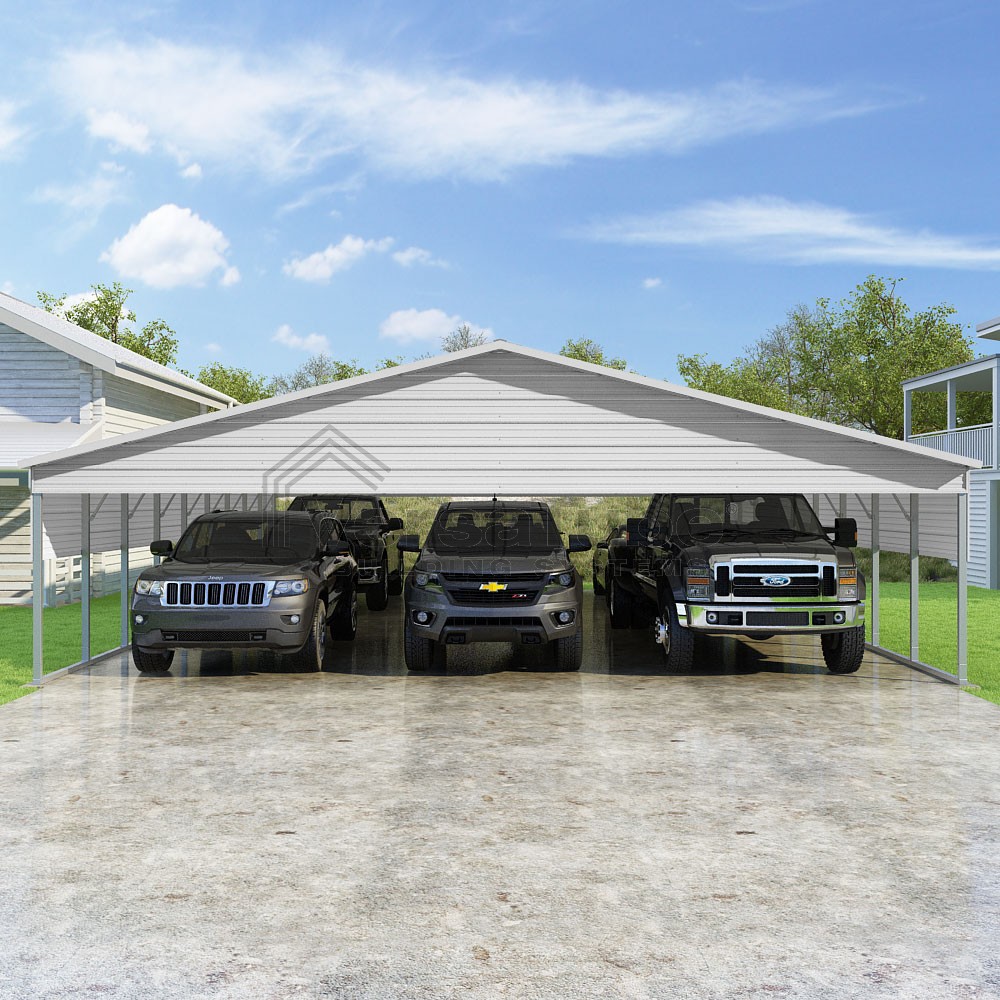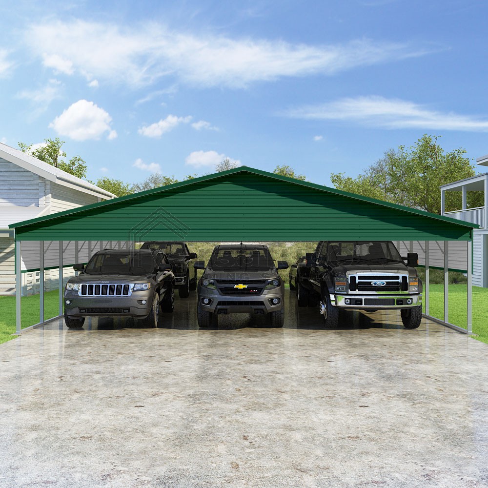 Pinnacle Series DIY carport kit features vertical sheet metal roof panels with ridge cap, gable and eave trim for an A-frame roof style and extended coverage on both ends.