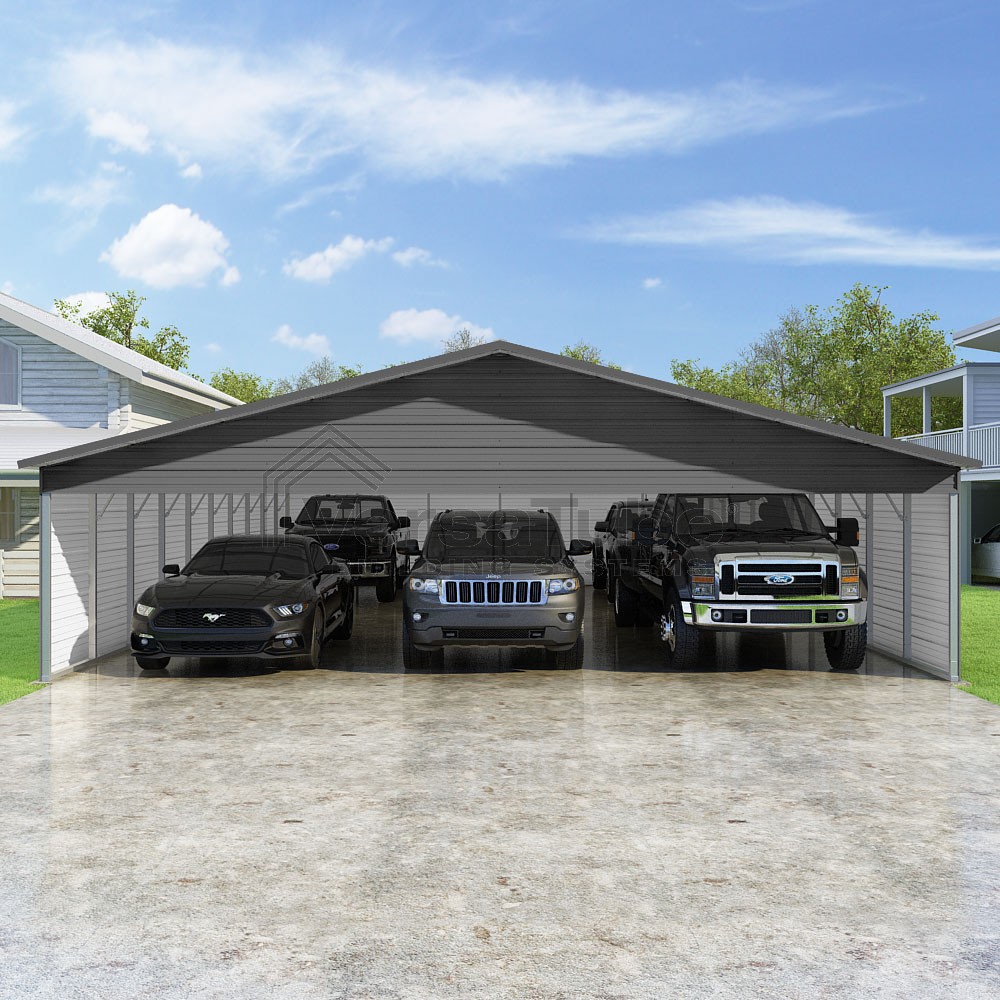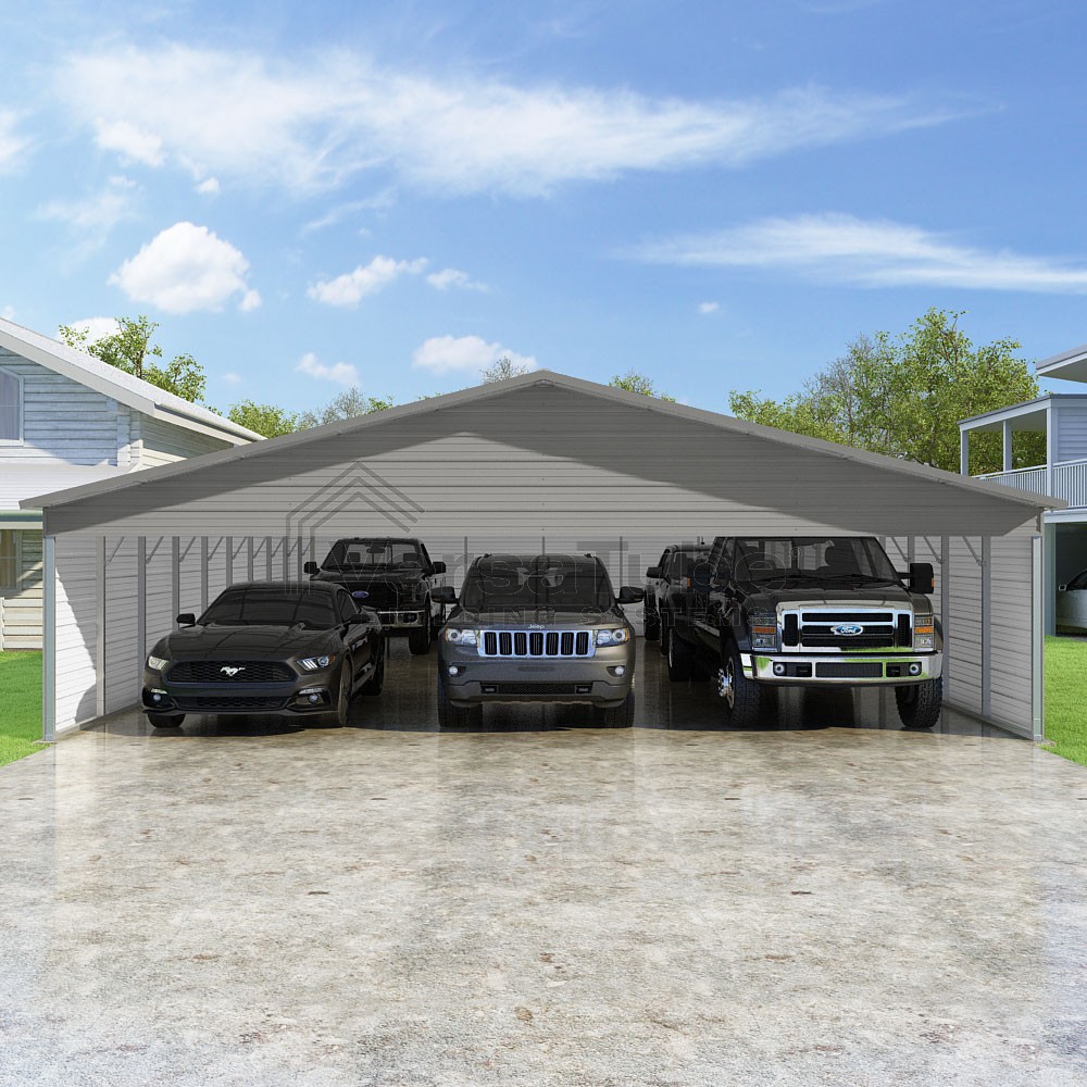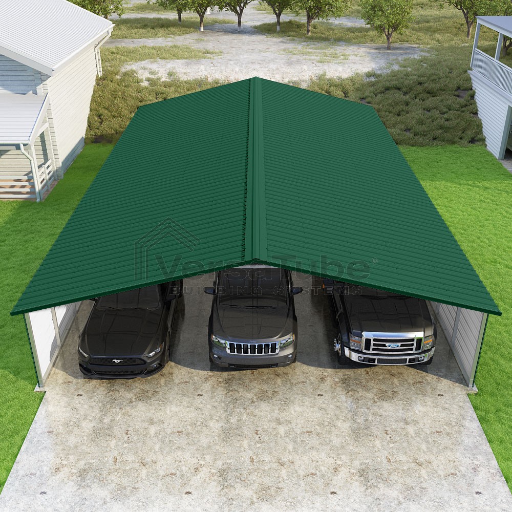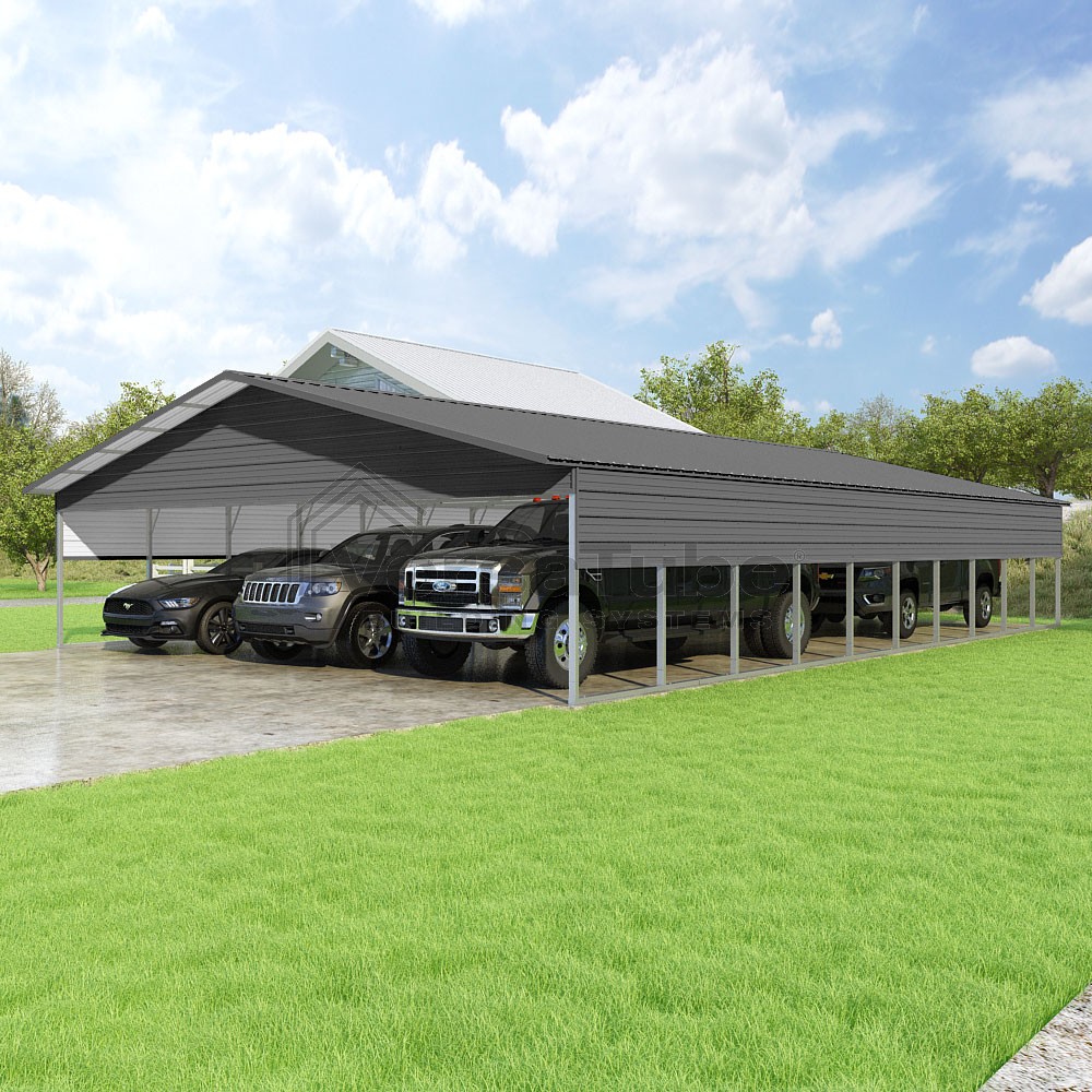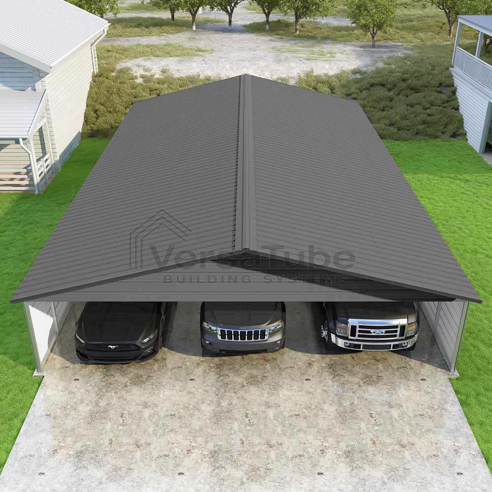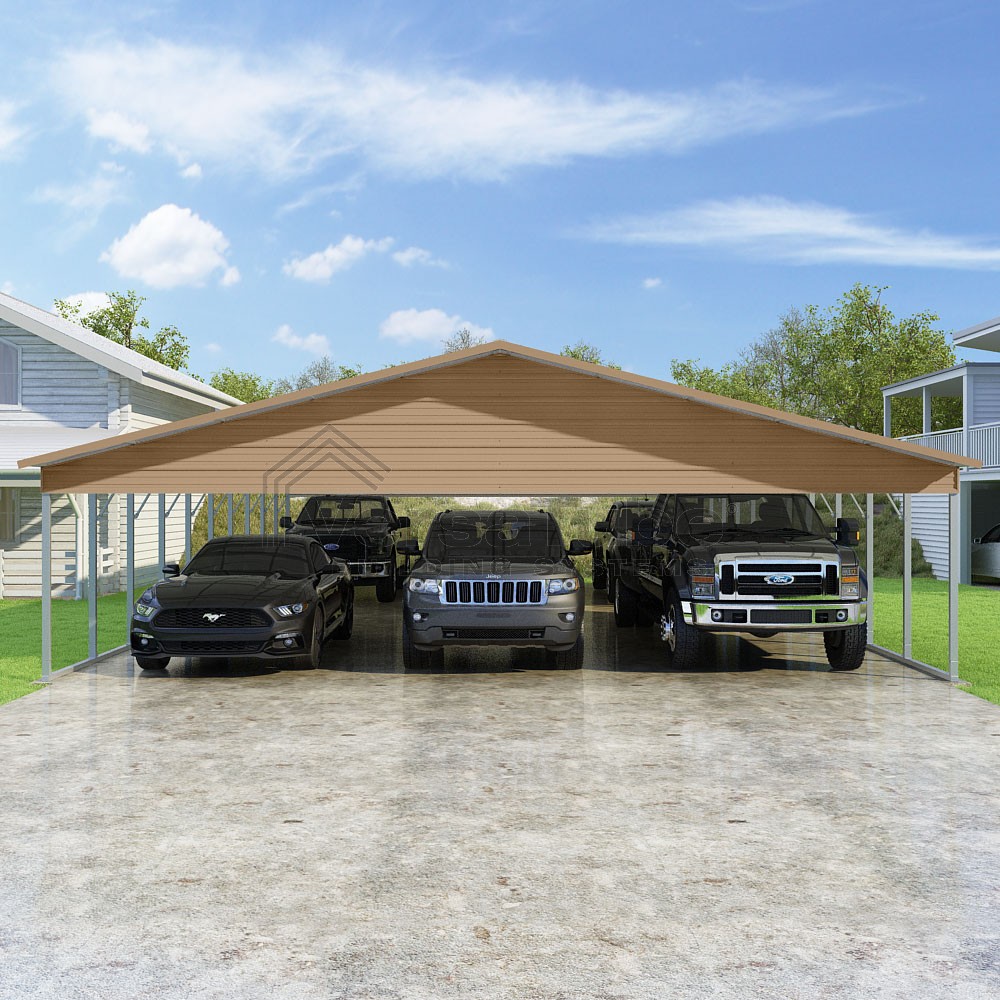 Pinnacle Series DIY carport kit features vertical sheet metal roof panels with ridge cap, gable and eave trim for an A-frame roof style and extended coverage on both ends.