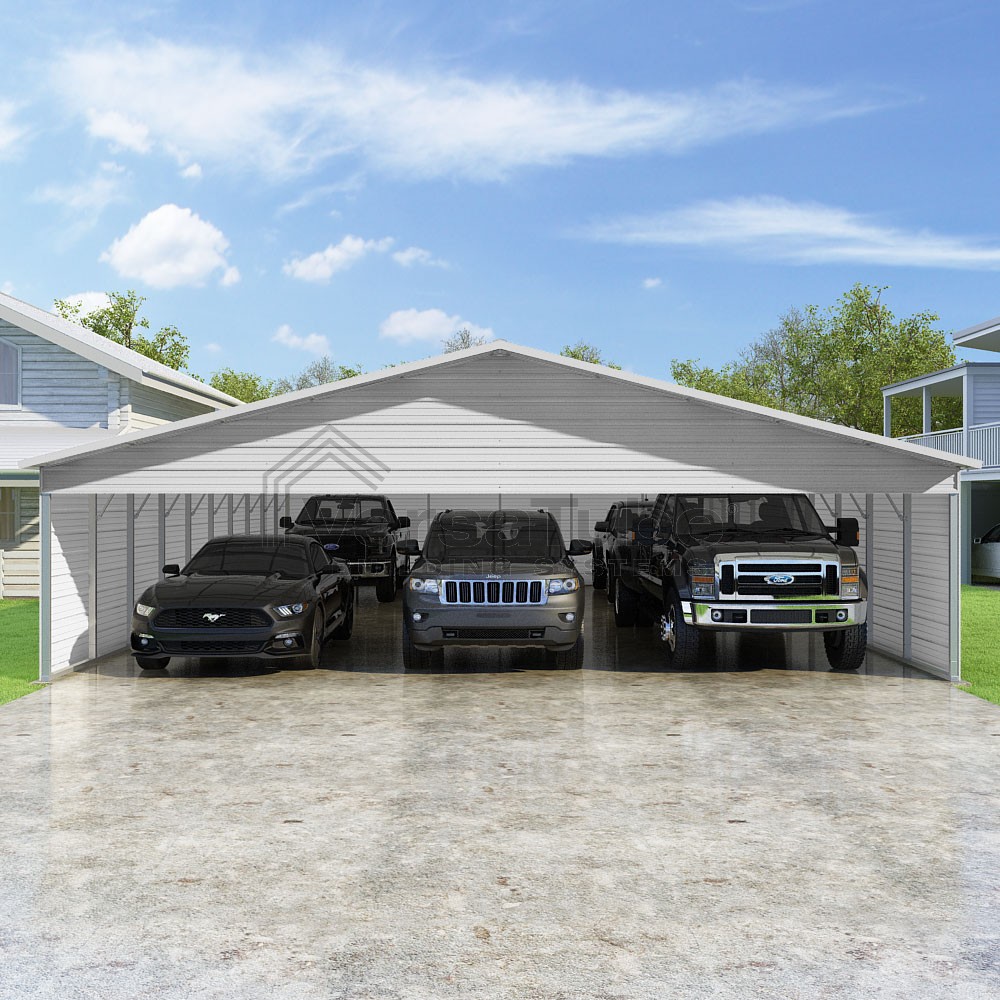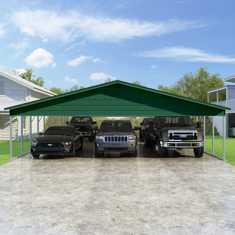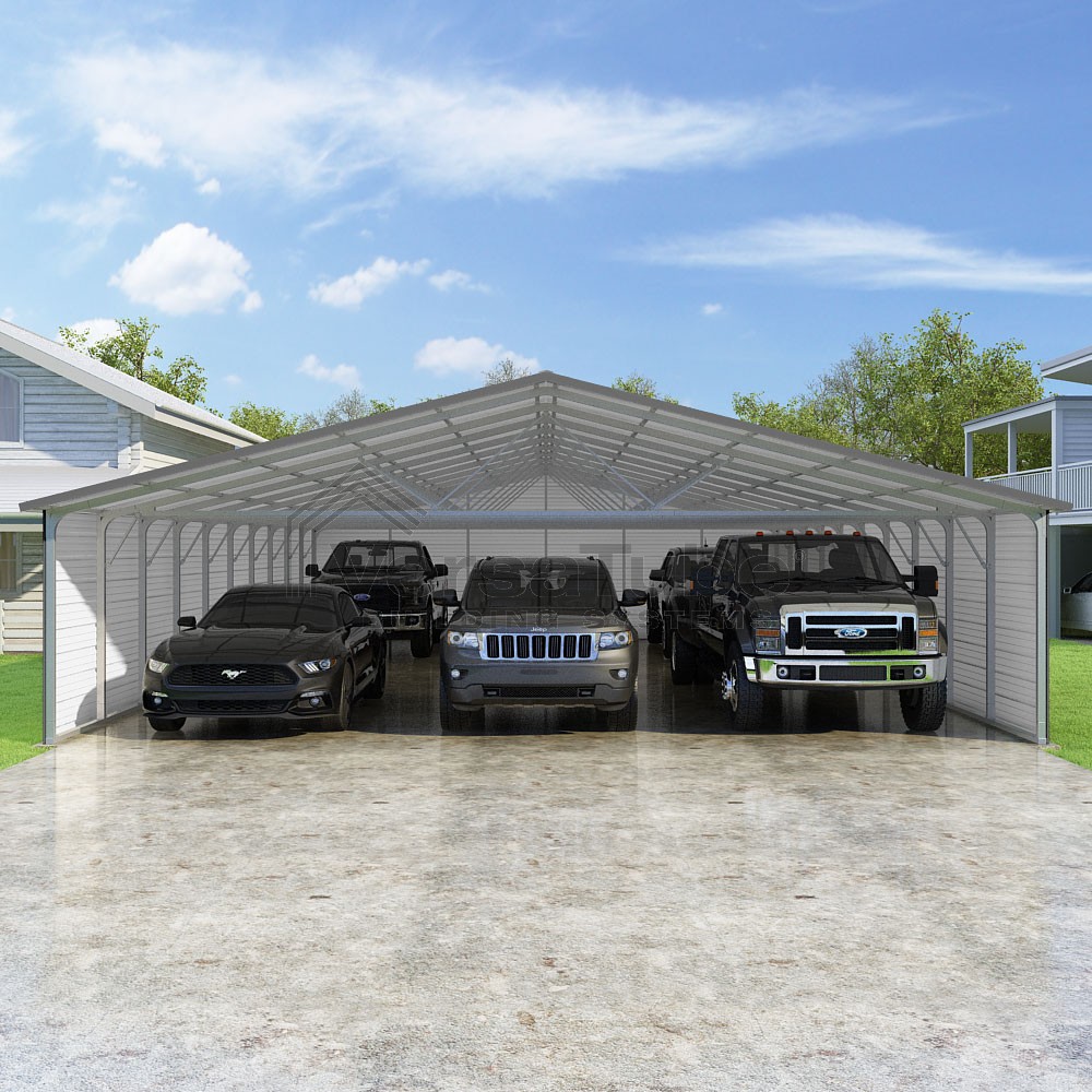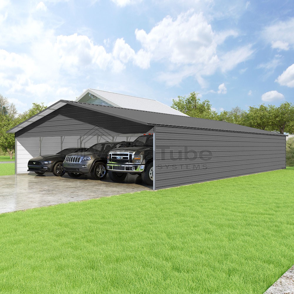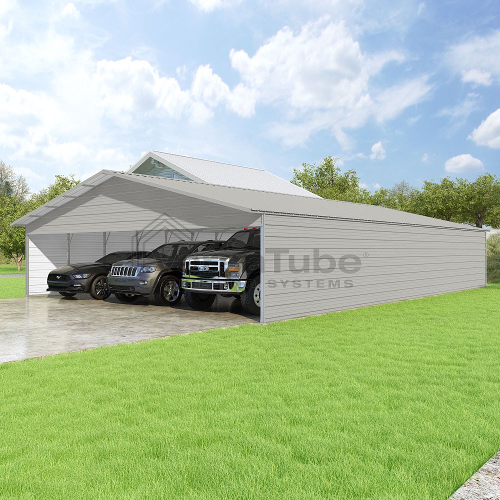 Pinnacle Series DIY carport kit features vertical sheet metal roof panels with ridge cap, gable and eave trim for an A-frame roof style and extended coverage on both ends.