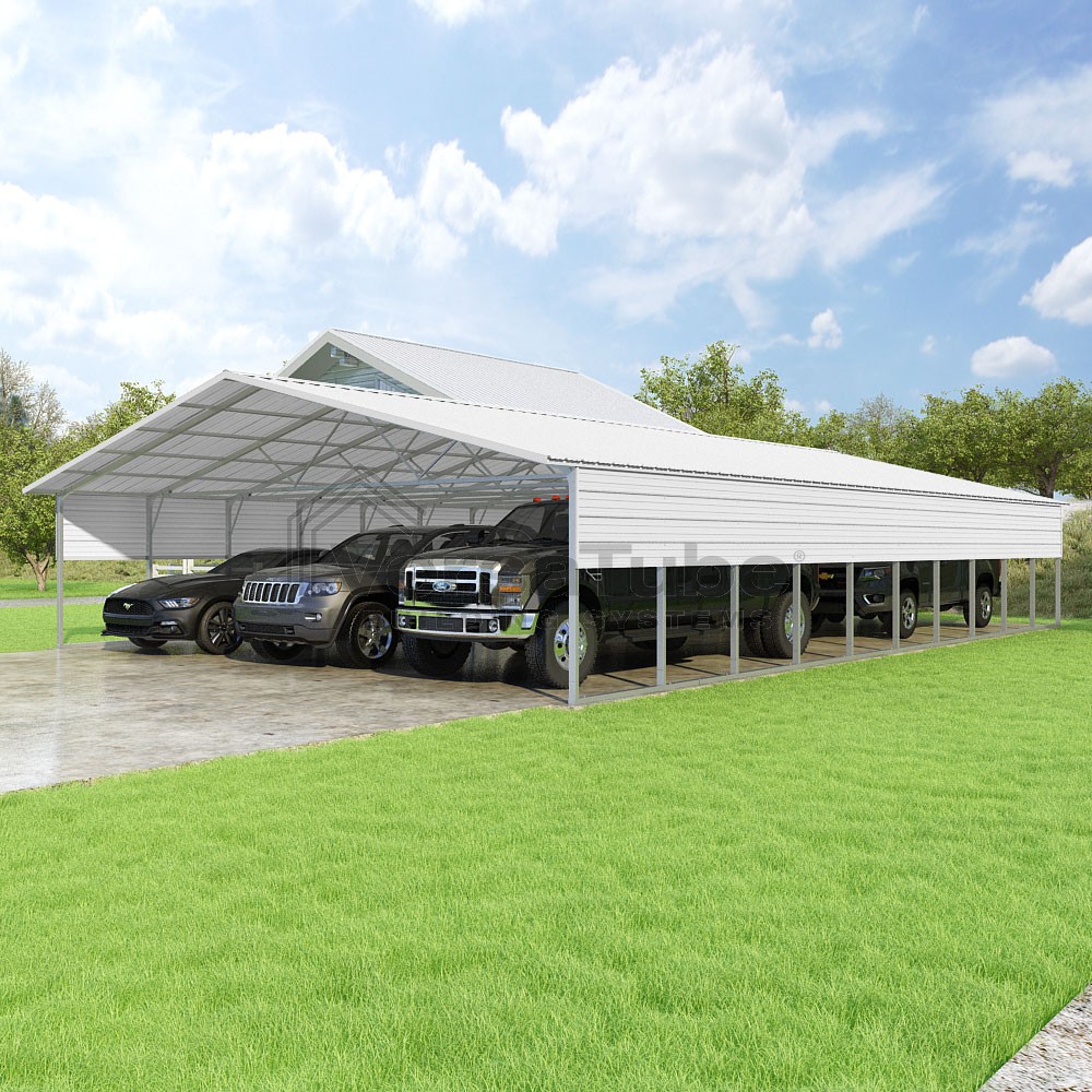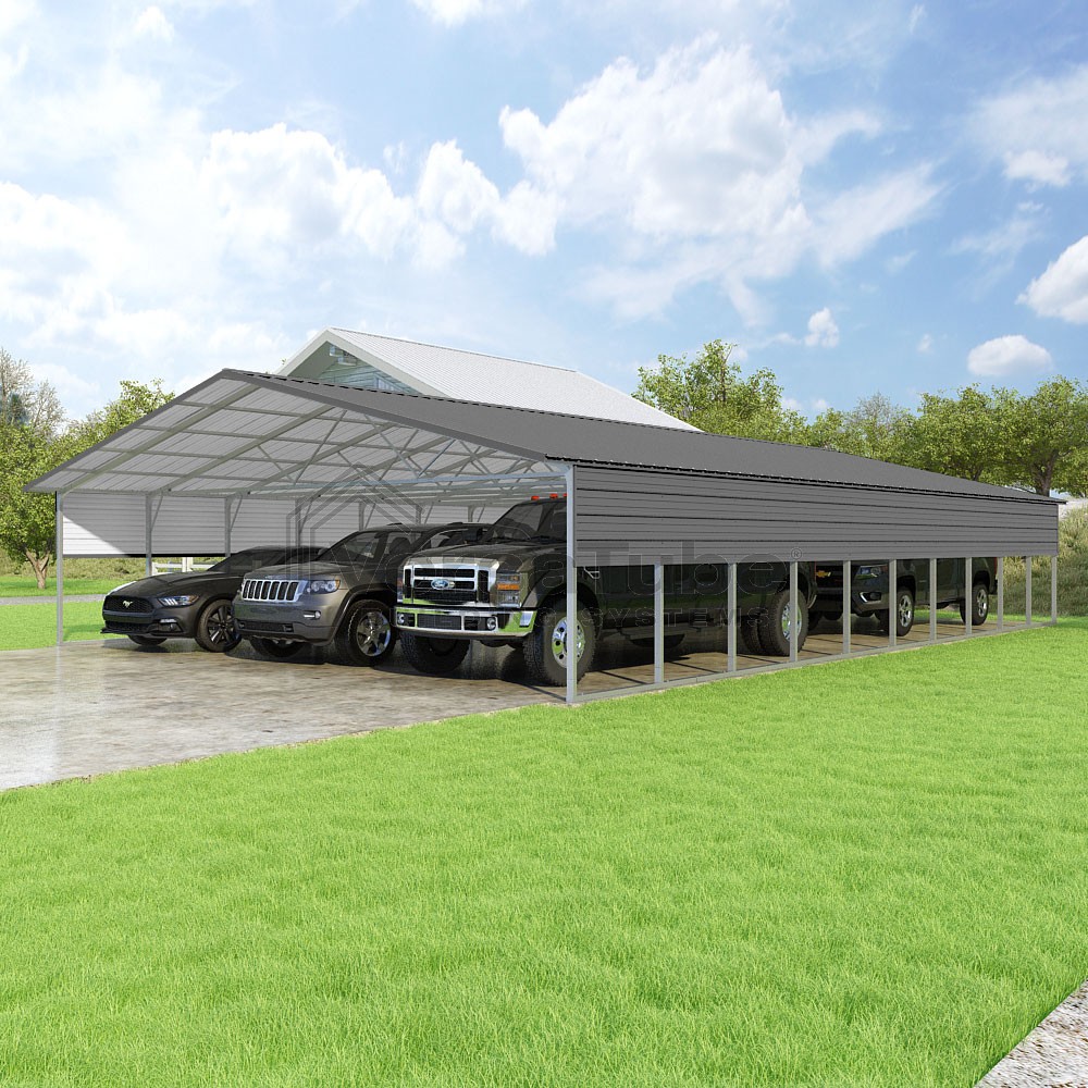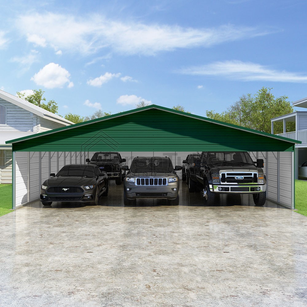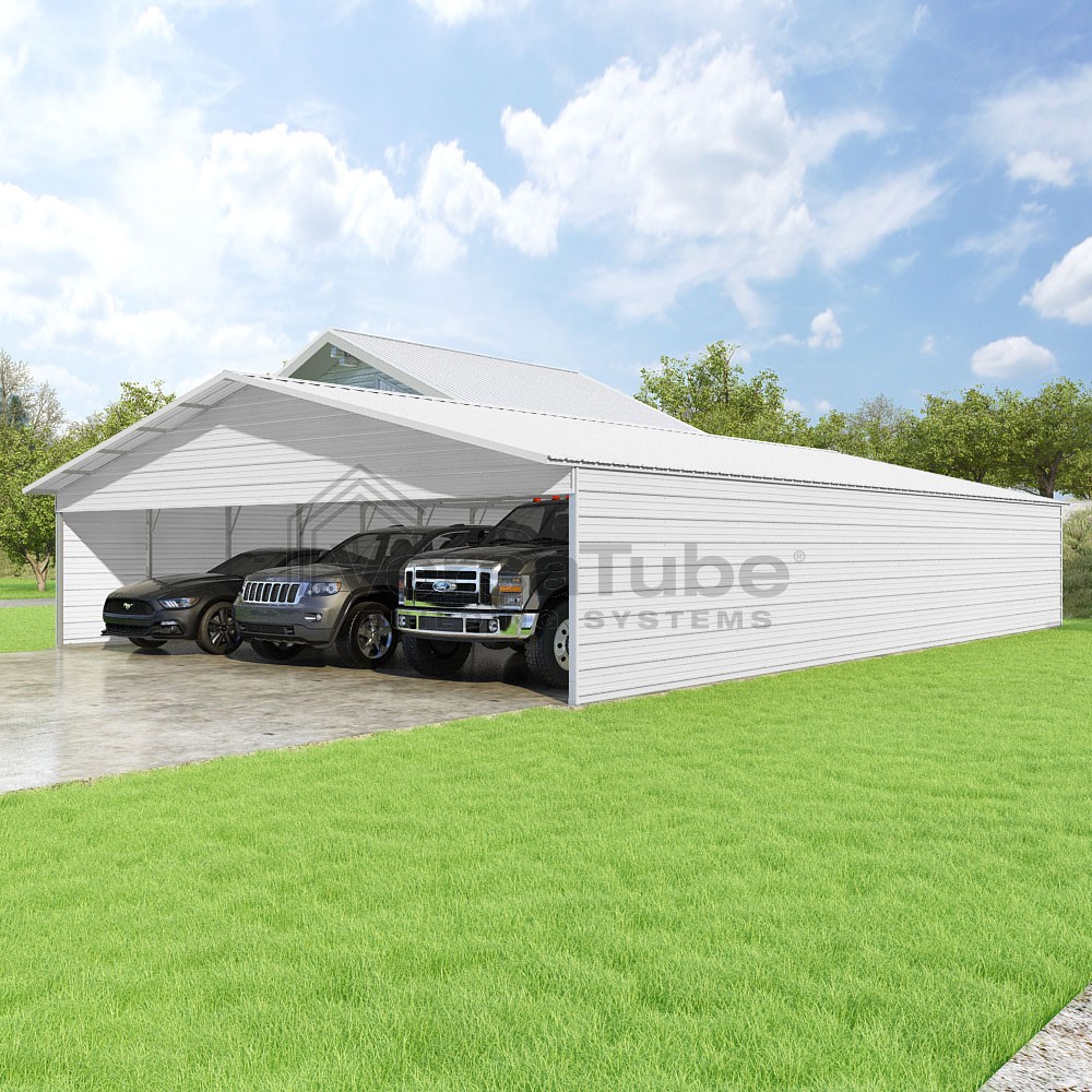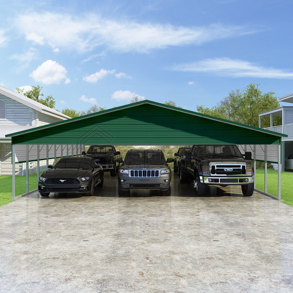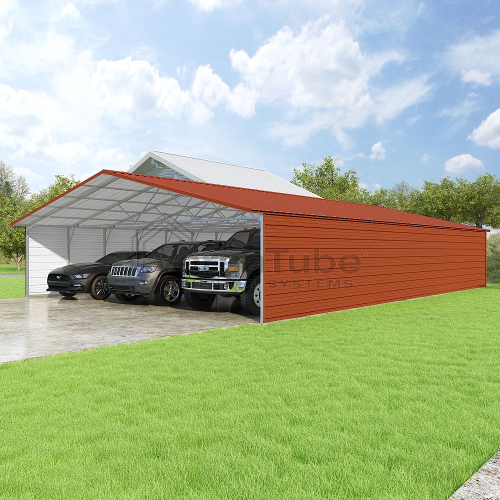 Pinnacle Series DIY carport kit features vertical sheet metal roof panels with ridge cap, gable and eave trim for an A-frame roof style and extended coverage on both ends.