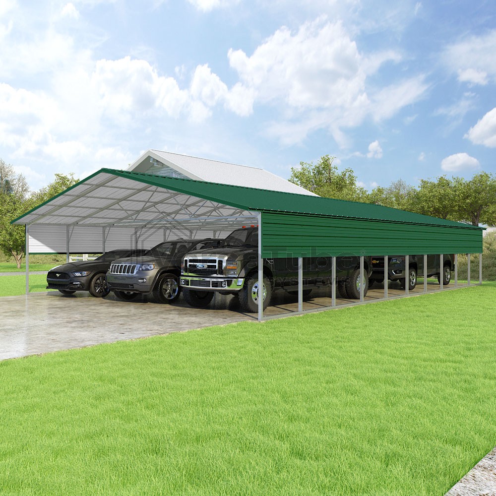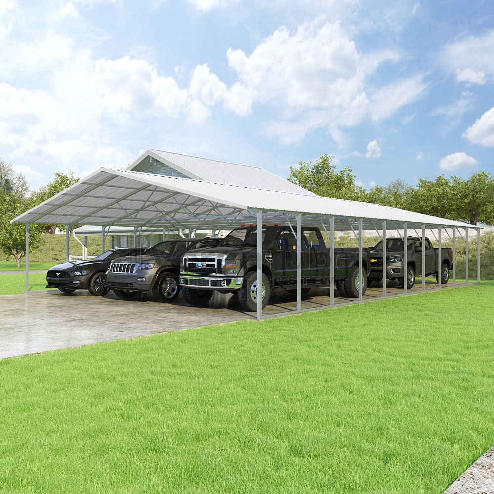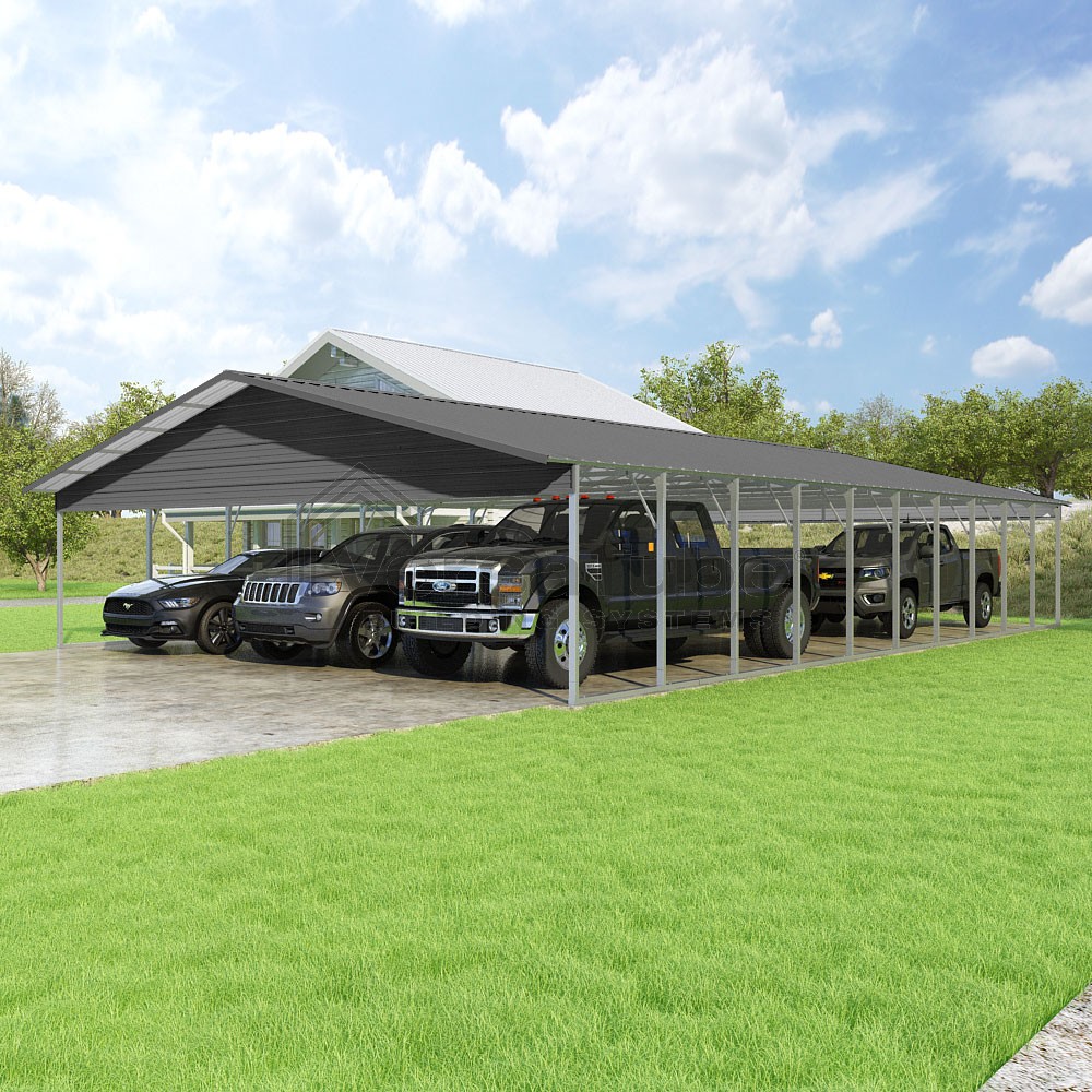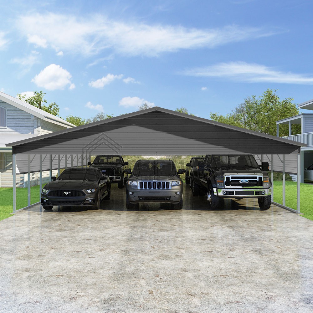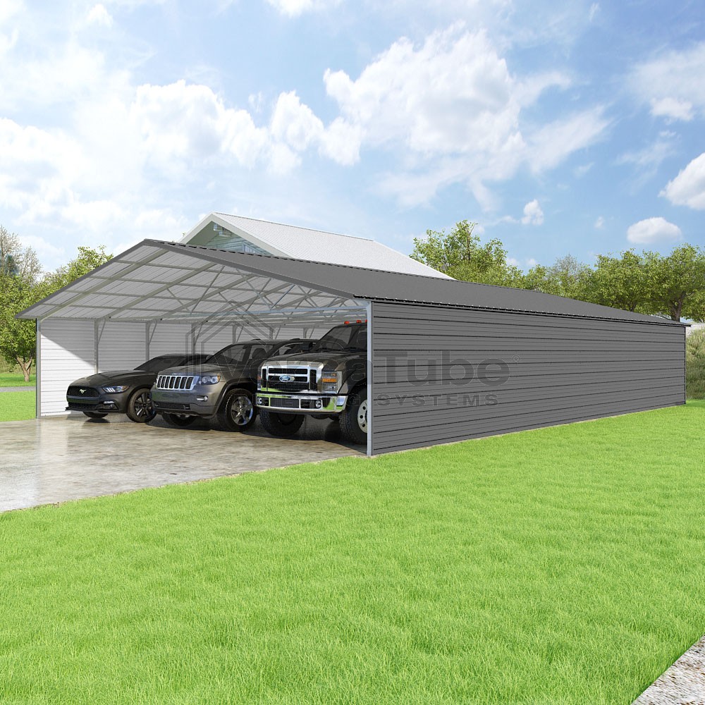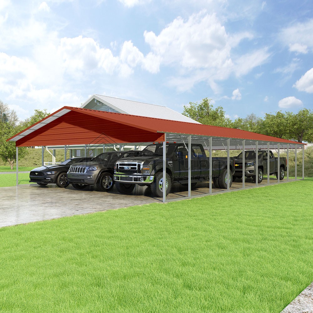 Pinnacle Series DIY carport kit features vertical sheet metal roof panels with ridge cap, gable and eave trim for an A-frame roof style and extended coverage on both ends.