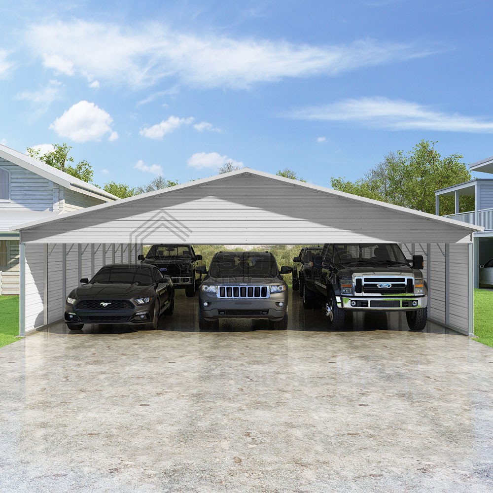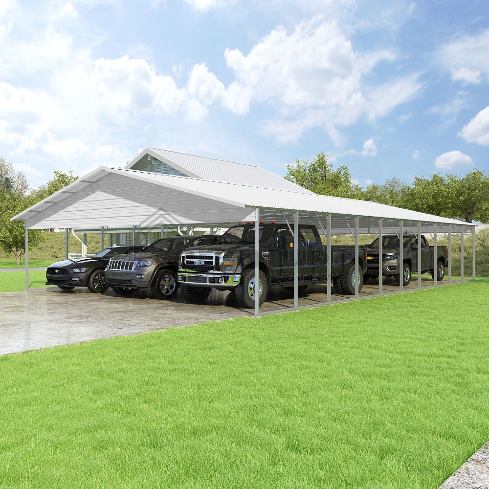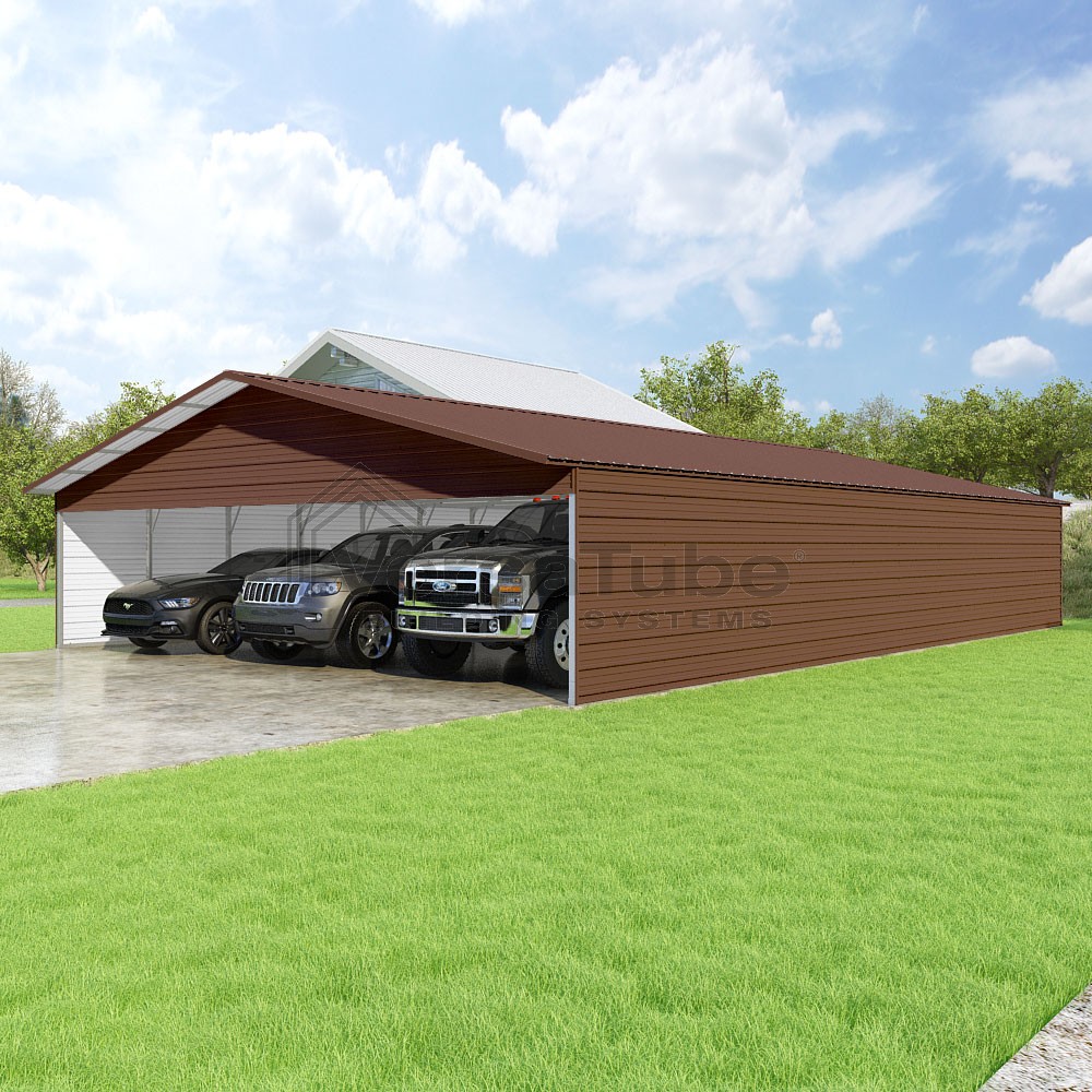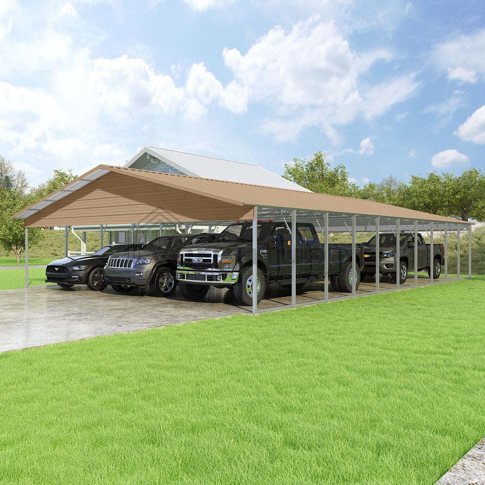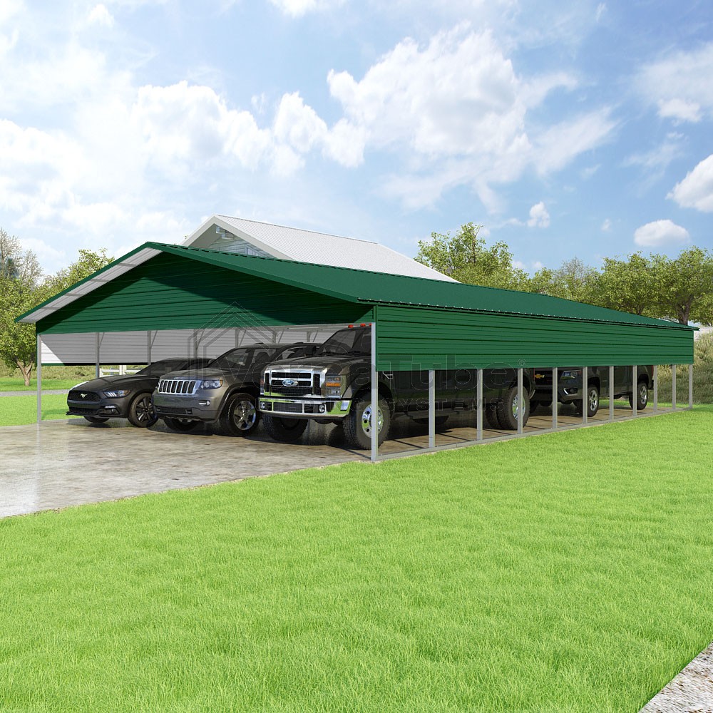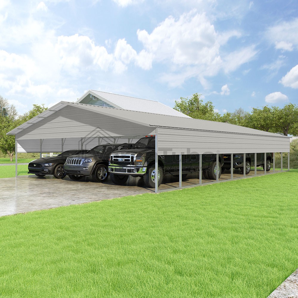 Pinnacle Series DIY carport kit features vertical sheet metal roof panels with ridge cap, gable and eave trim for an A-frame roof style and extended coverage on both ends.