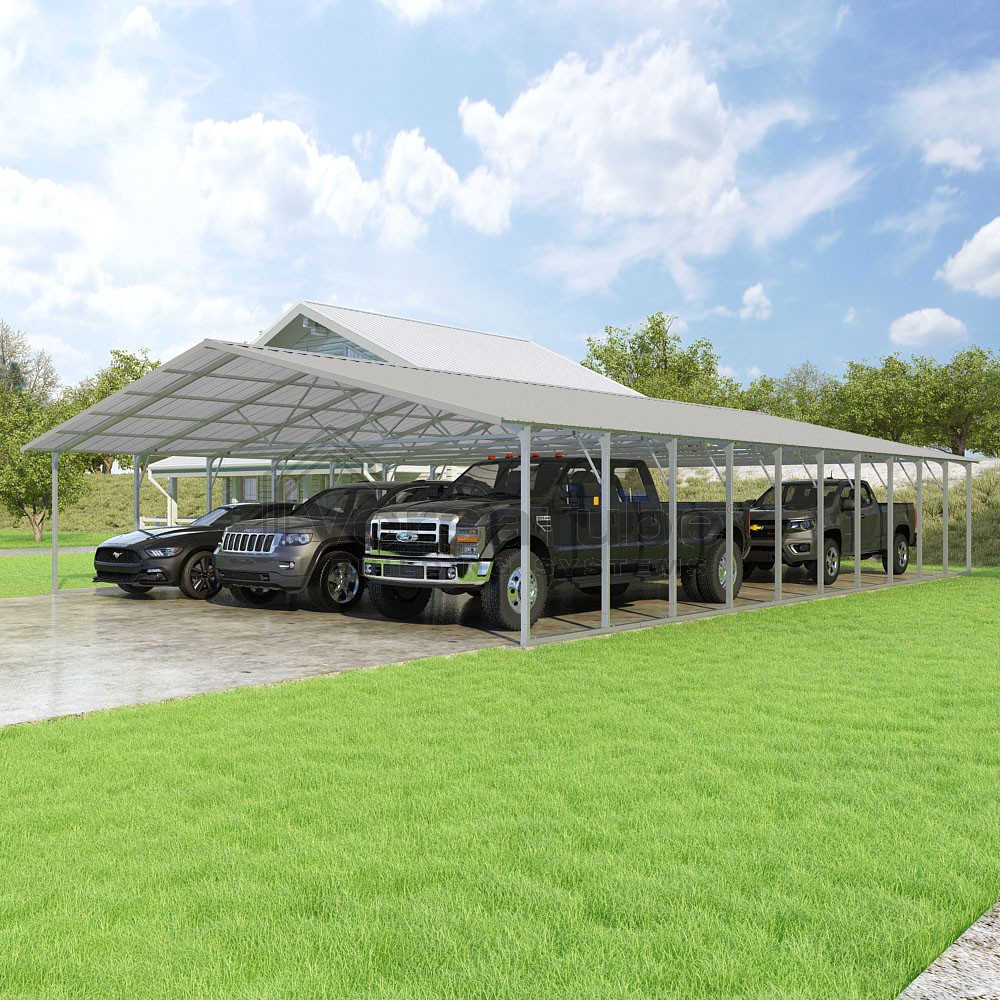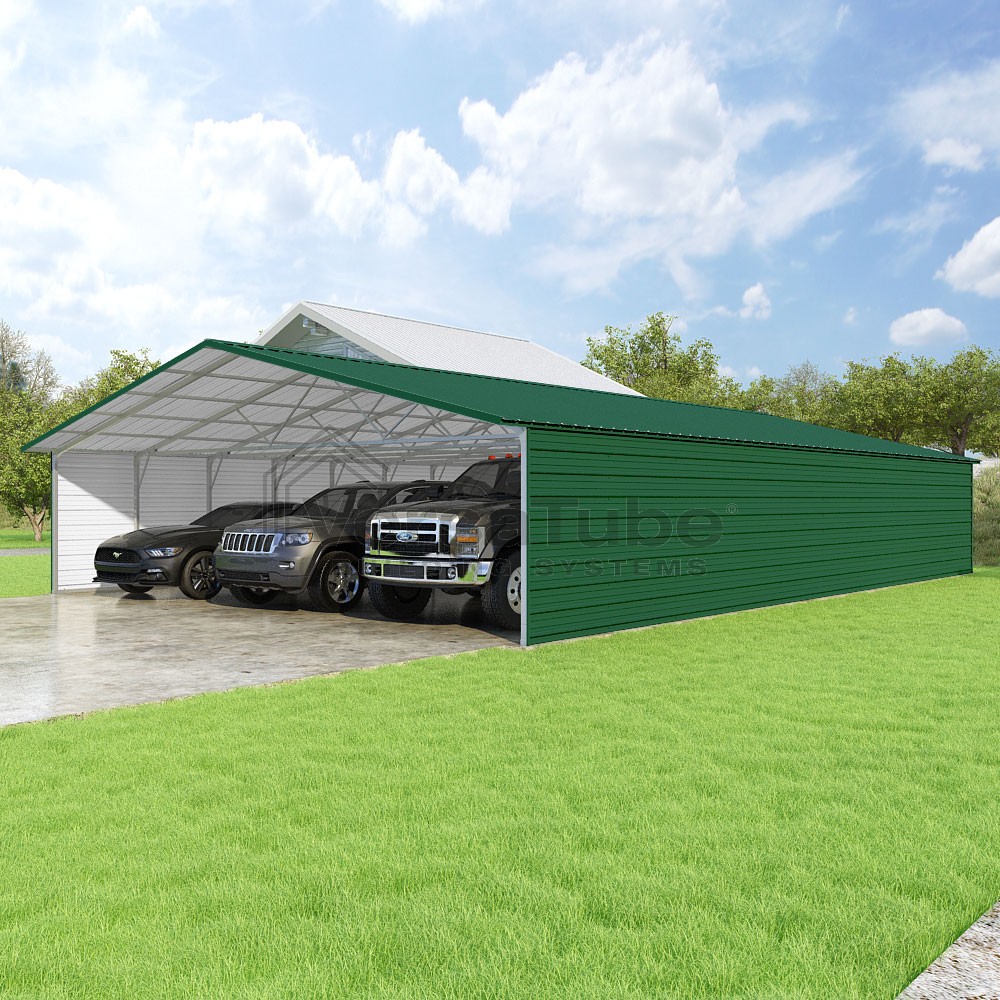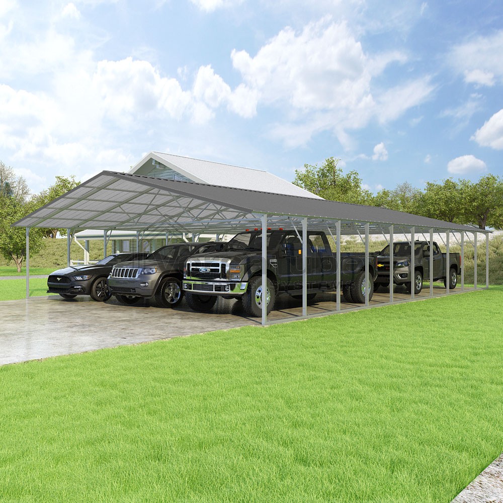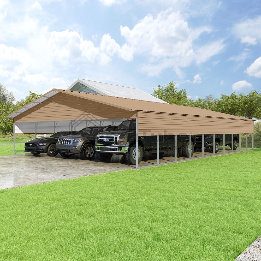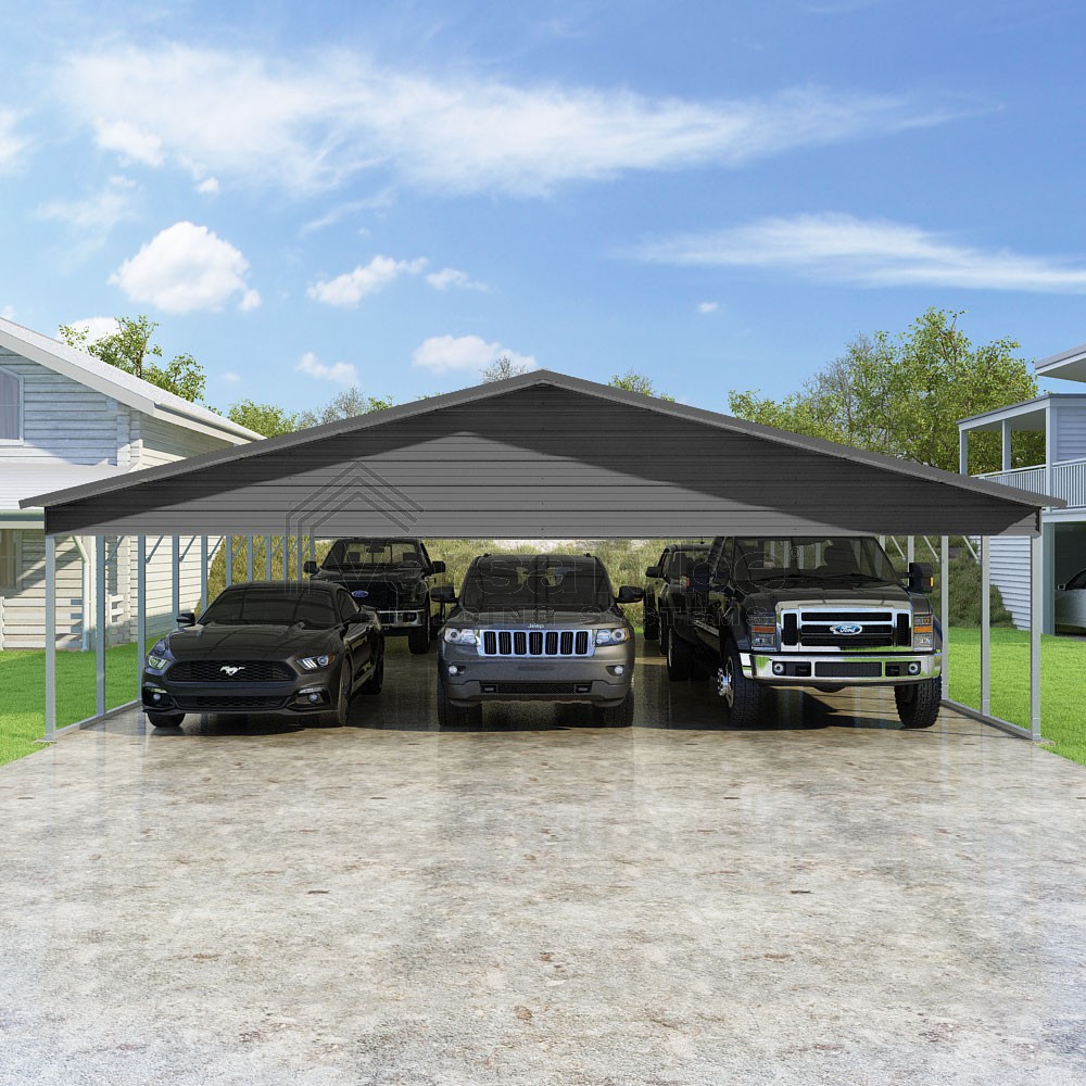 Pinnacle Series DIY carport kit features vertical sheet metal roof panels with ridge cap, gable and eave trim for an A-frame roof style and extended coverage on both ends.
