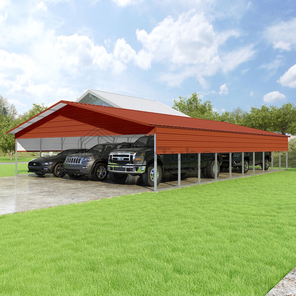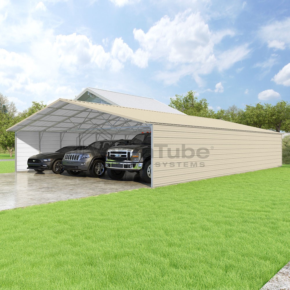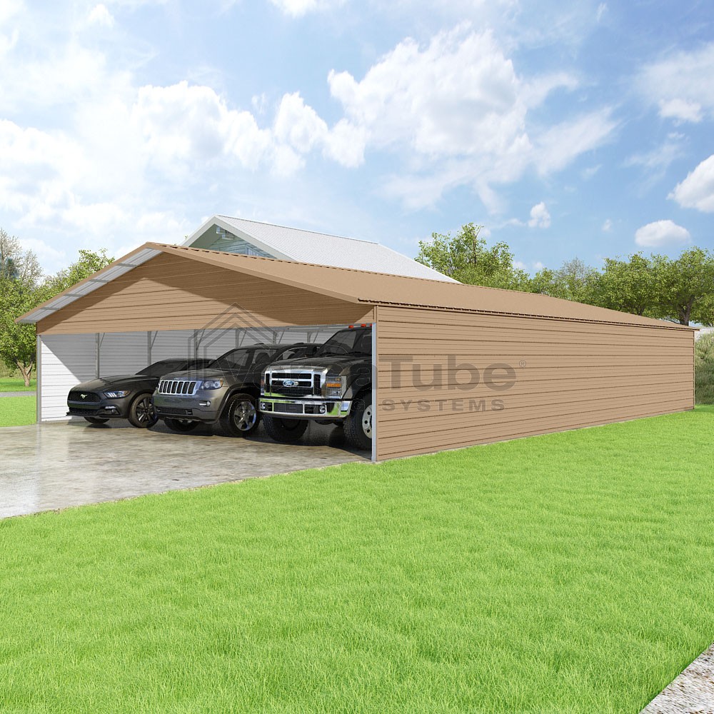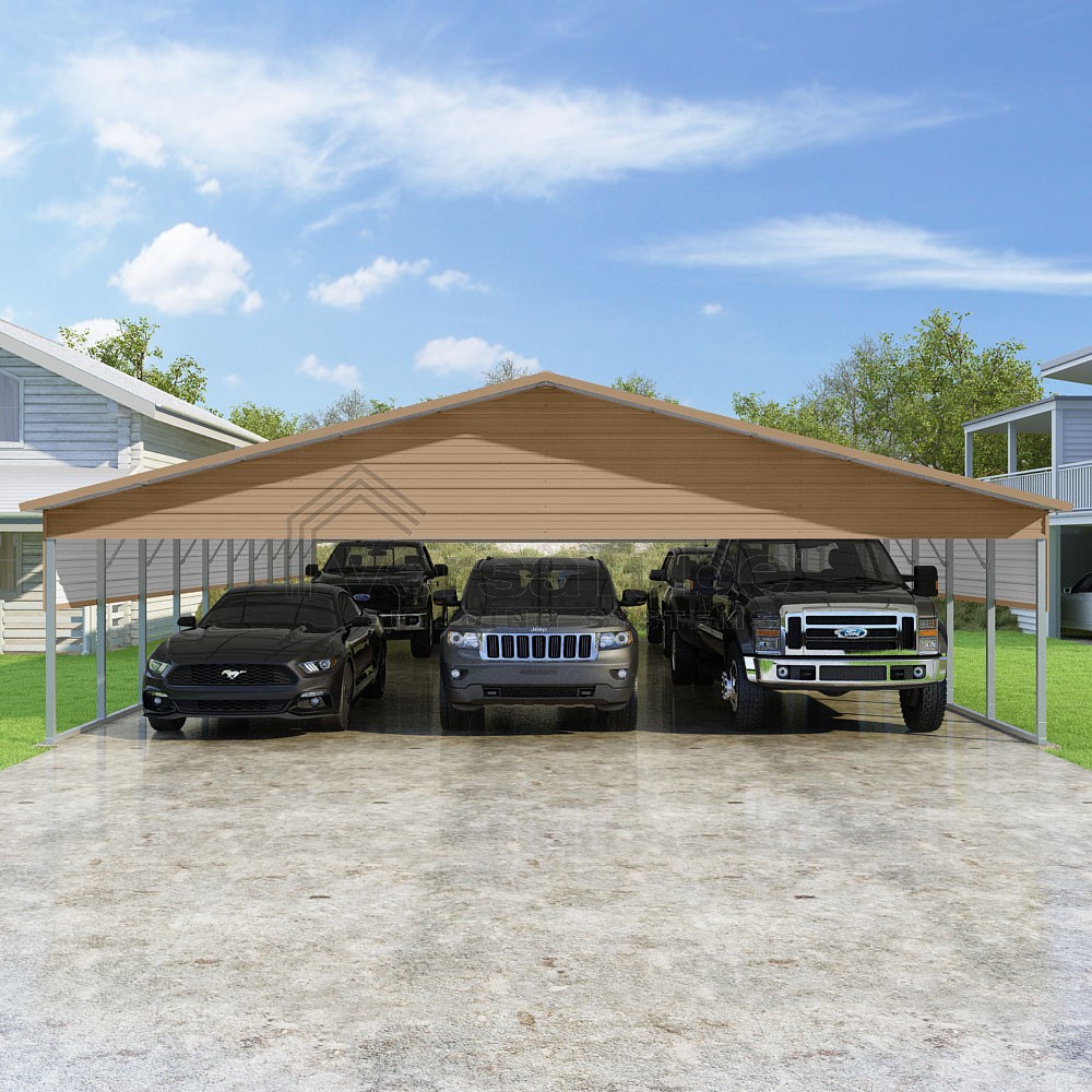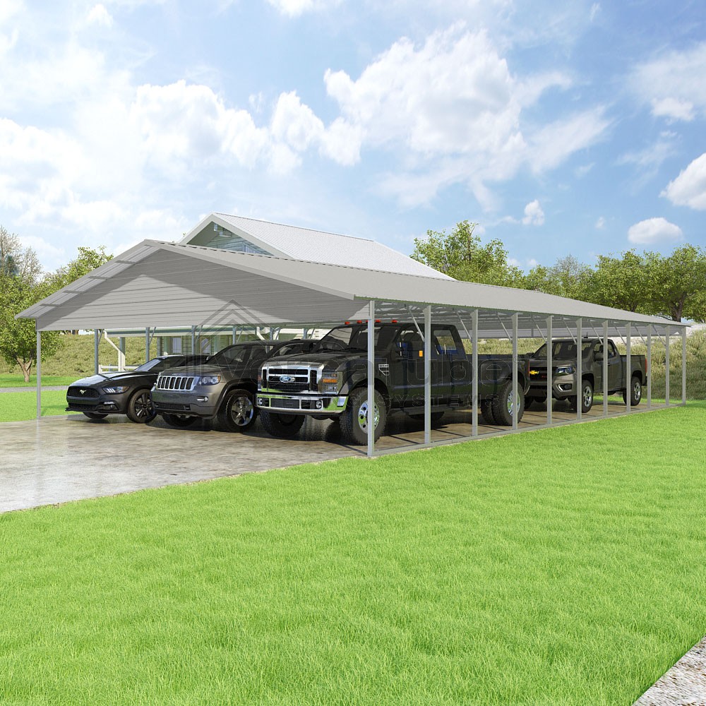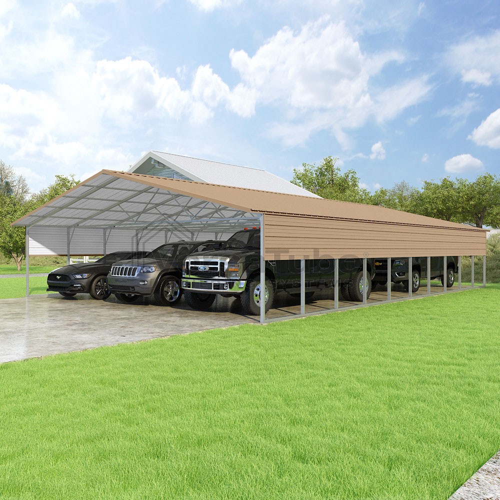 Pinnacle Series DIY carport kit features vertical sheet metal roof panels with ridge cap, gable and eave trim for an A-frame roof style and extended coverage on both ends.