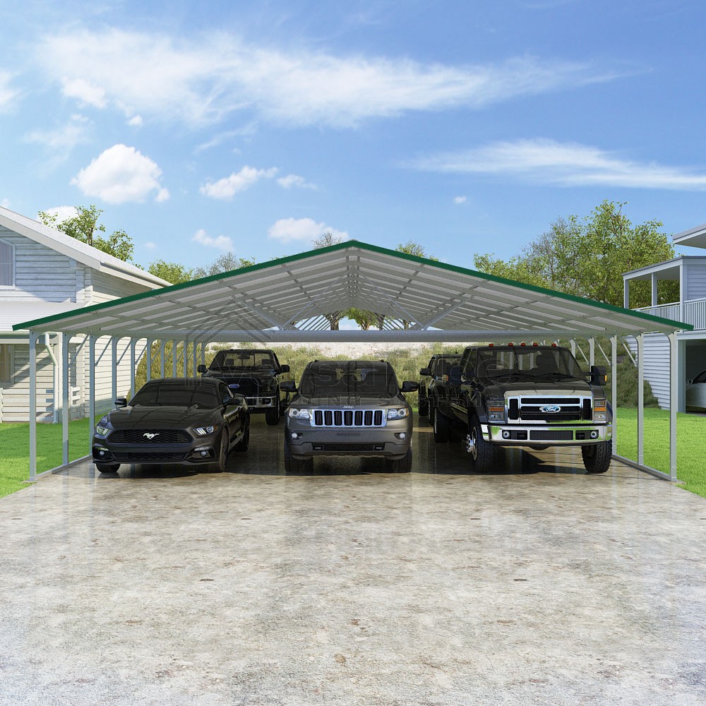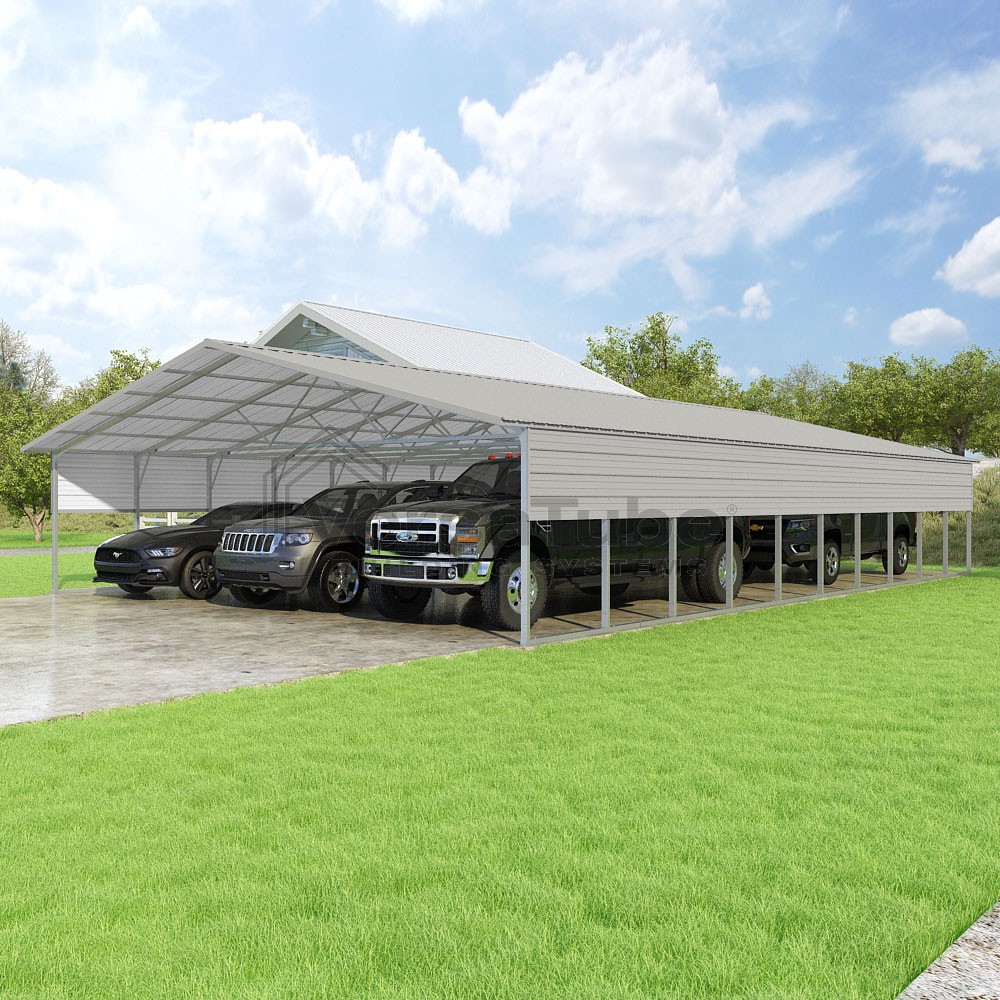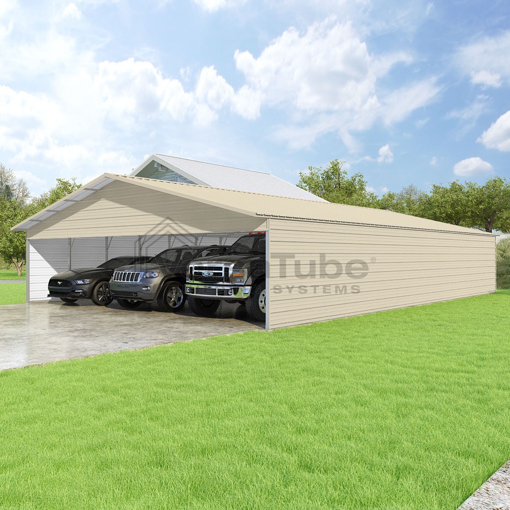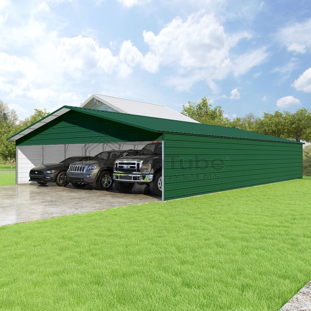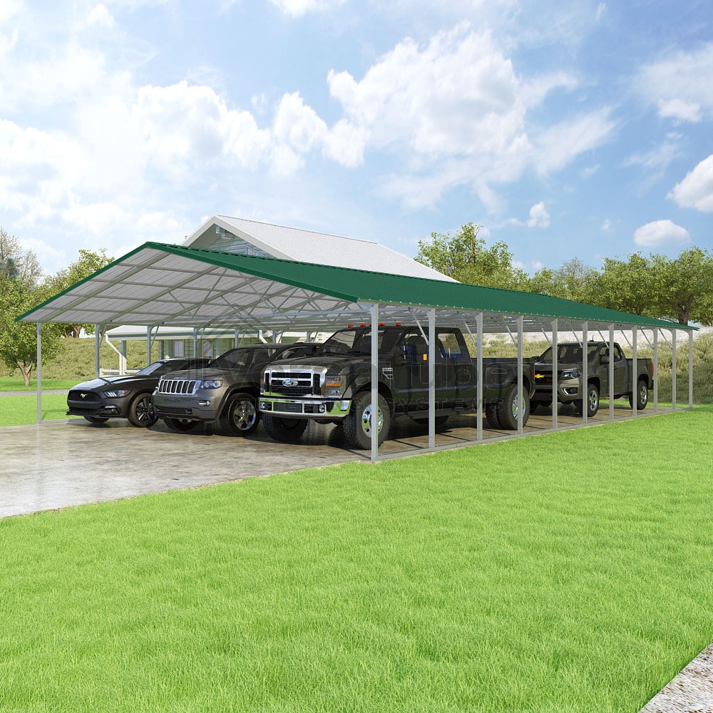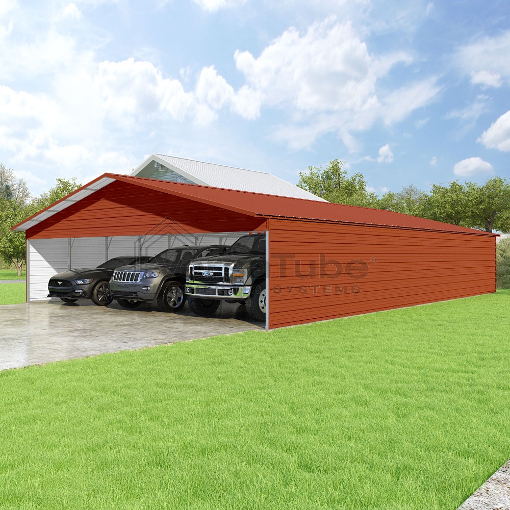 Pinnacle Series DIY carport kit features vertical sheet metal roof panels with ridge cap, gable and eave trim for an A-frame roof style and extended coverage on both ends.