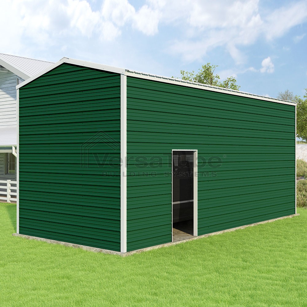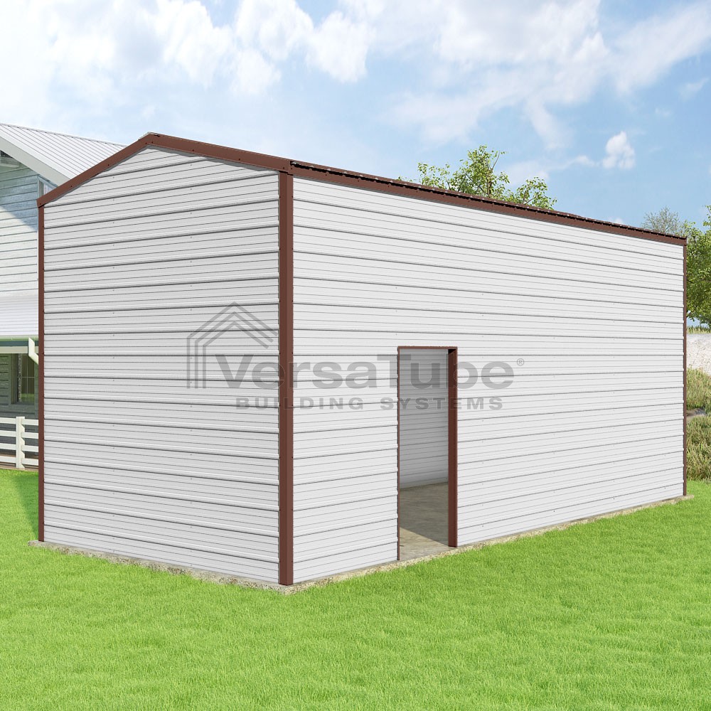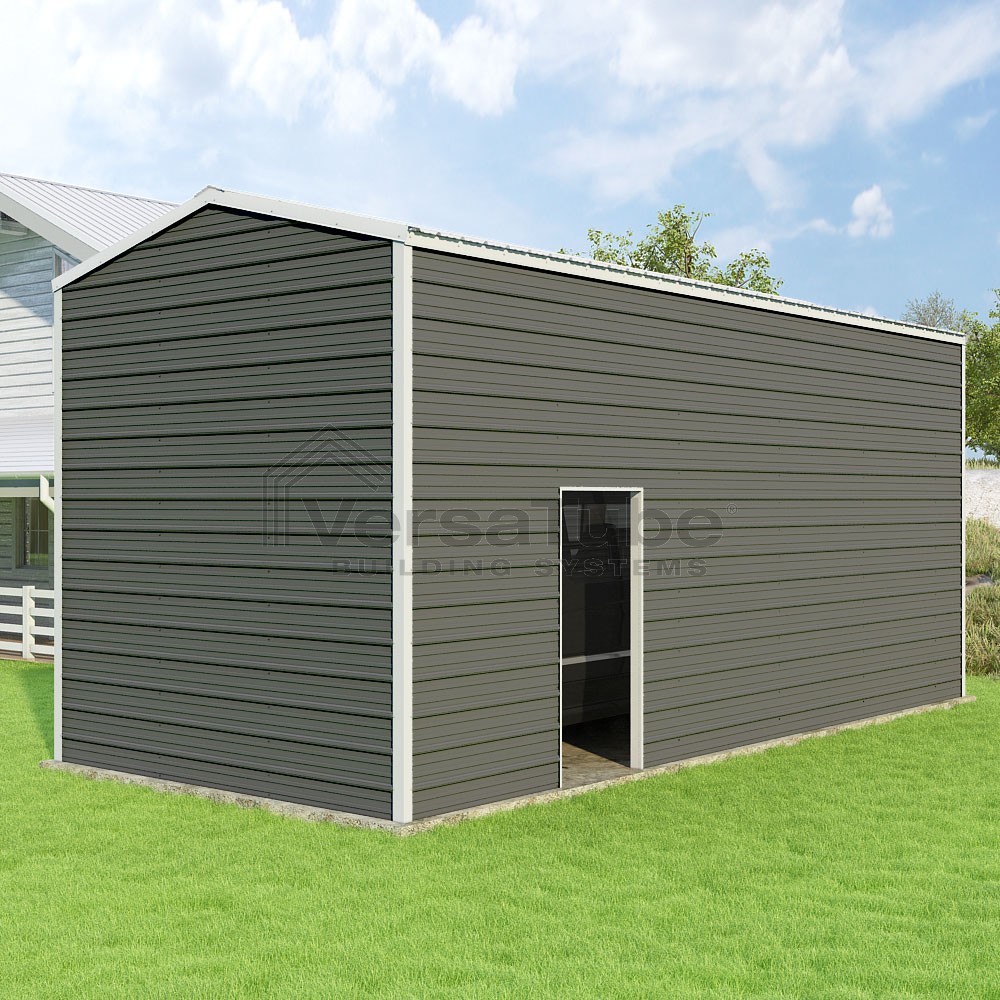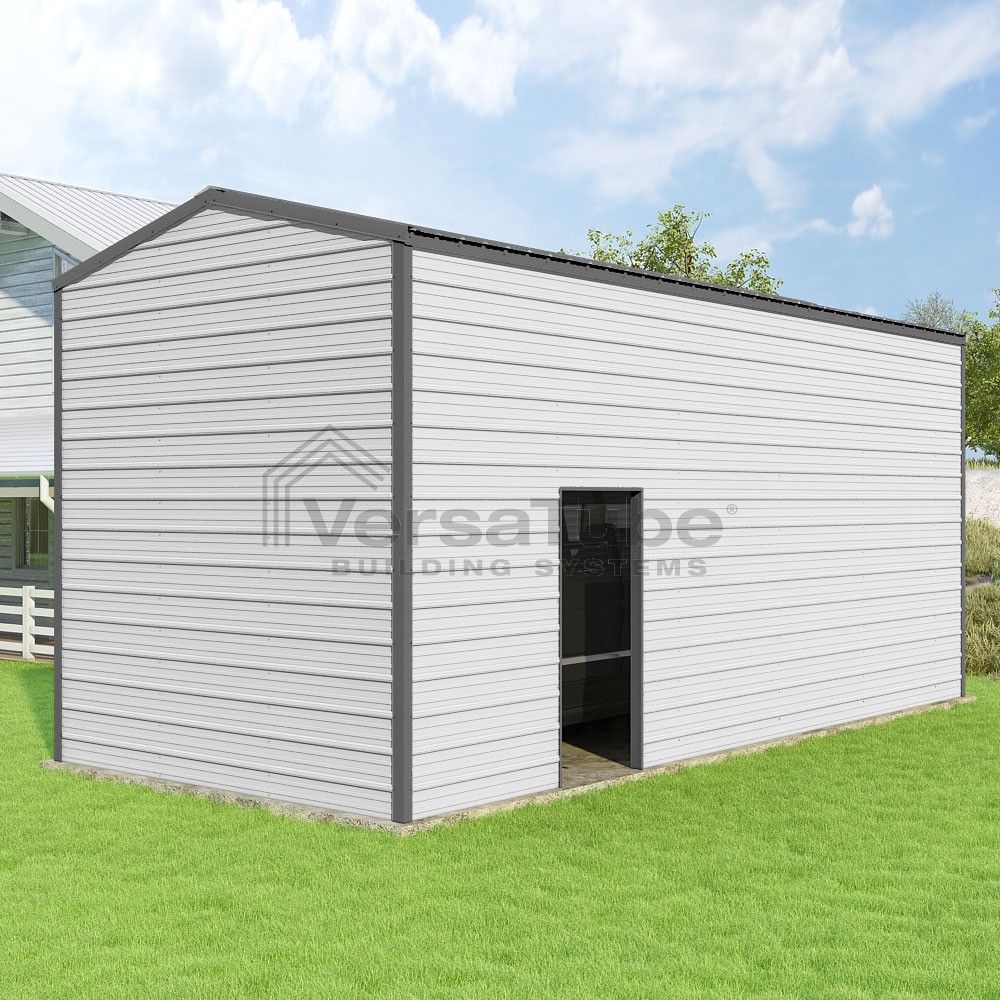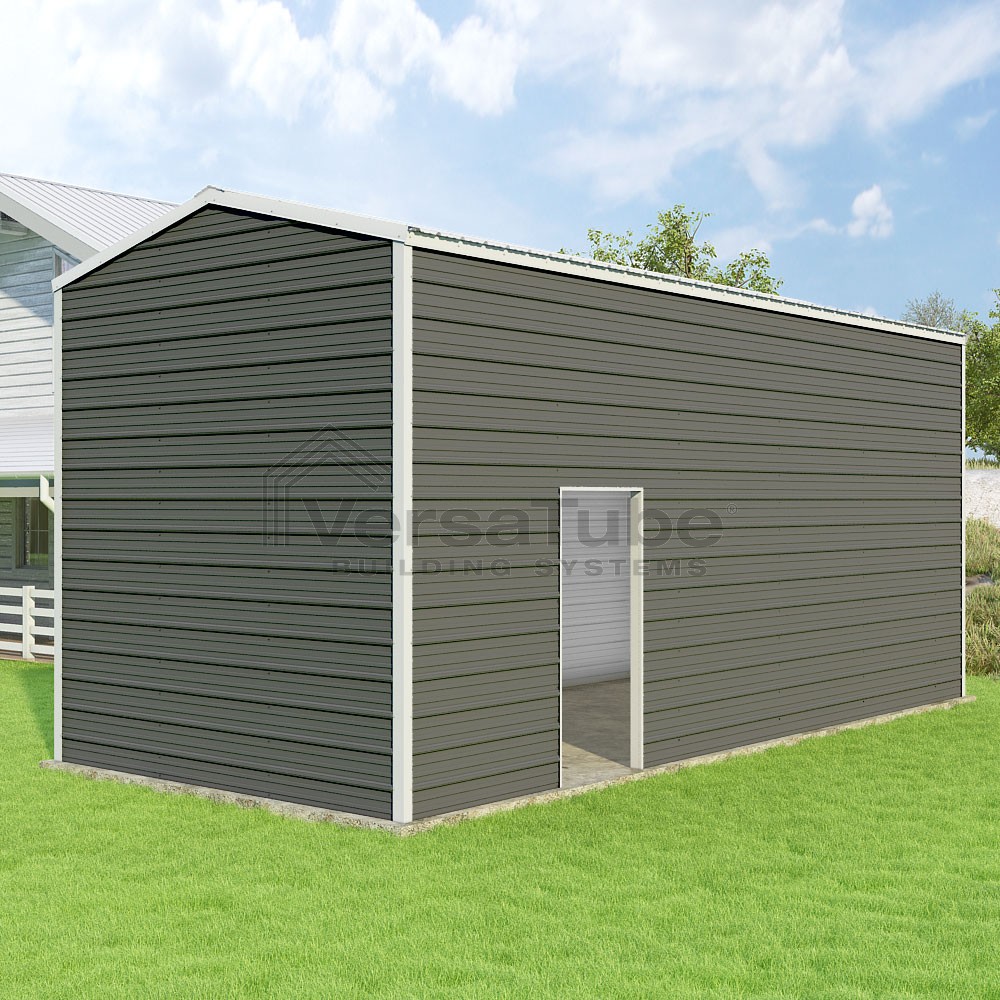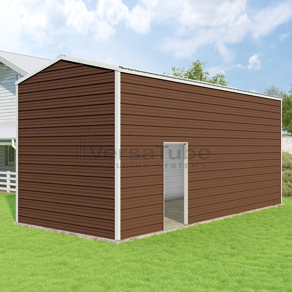 Frontier Series DIY garage kit features vertical sheet metal roof panels with horizontal siding panels..