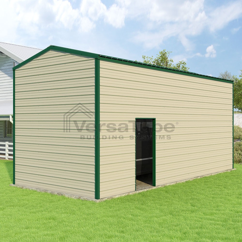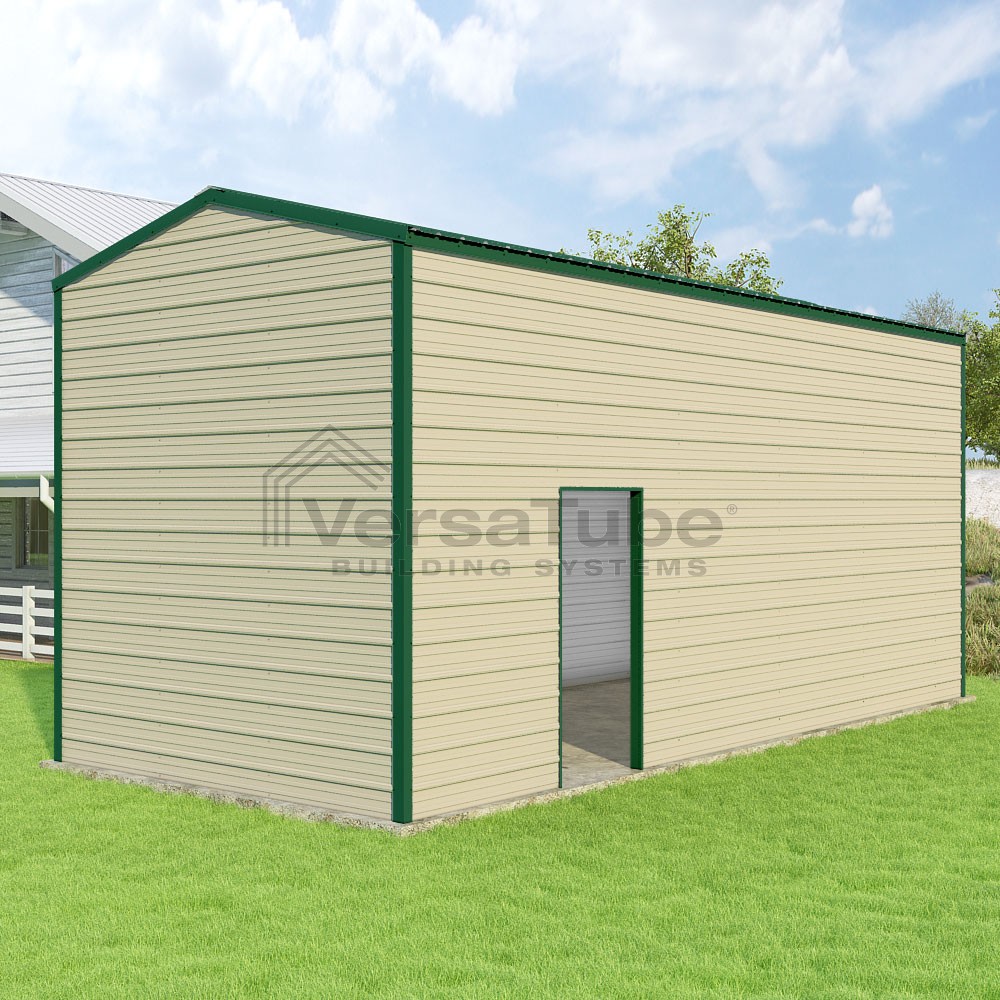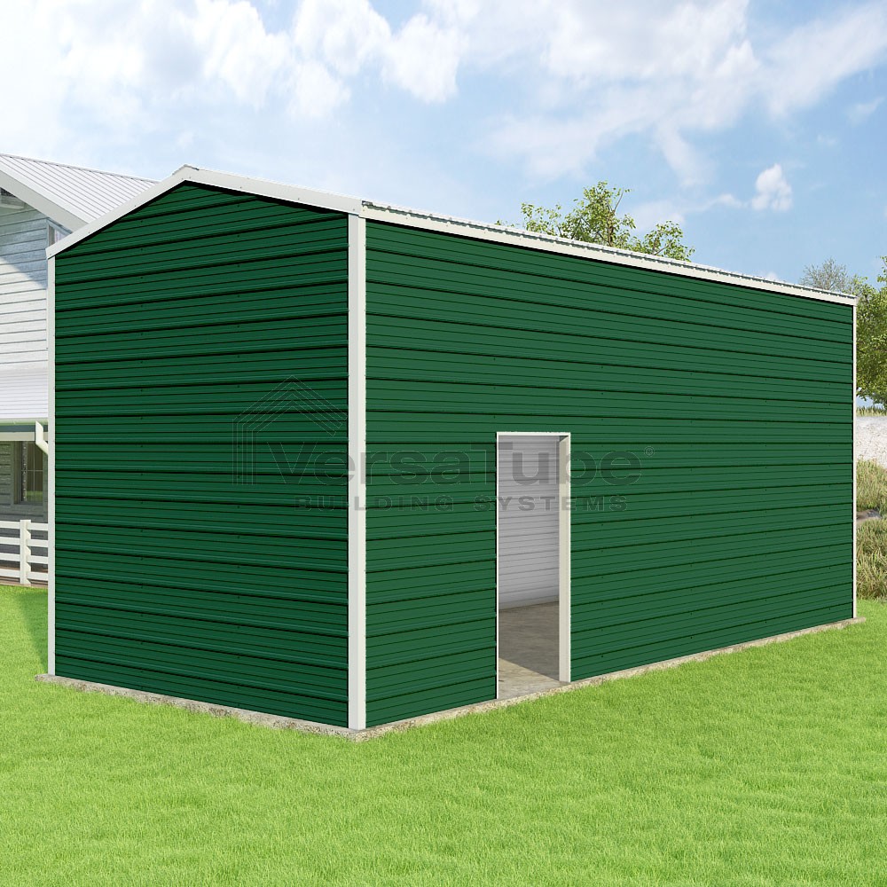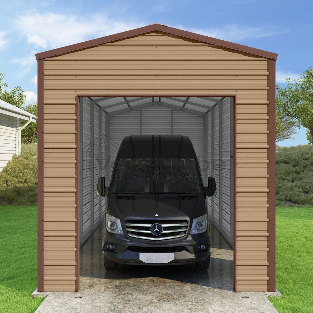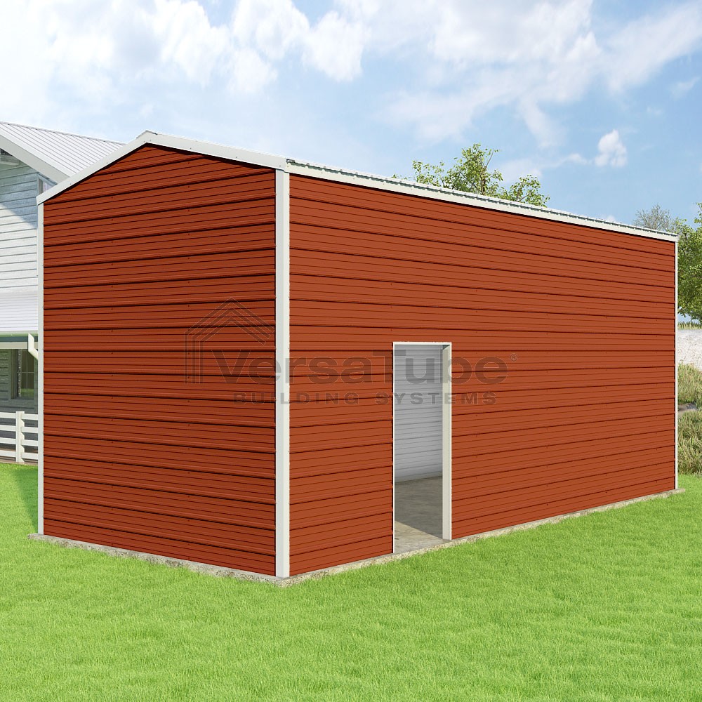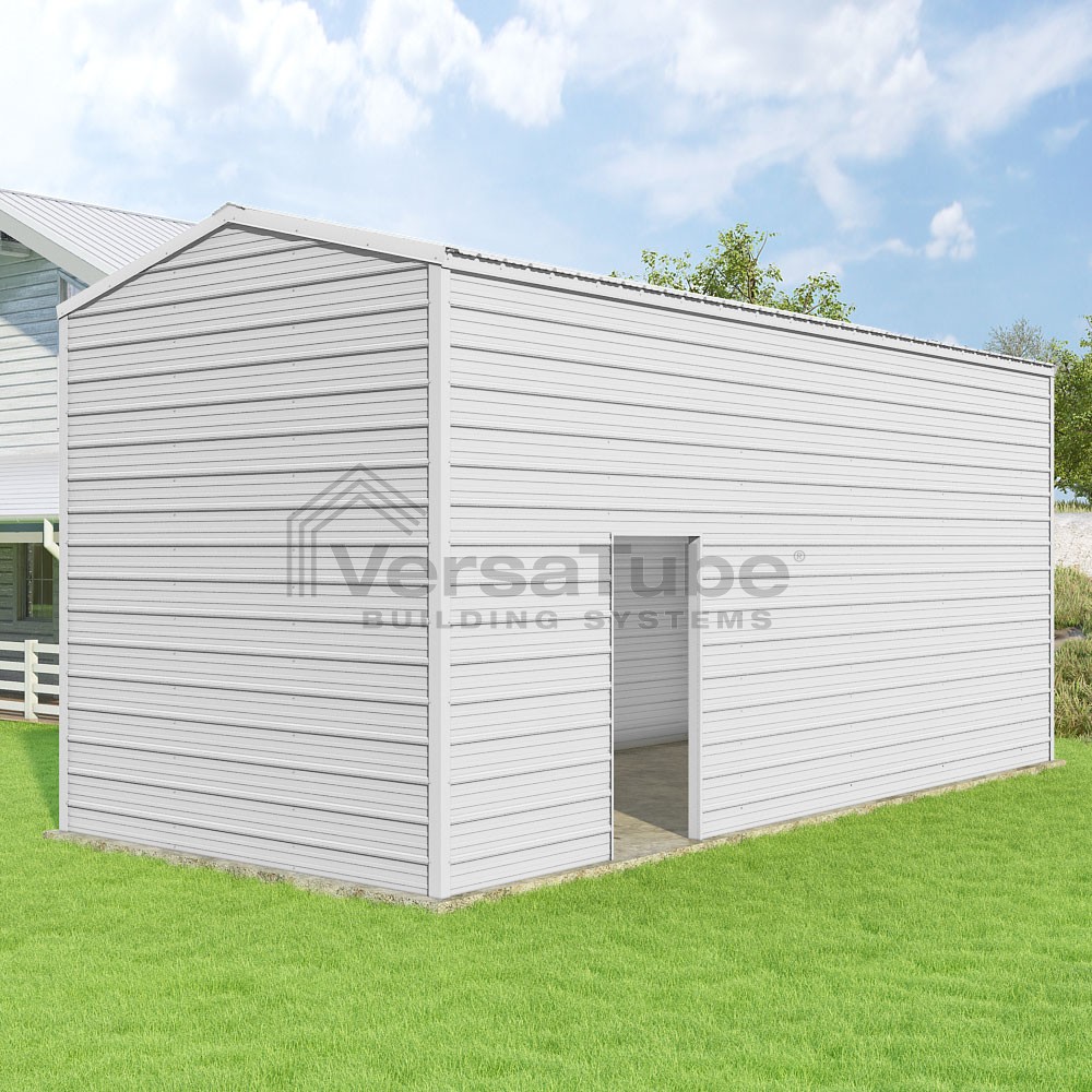 Frontier Series DIY garage kit features vertical sheet metal roof panels with horizontal siding panels..