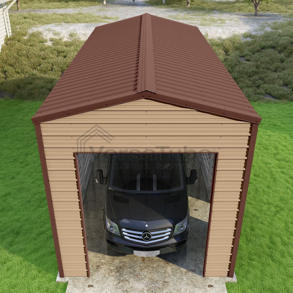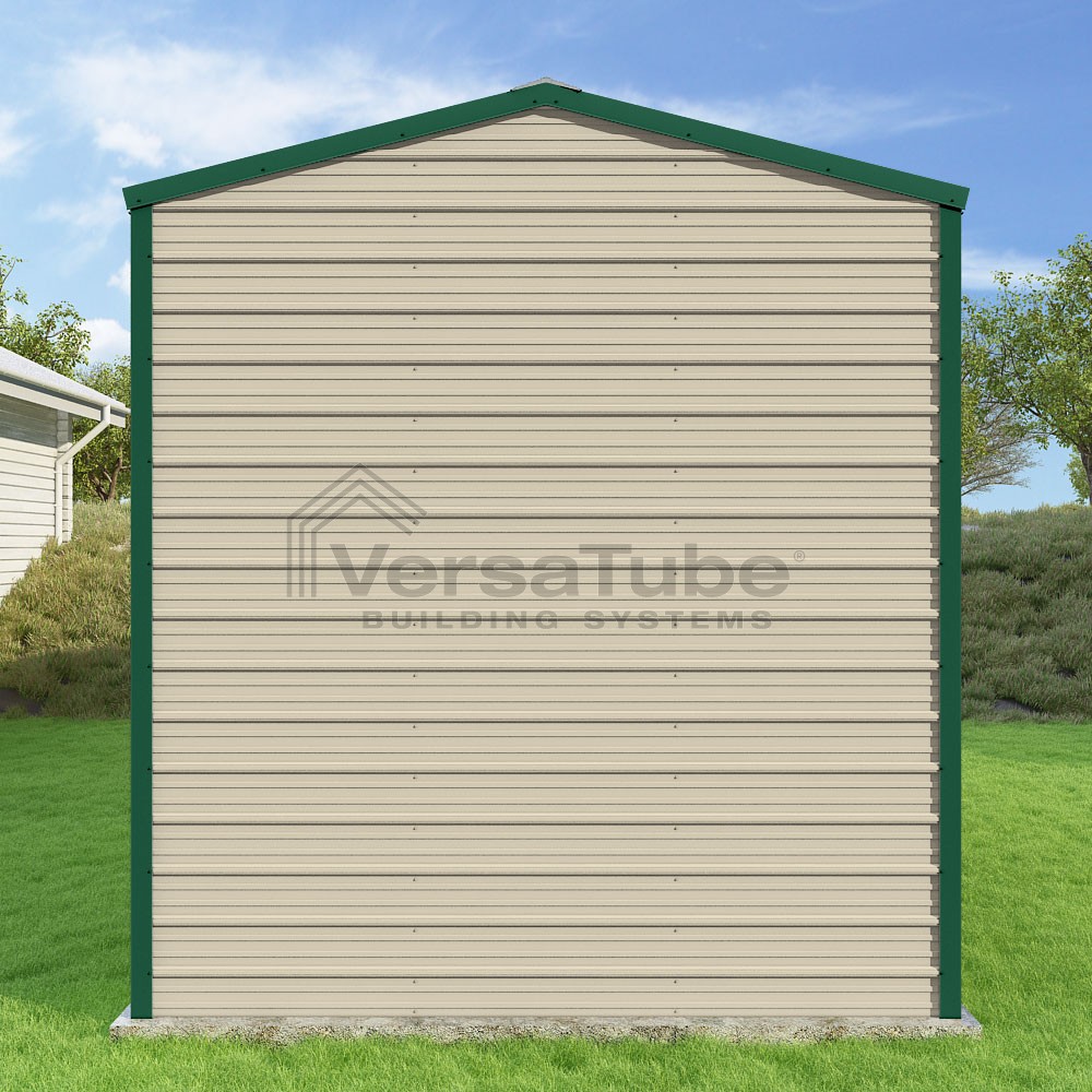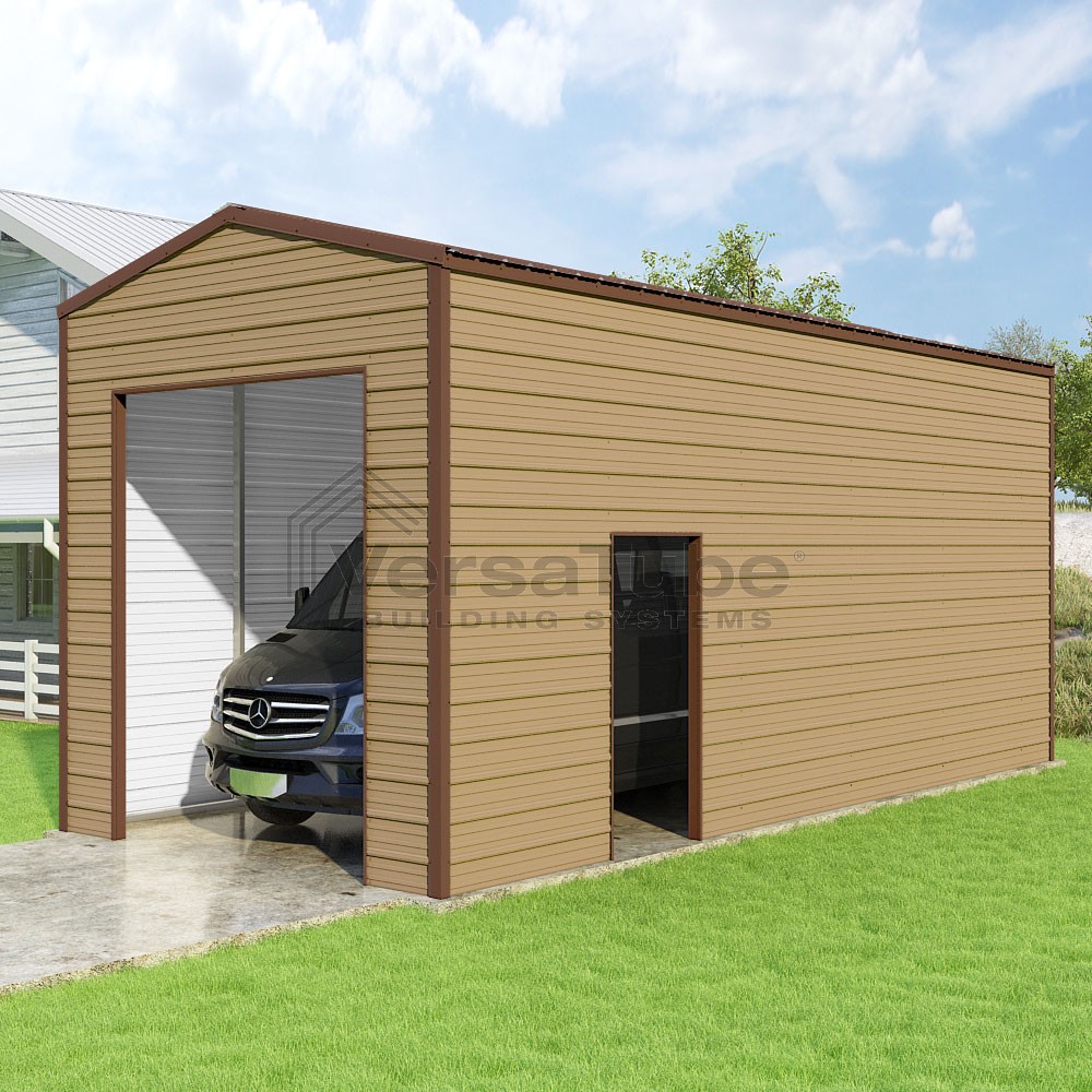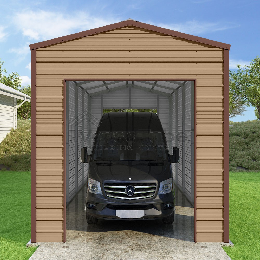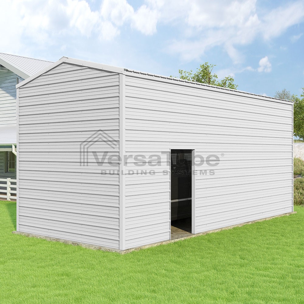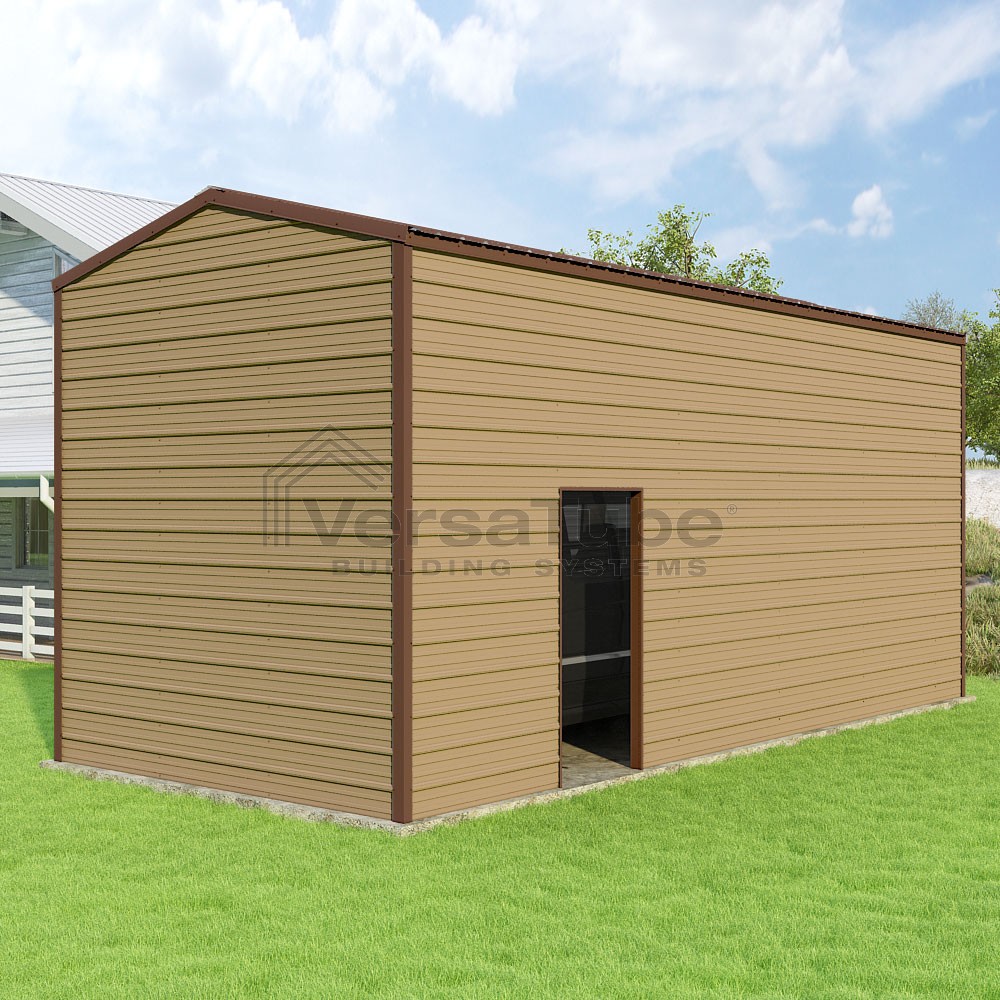 Frontier Series DIY garage kit features vertical sheet metal roof panels with horizontal siding panels..