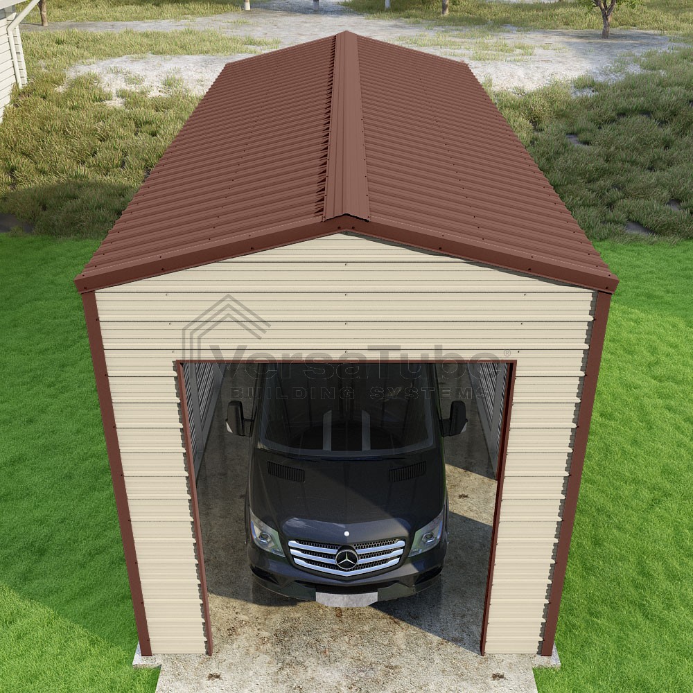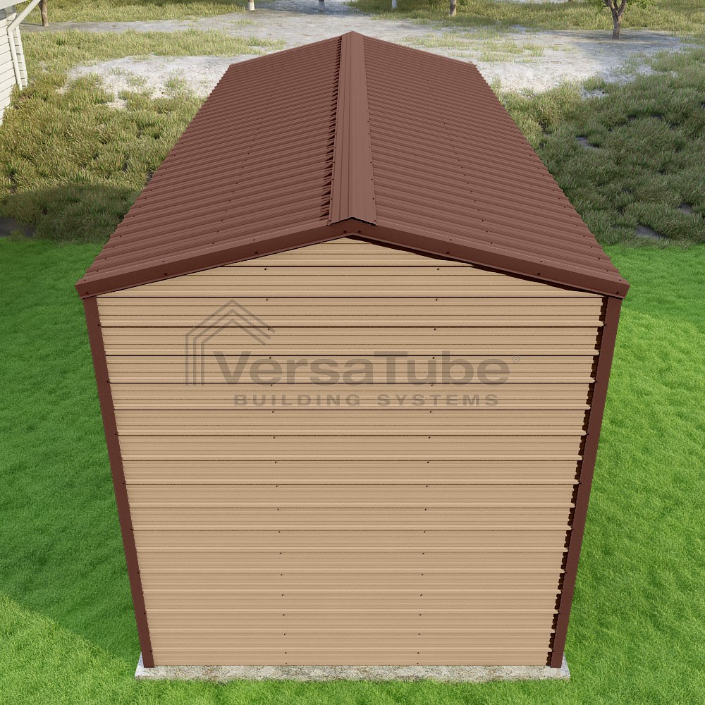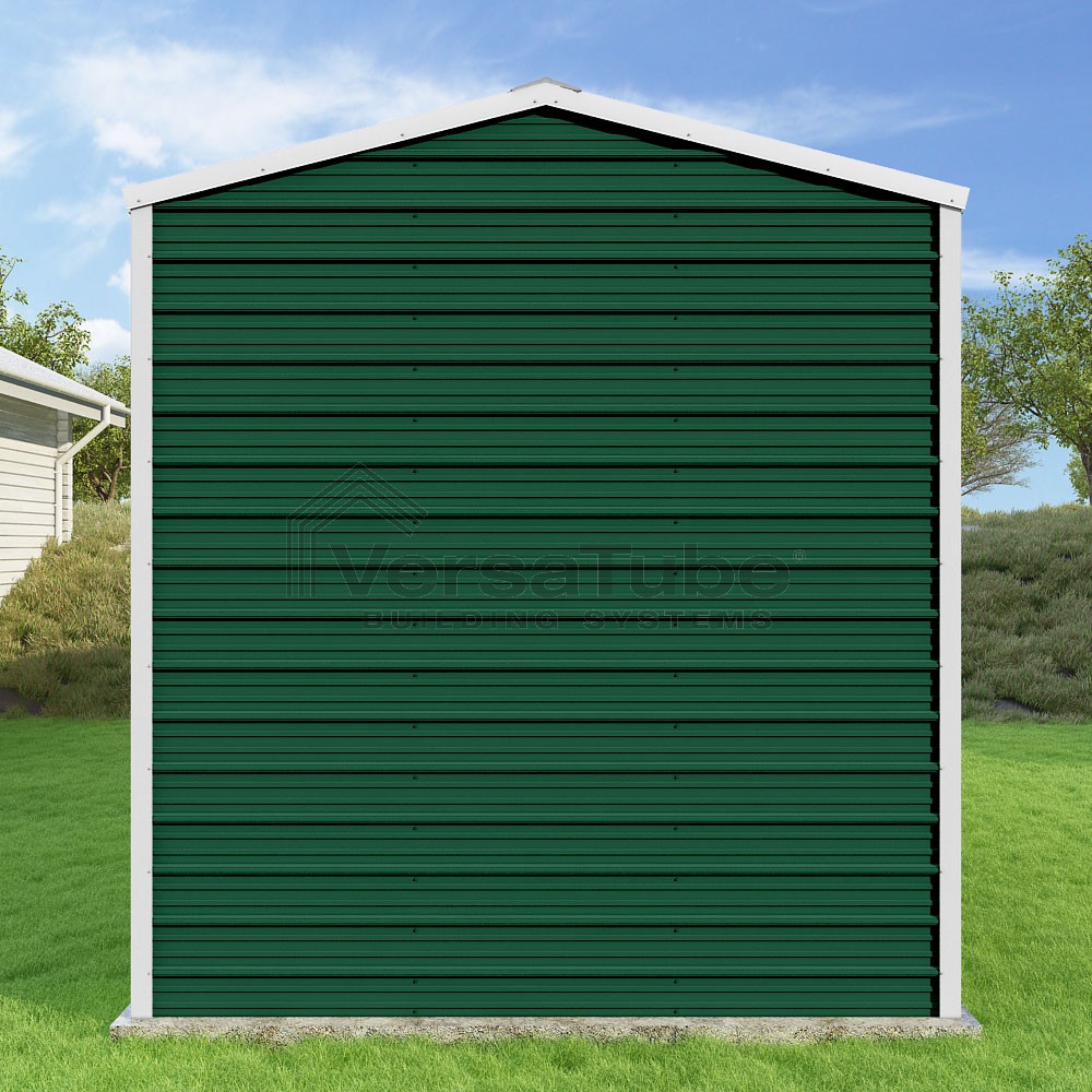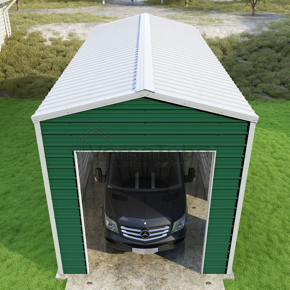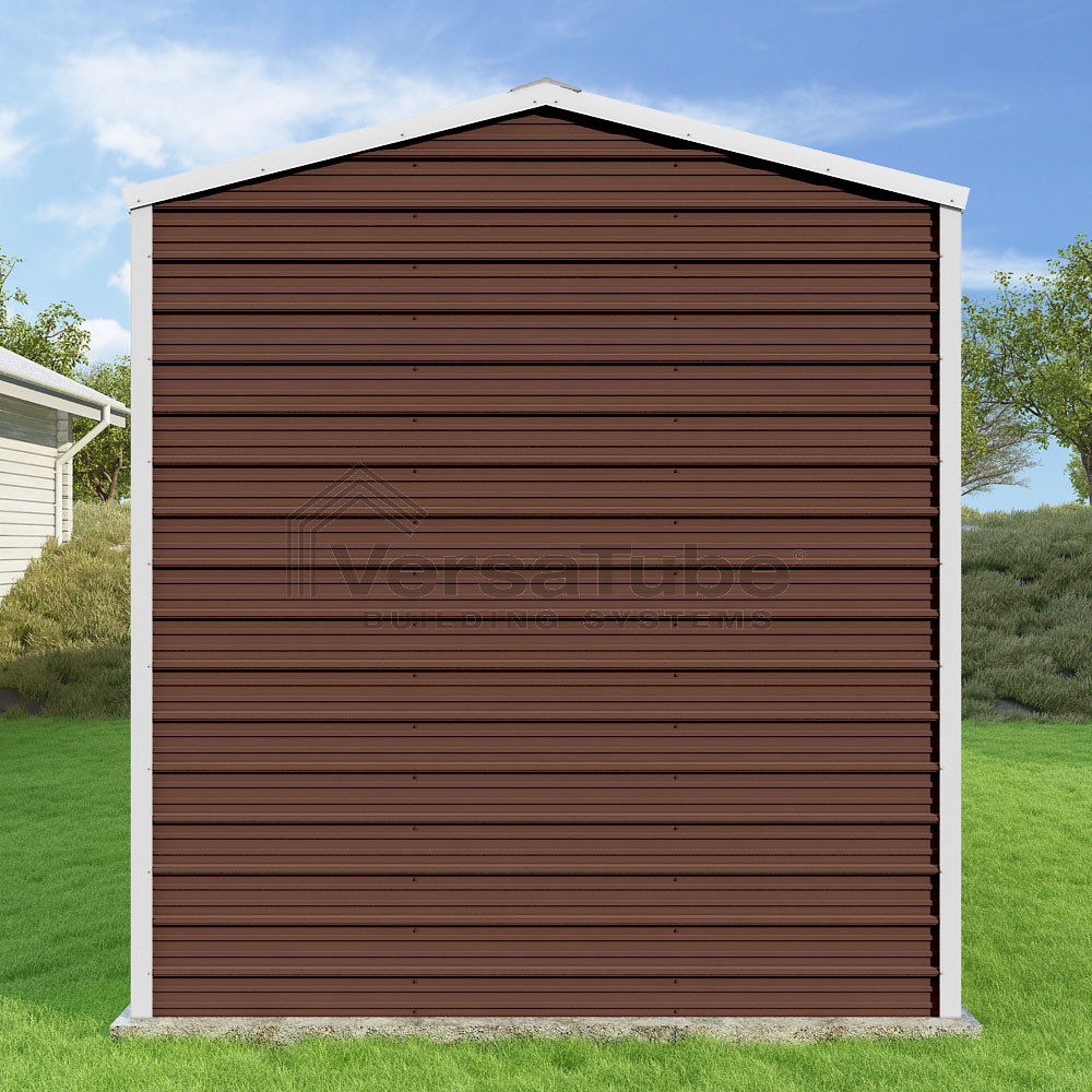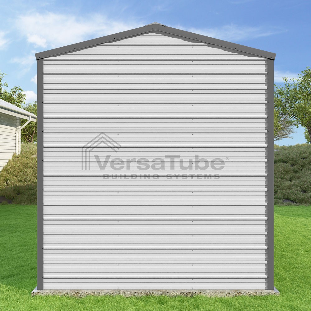 Frontier Series DIY garage kit features vertical sheet metal roof panels with horizontal siding panels..