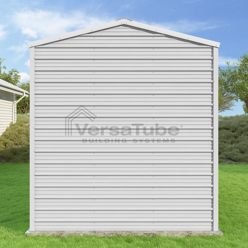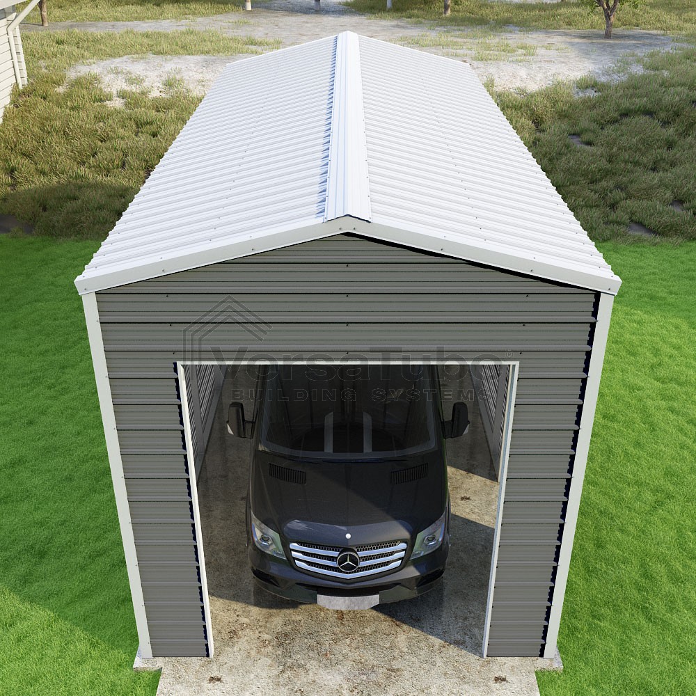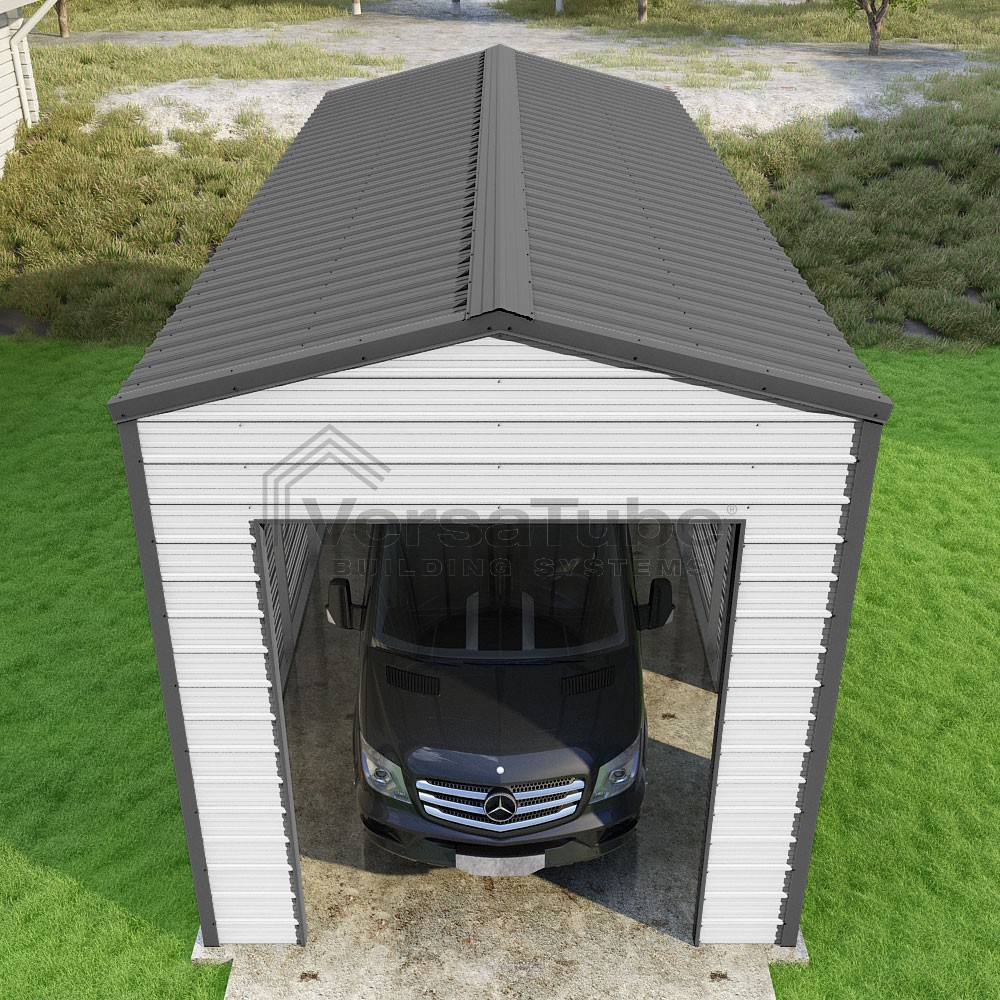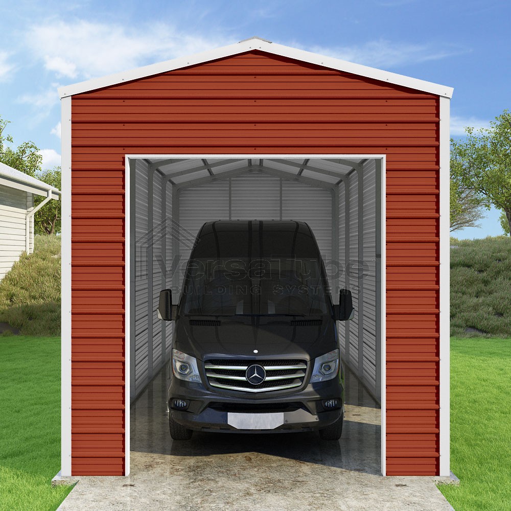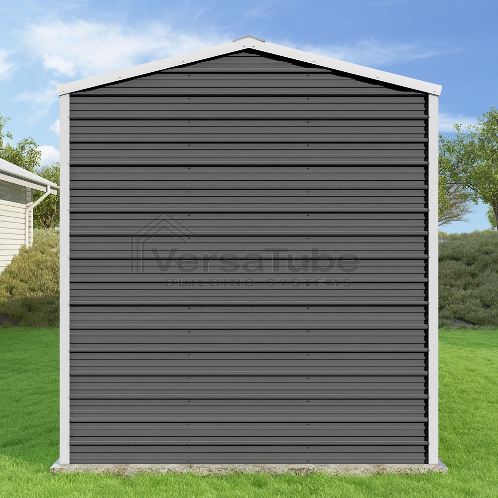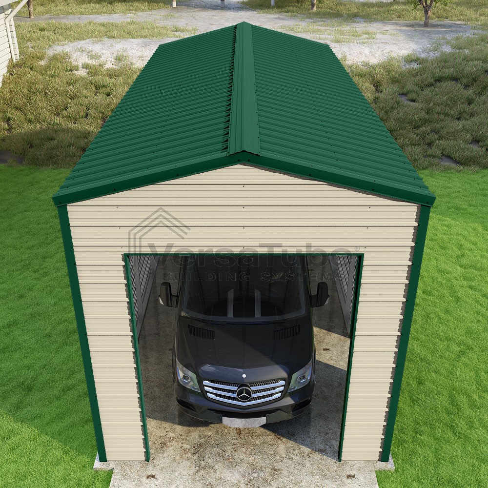 Frontier Series DIY garage kit features vertical sheet metal roof panels with horizontal siding panels..