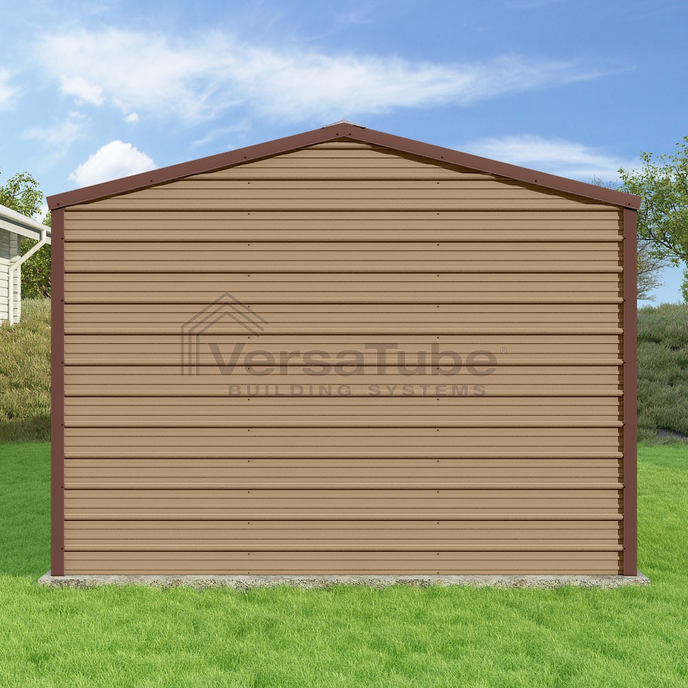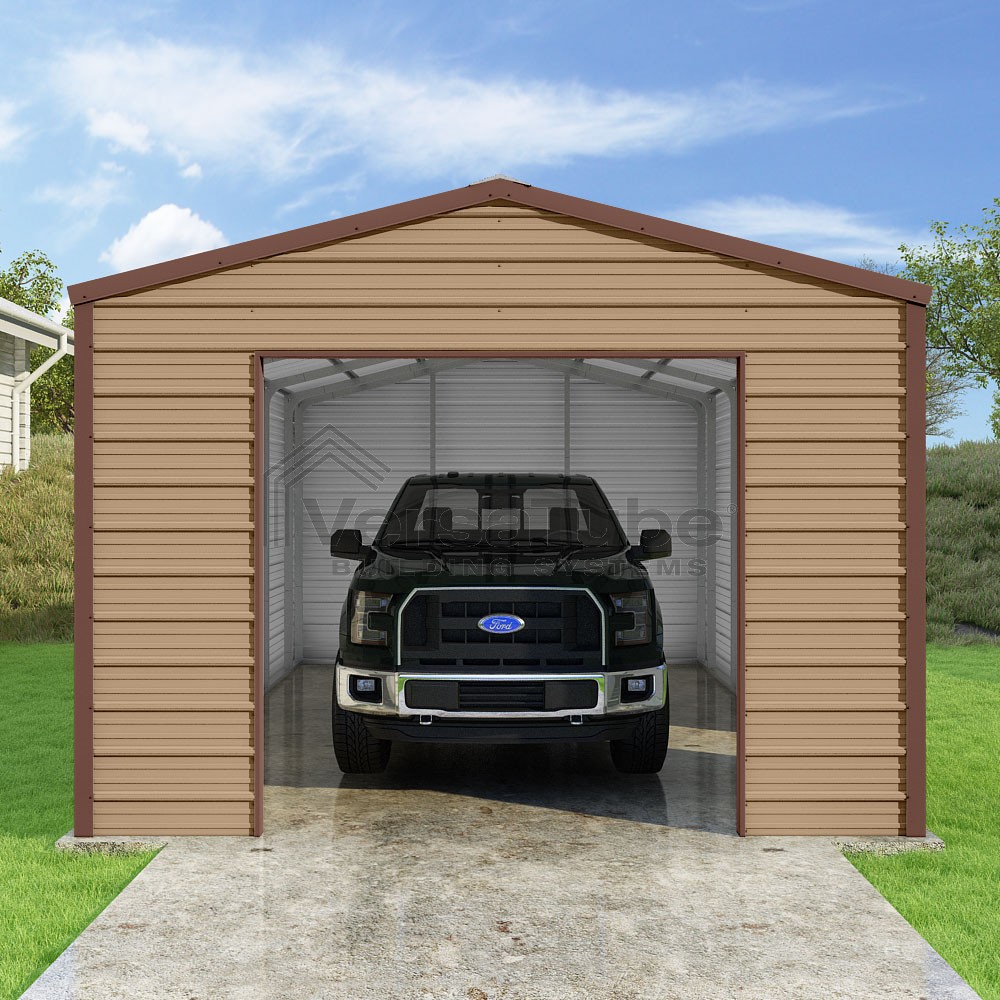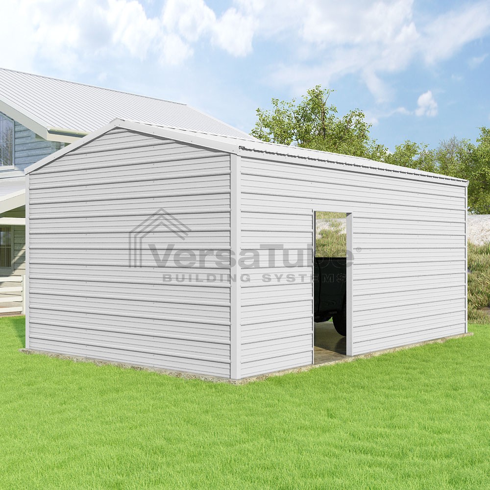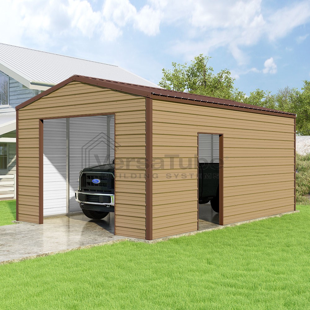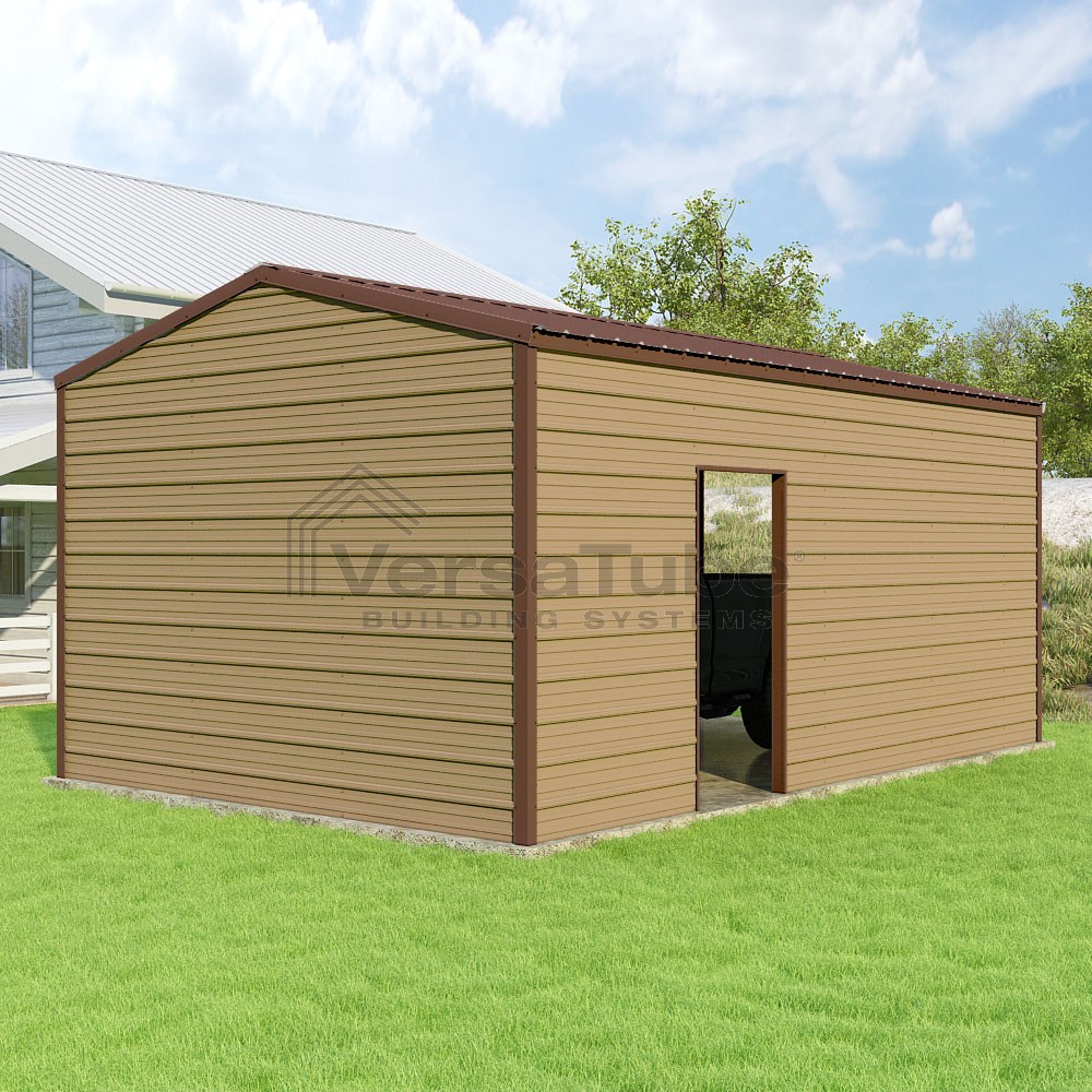 Frontier Series DIY garage kit features vertical sheet metal roof panels with horizontal siding panels..