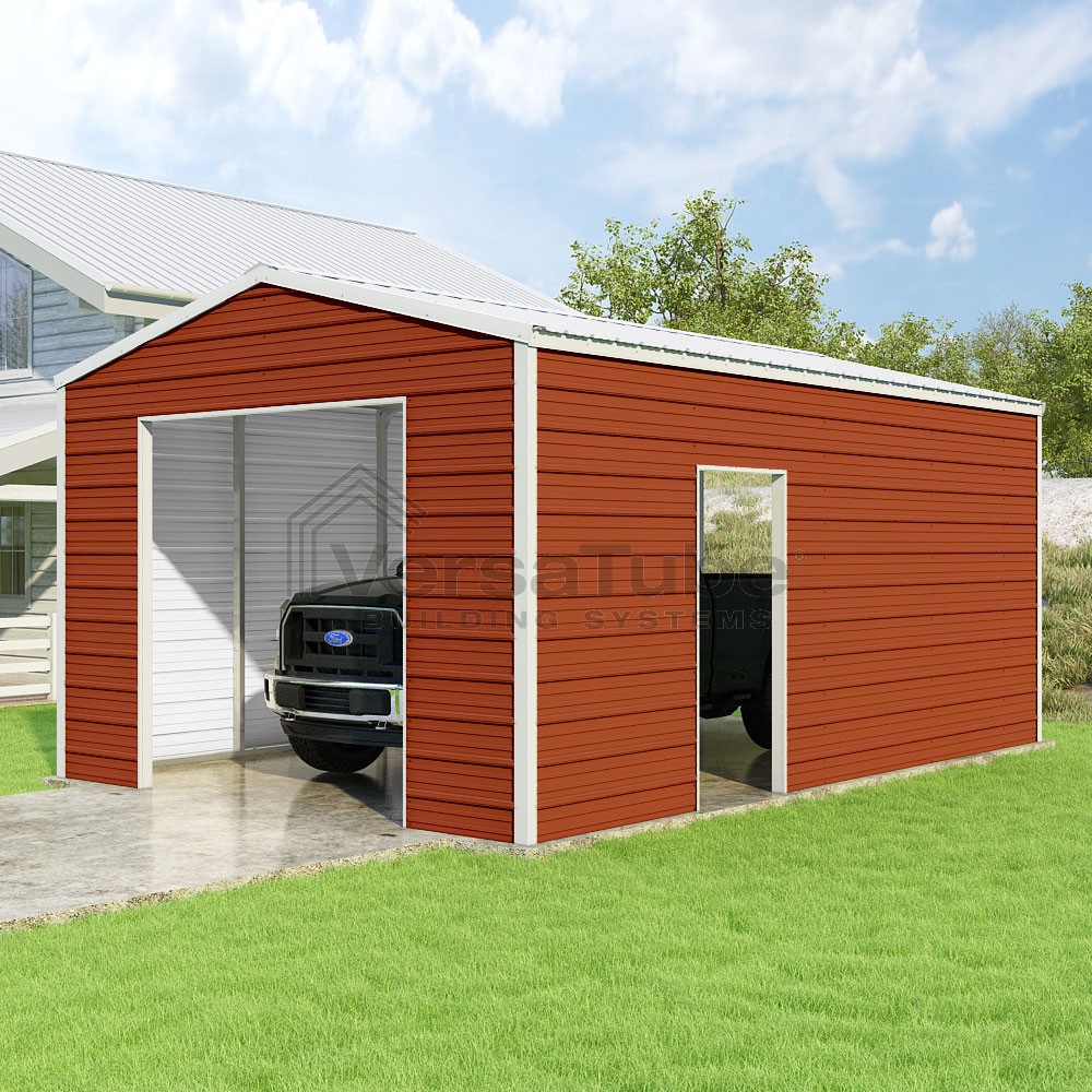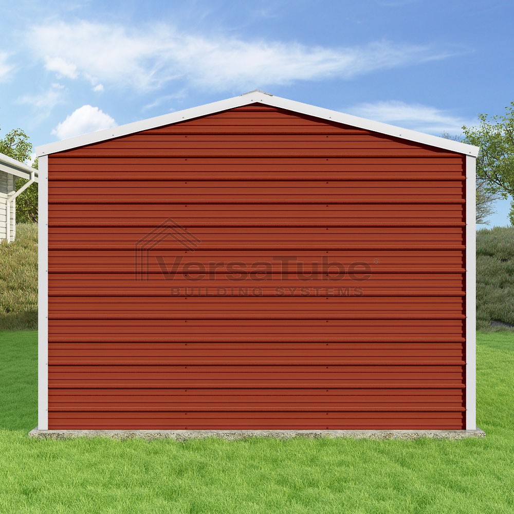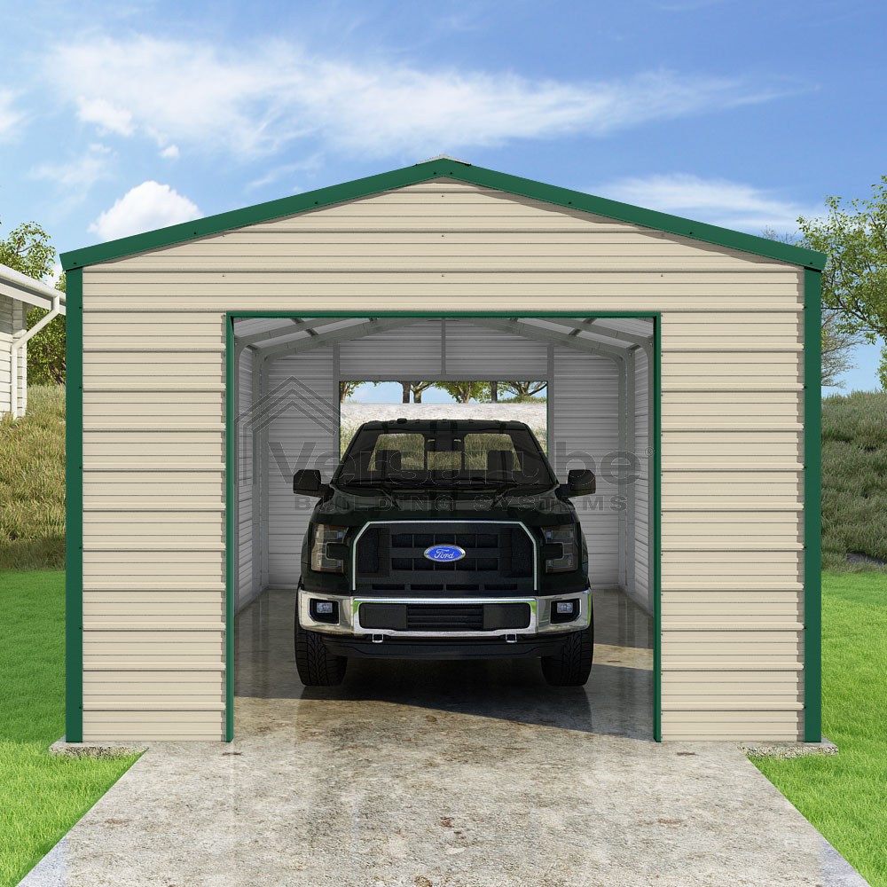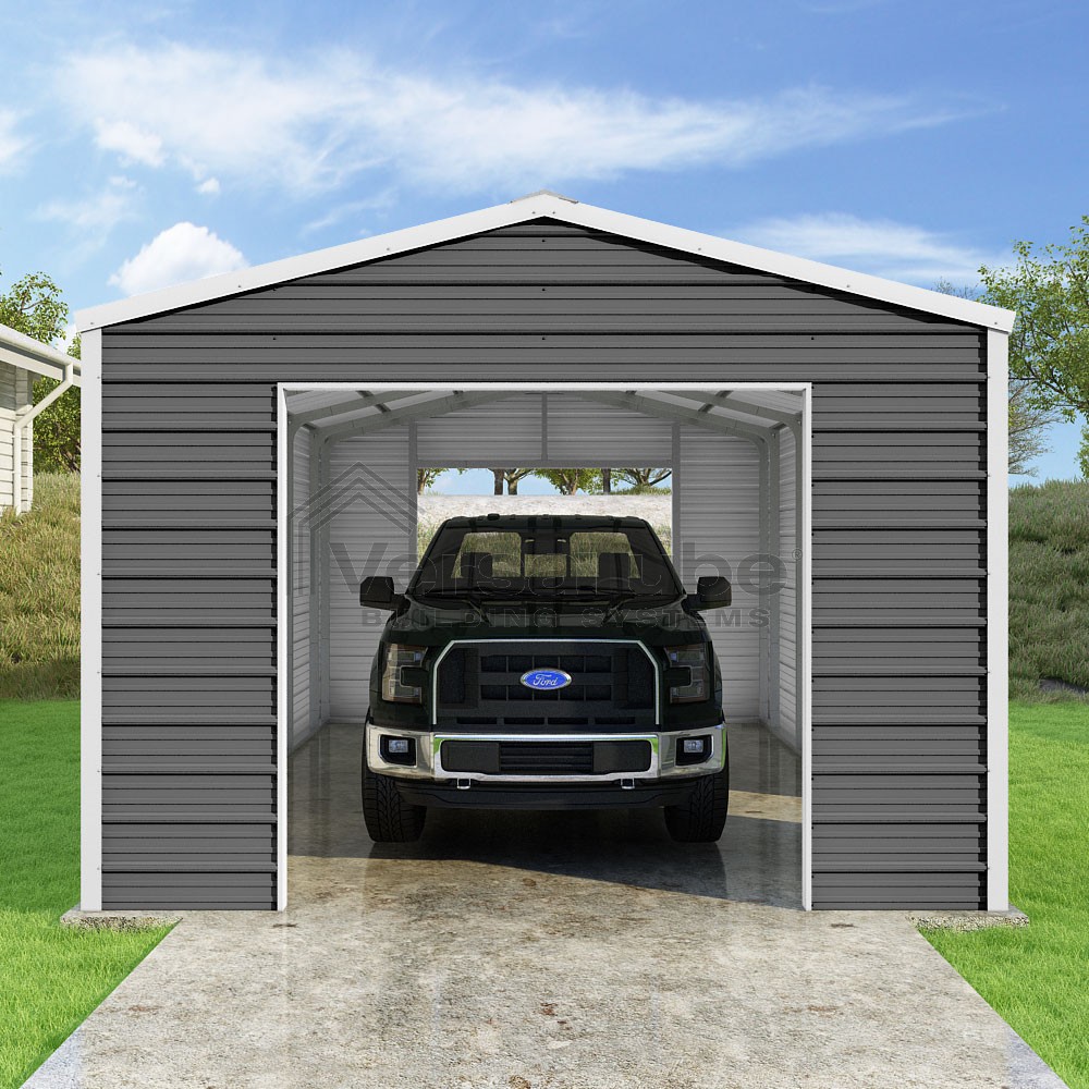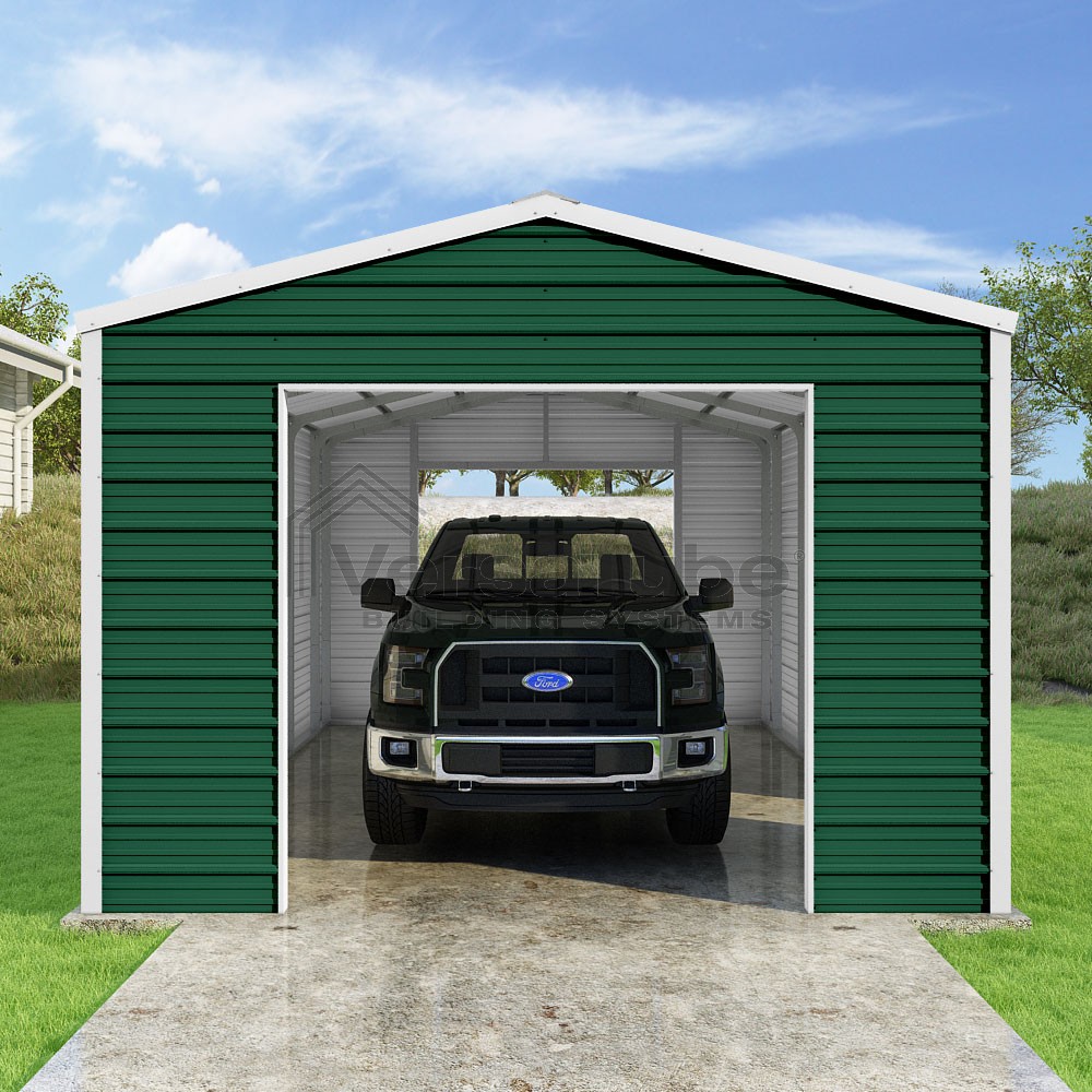 Frontier Series DIY garage kit features vertical sheet metal roof panels with horizontal siding panels..