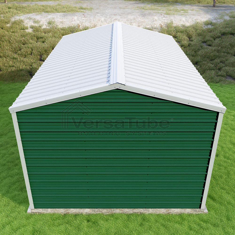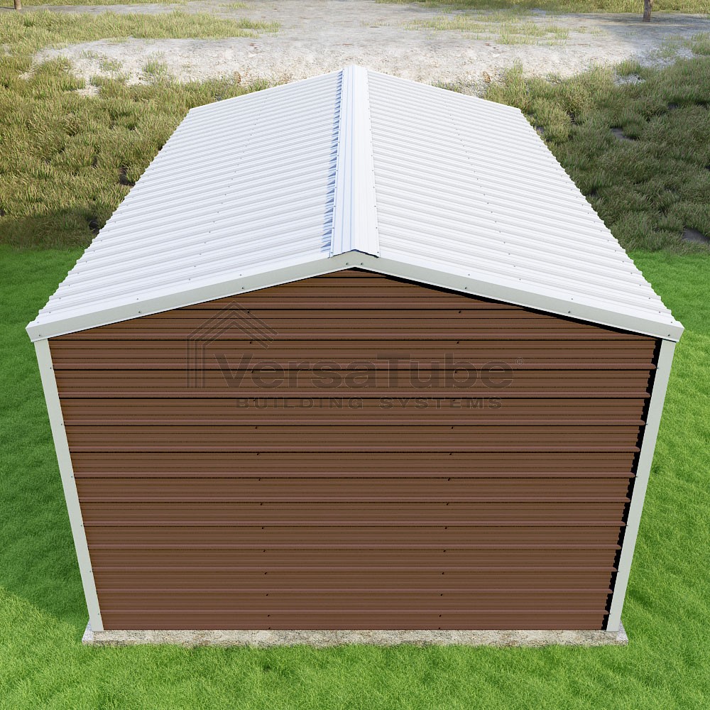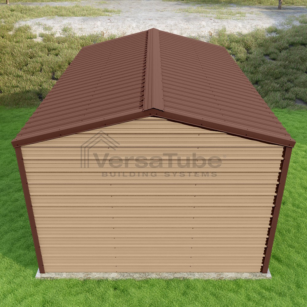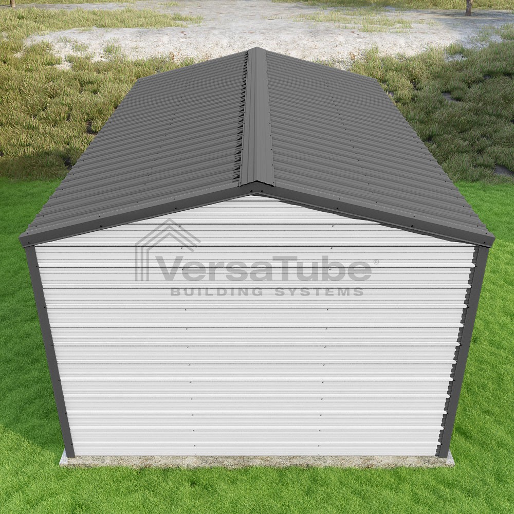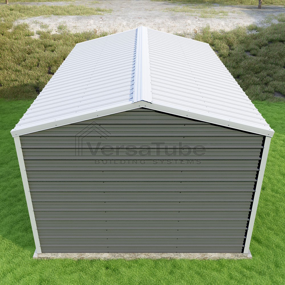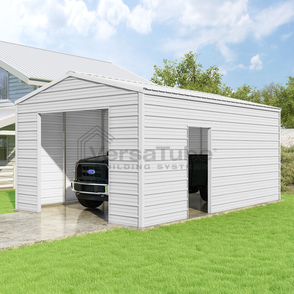 Frontier Series DIY garage kit features vertical sheet metal roof panels with horizontal siding panels..