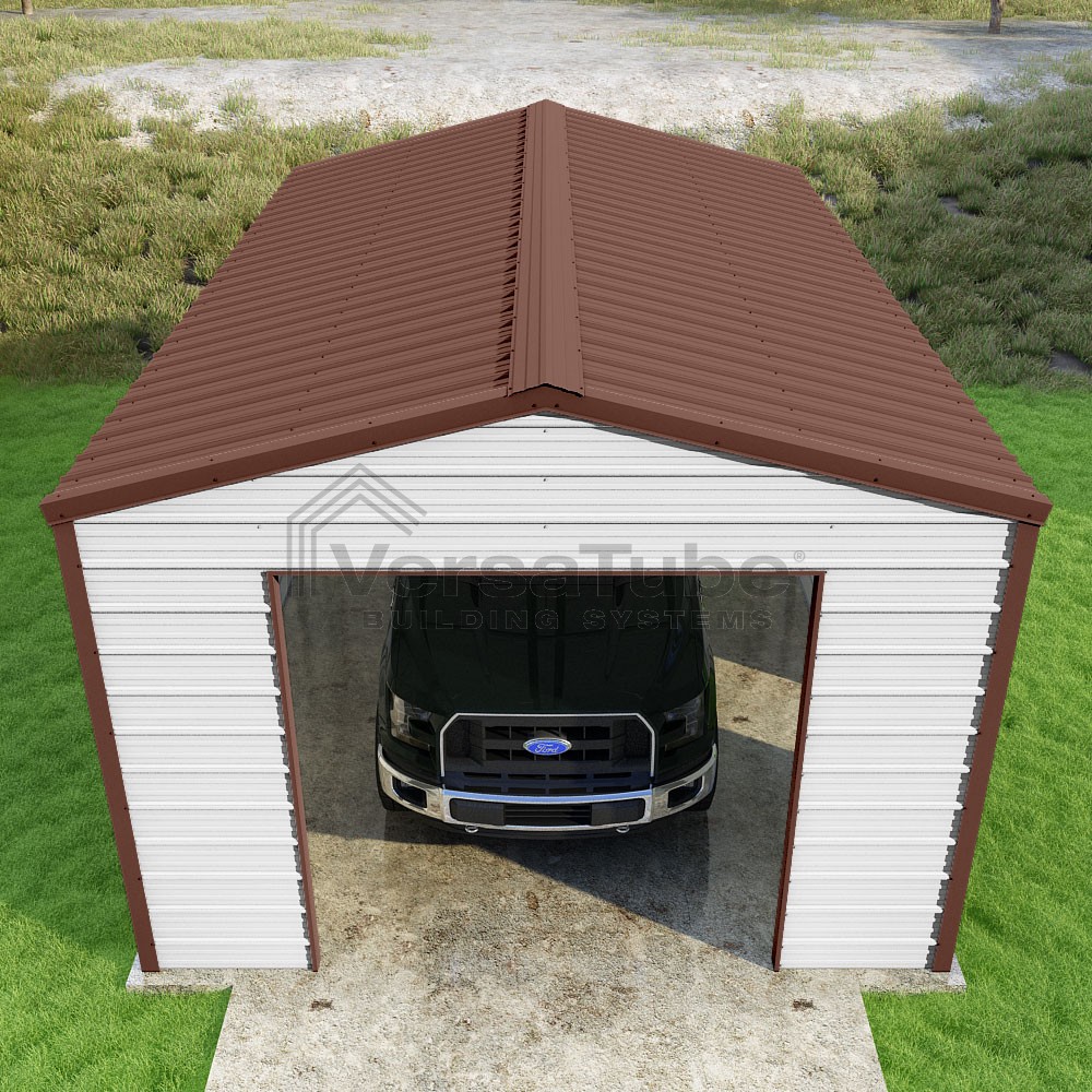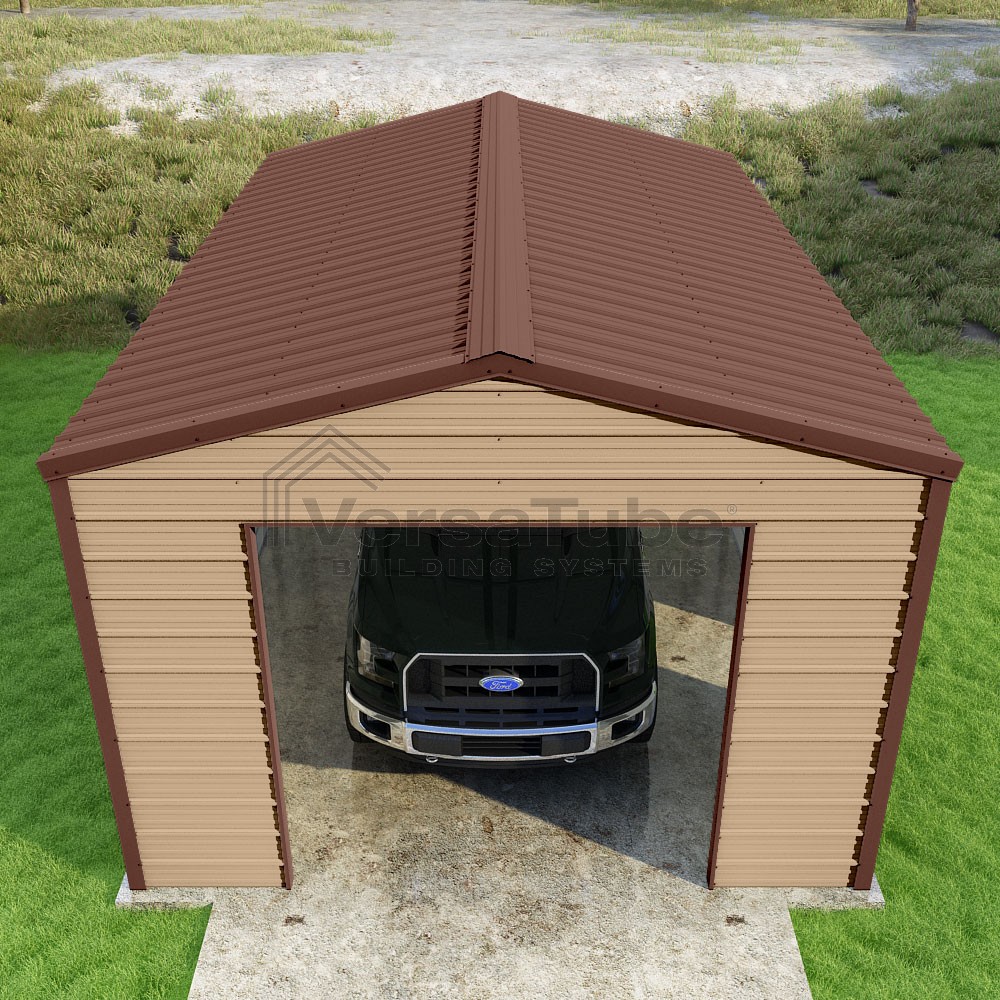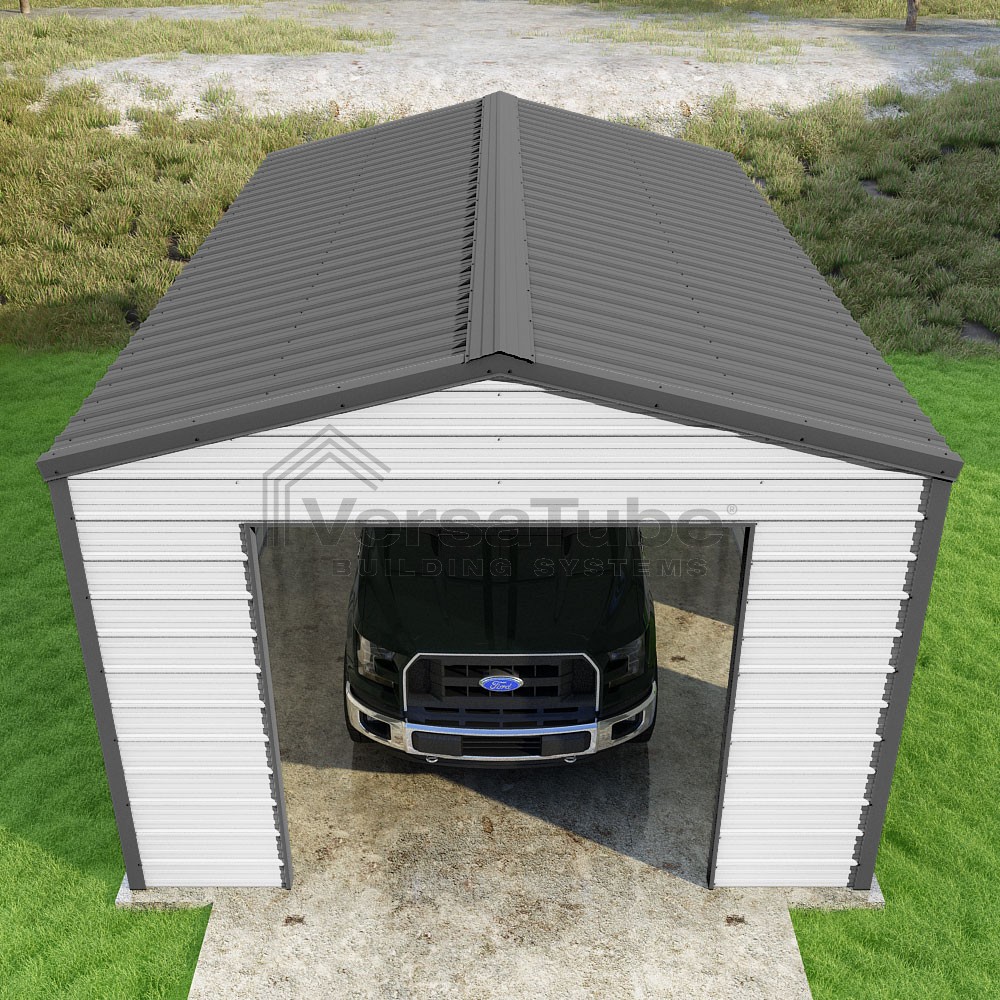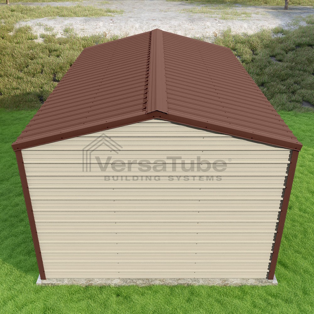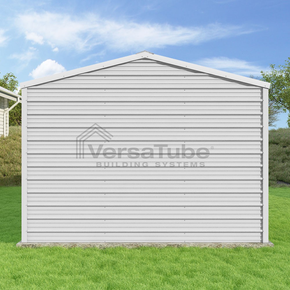 Frontier Series DIY garage kit features vertical sheet metal roof panels with horizontal siding panels..