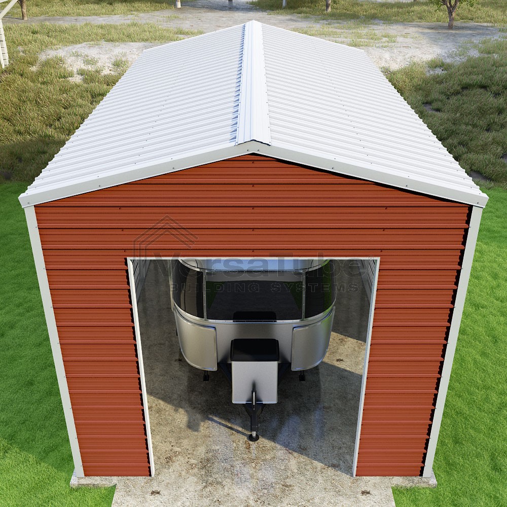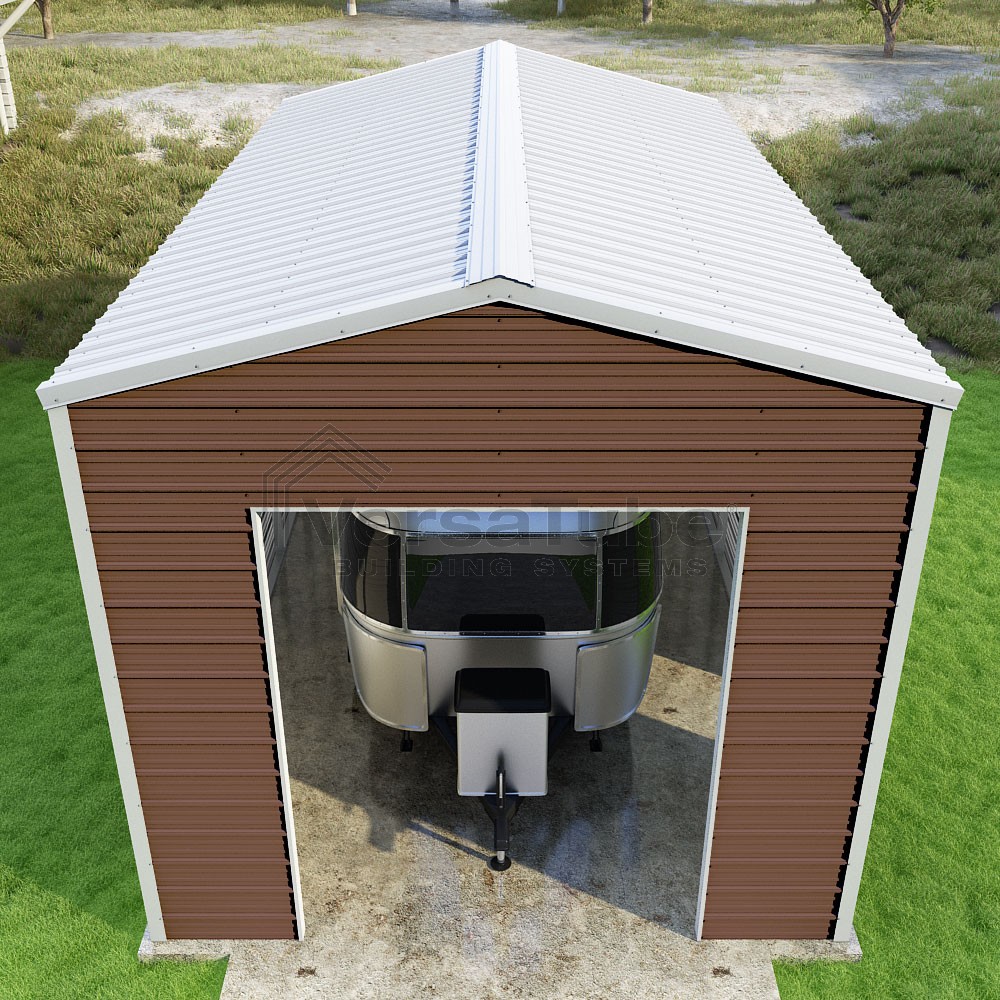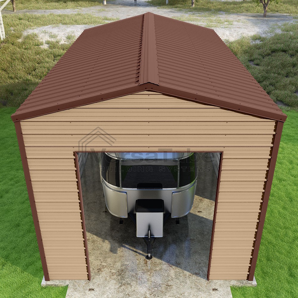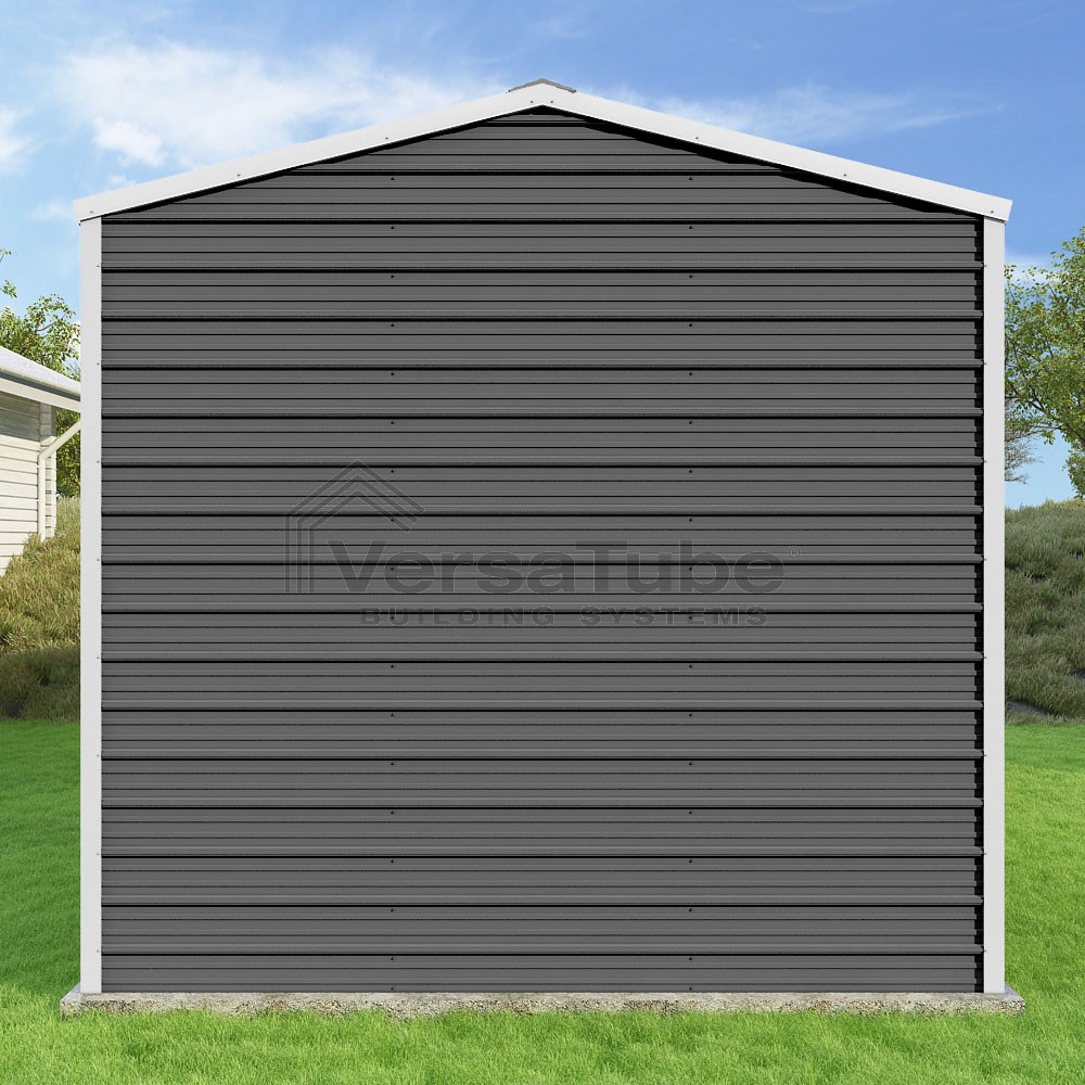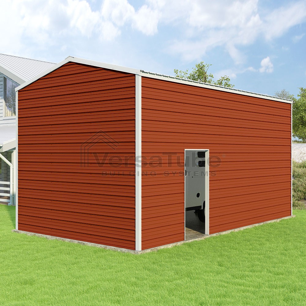 Frontier Series DIY garage kit features vertical sheet metal roof panels with horizontal siding panels..