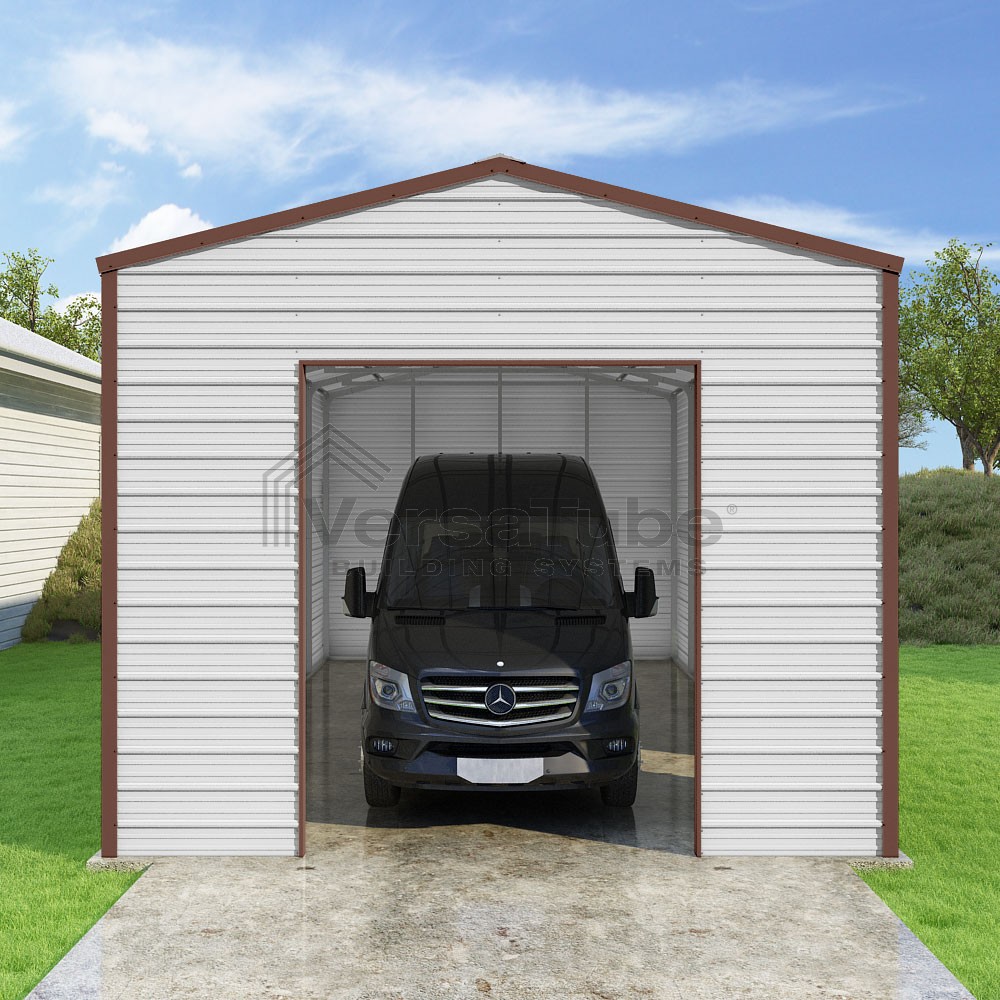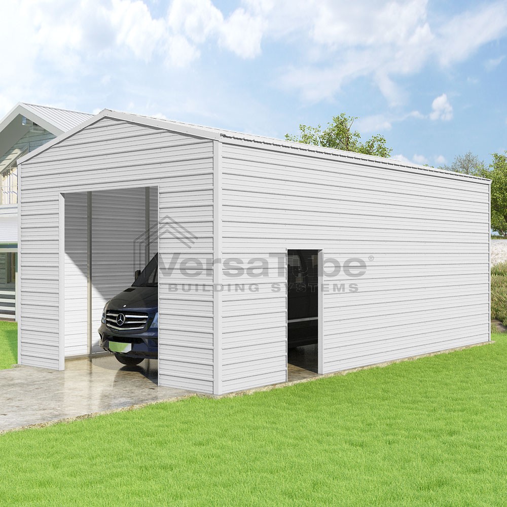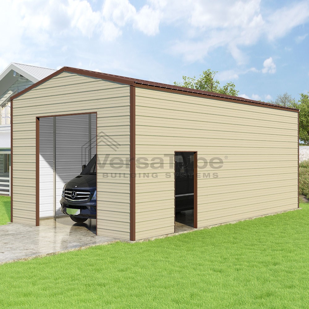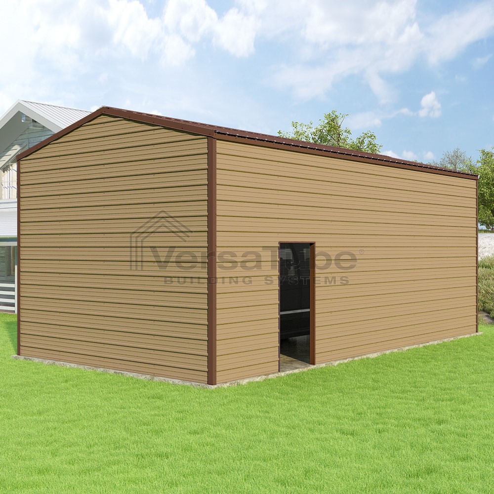 Frontier Series DIY garage kit features vertical sheet metal roof panels with horizontal siding panels..