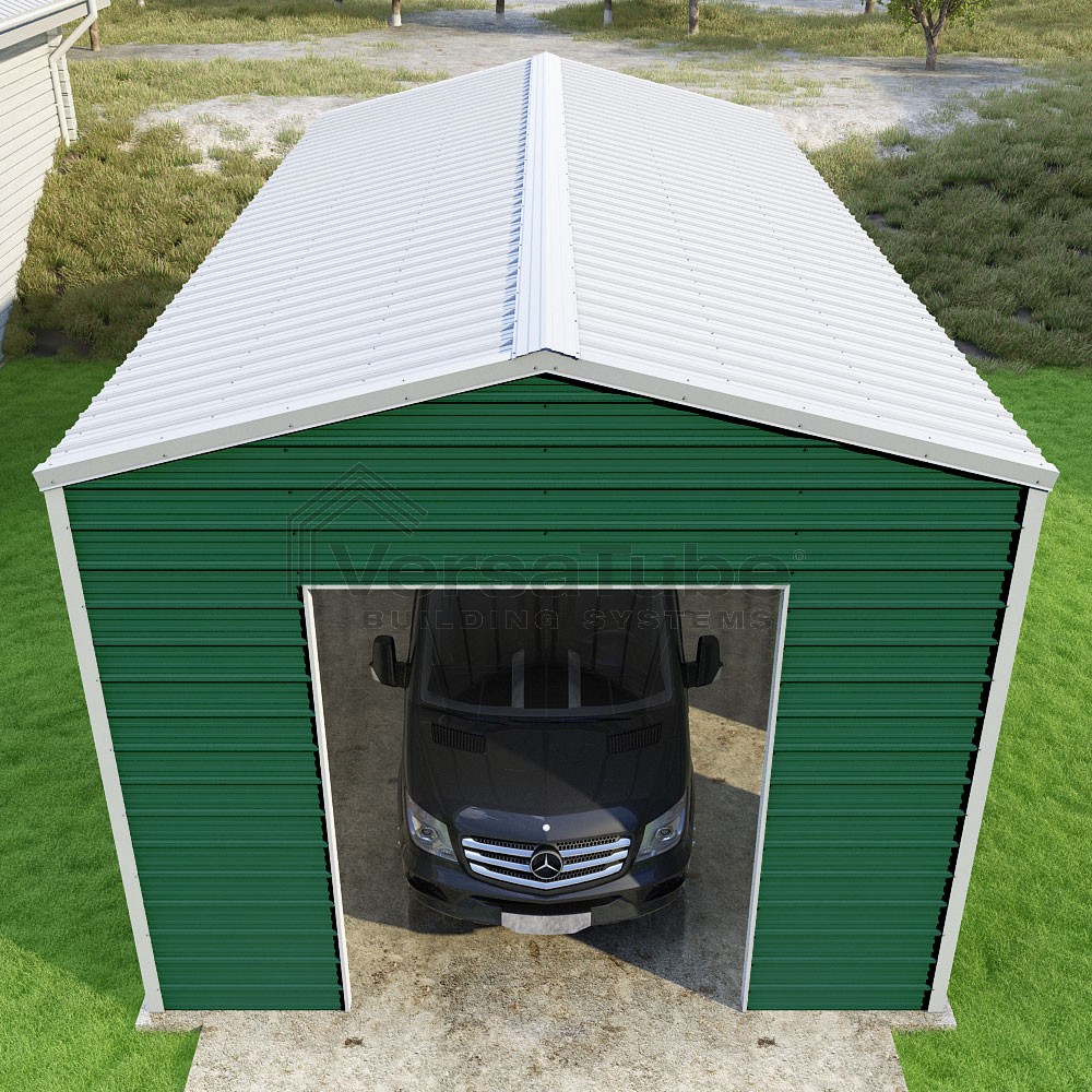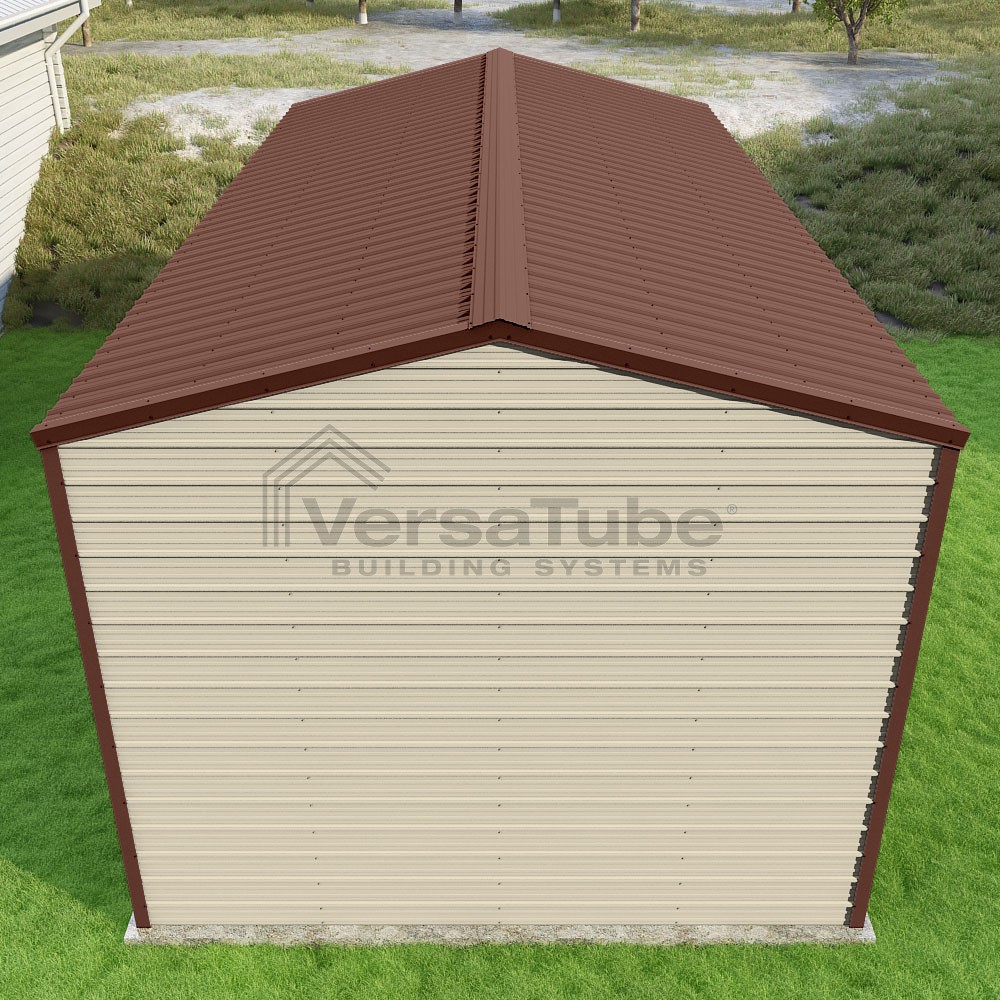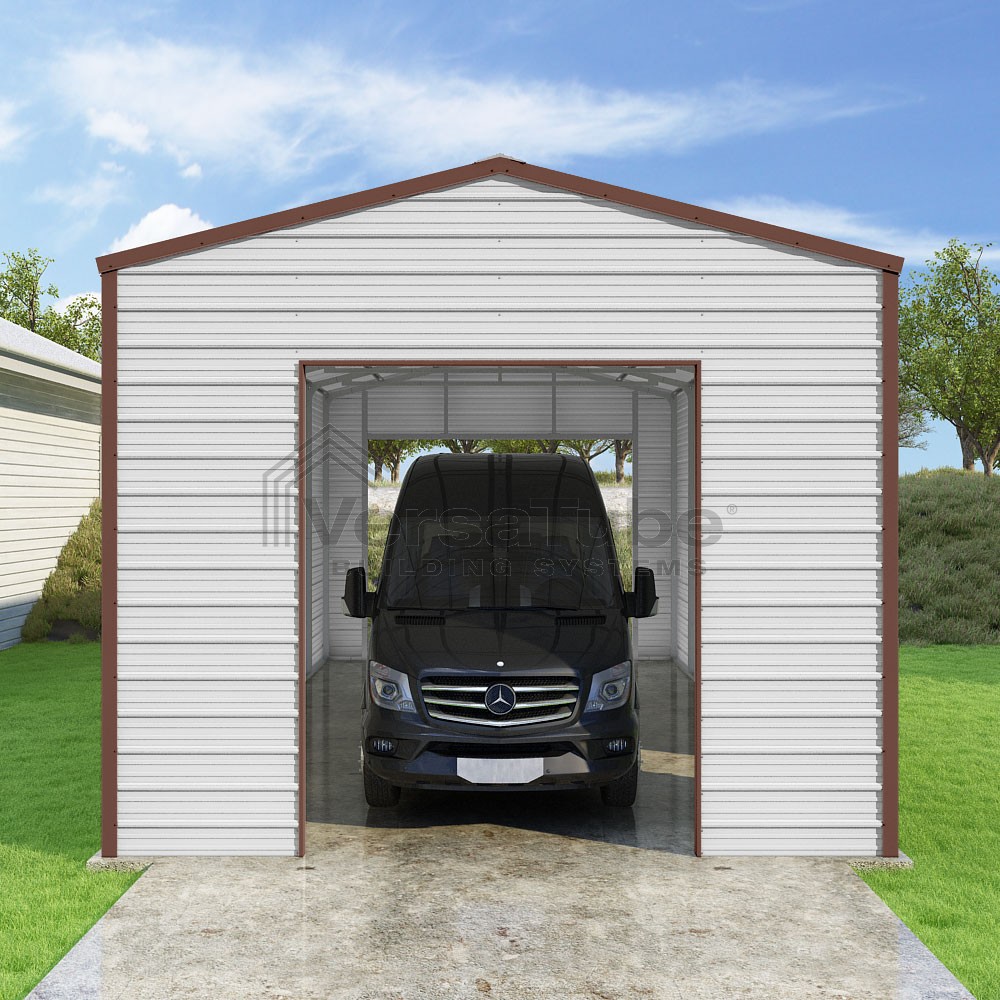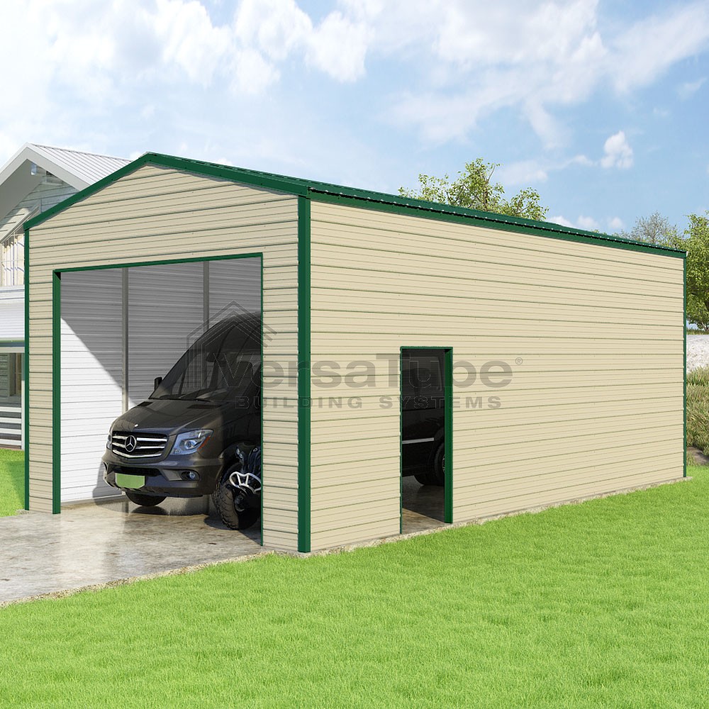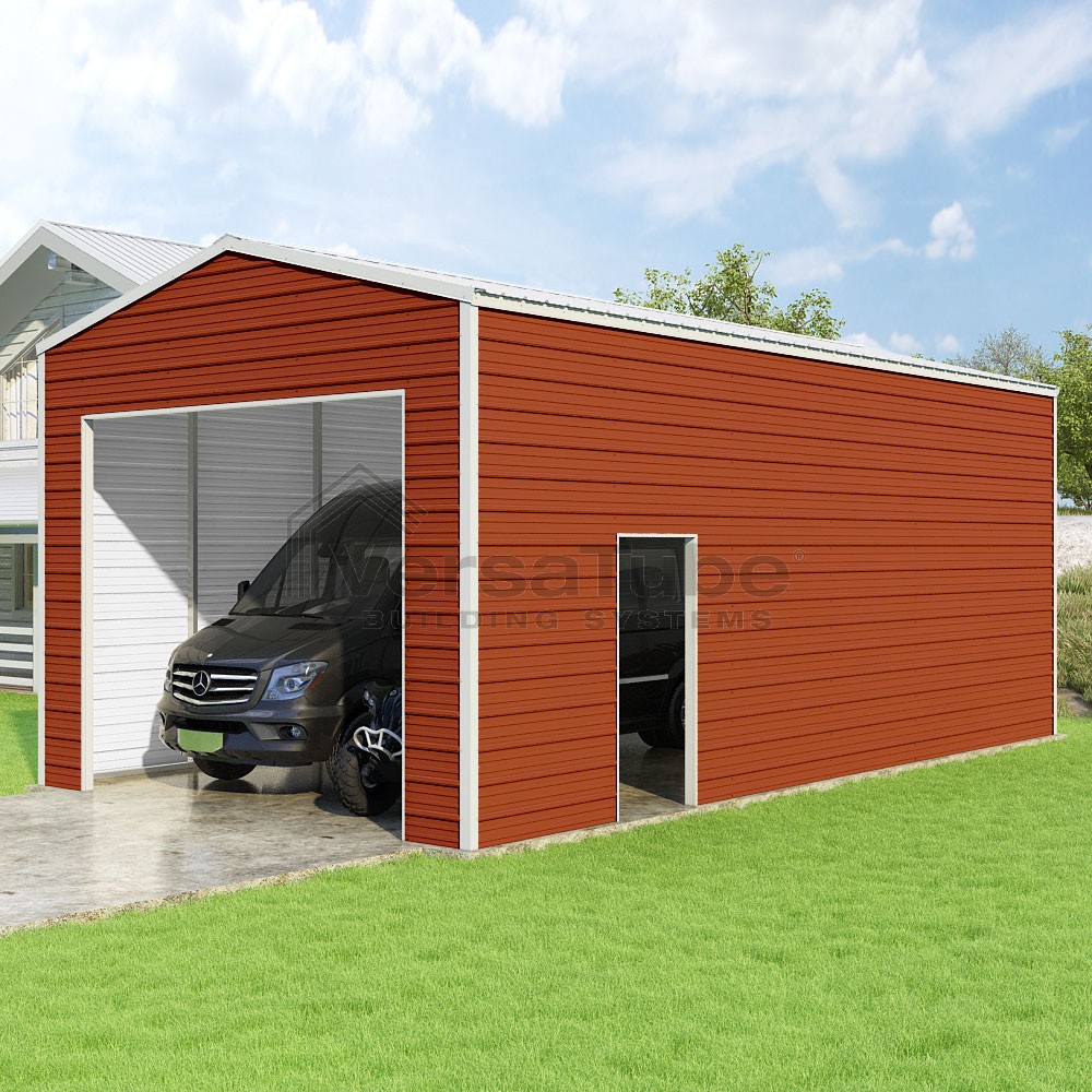 Frontier Series DIY garage kit features vertical sheet metal roof panels with horizontal siding panels..
