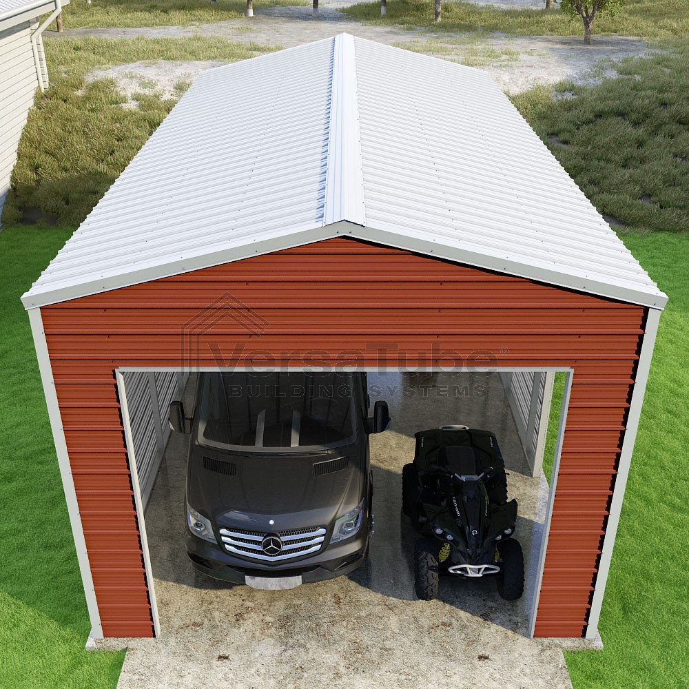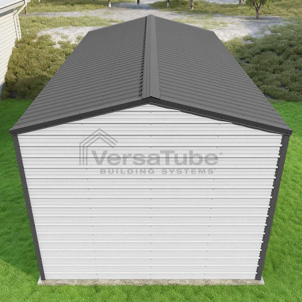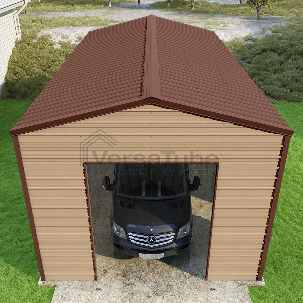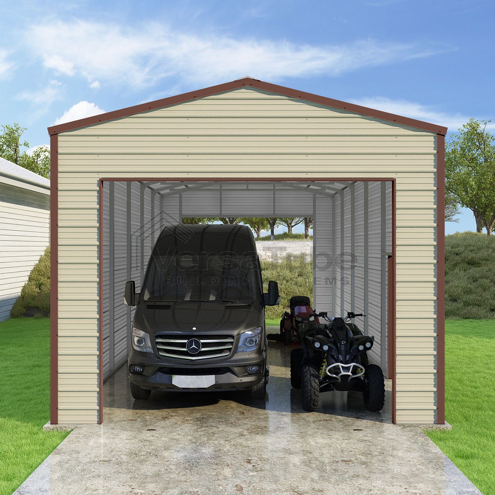Frontier Series DIY garage kit features vertical sheet metal roof panels with horizontal siding panels..