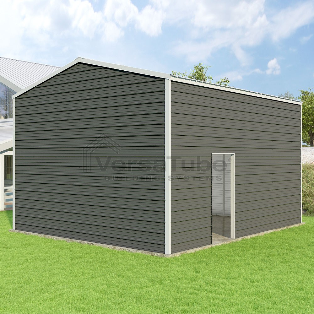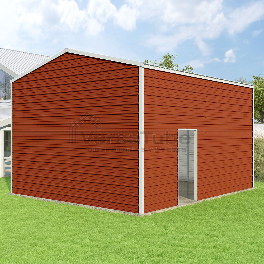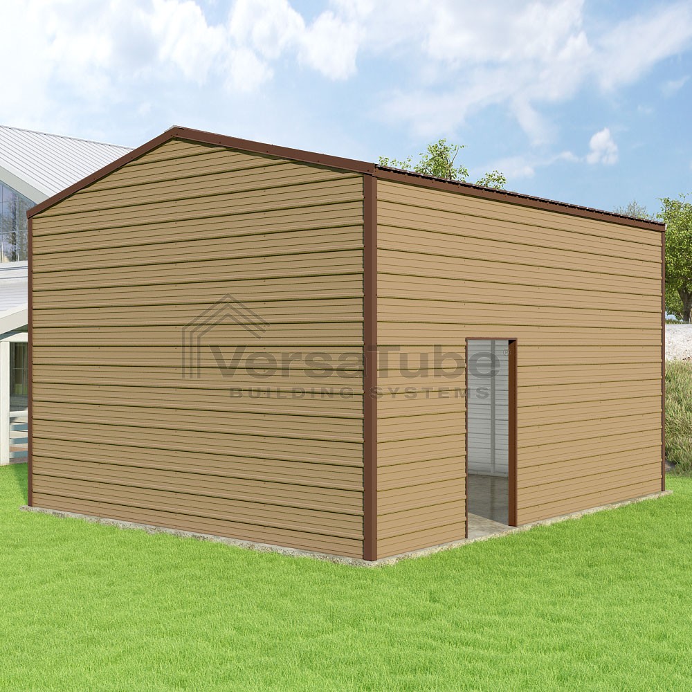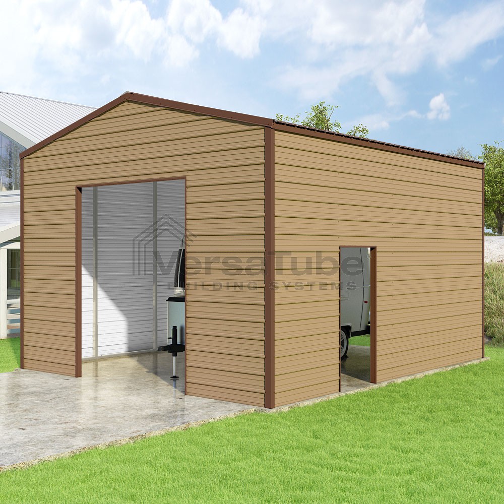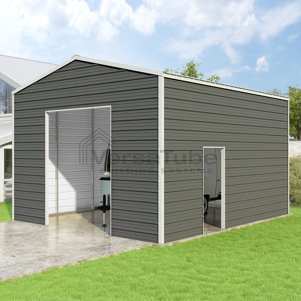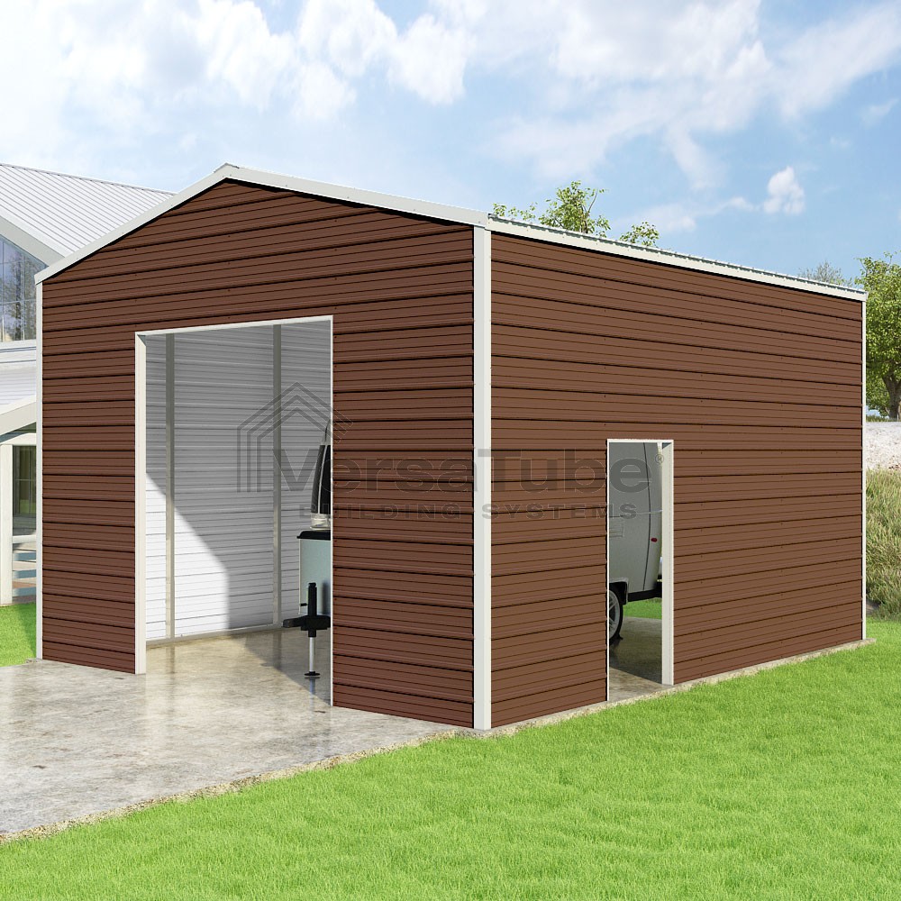 Frontier Series DIY garage kit features vertical sheet metal roof panels with horizontal siding panels..