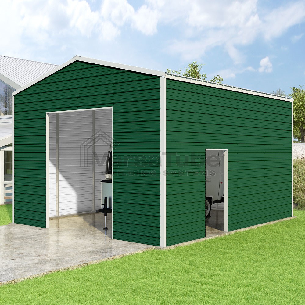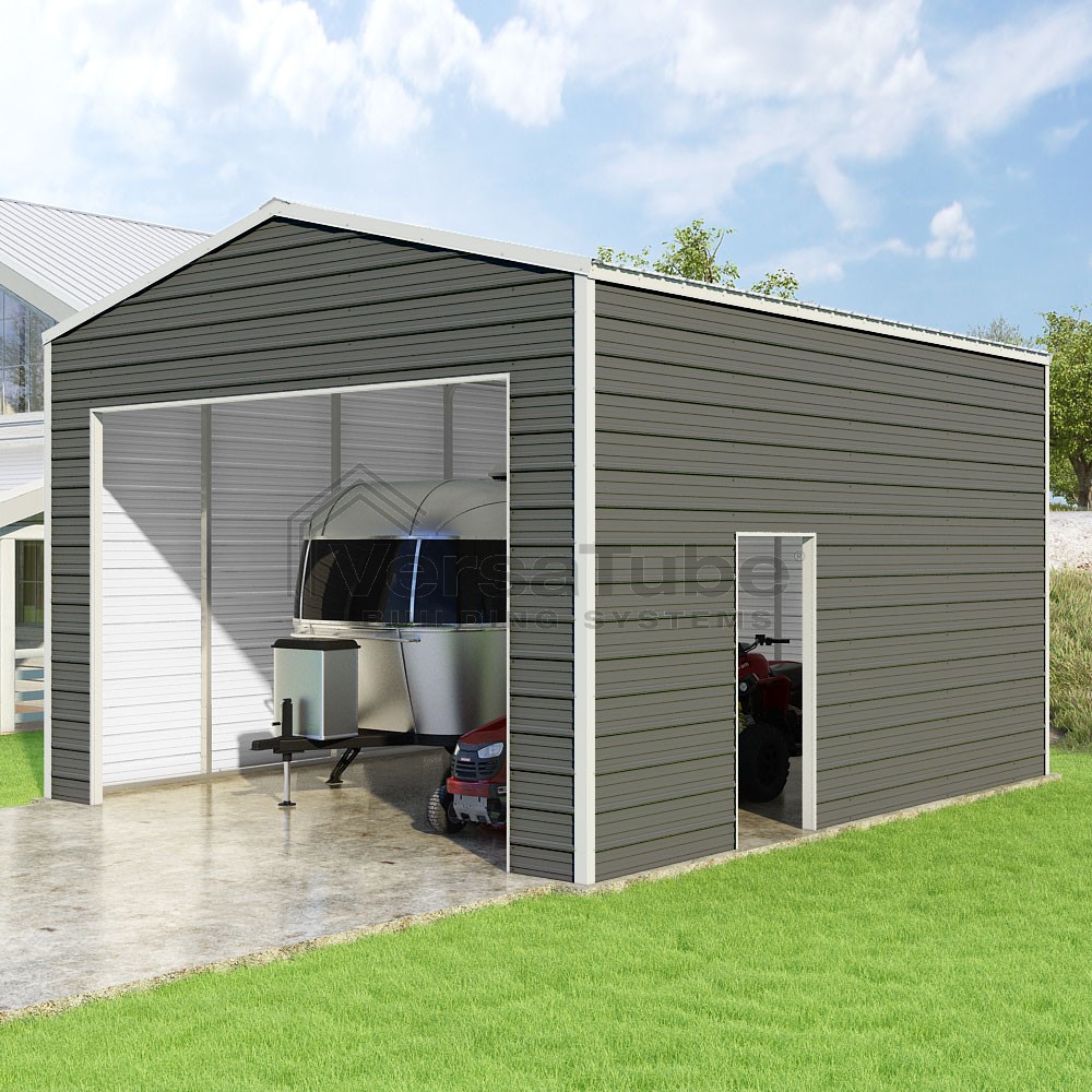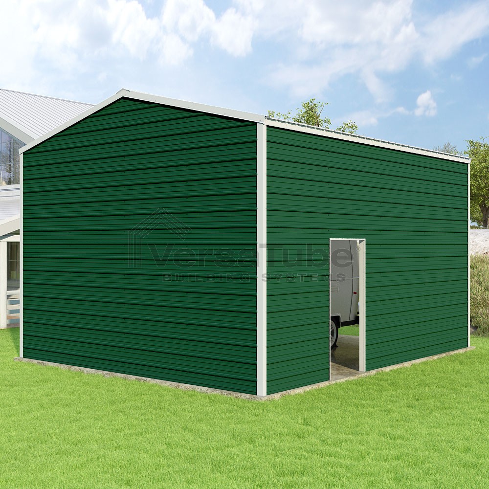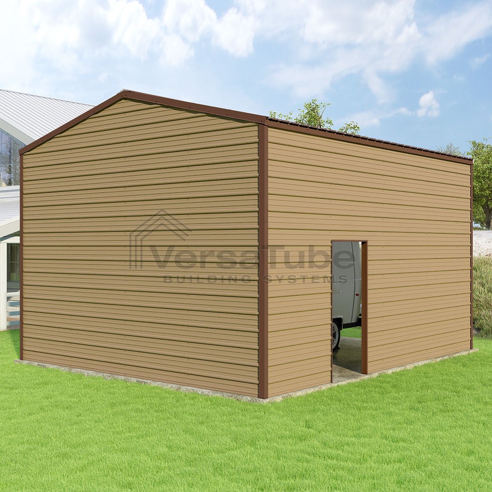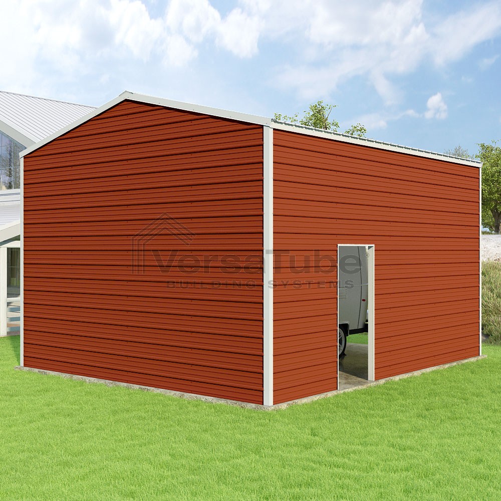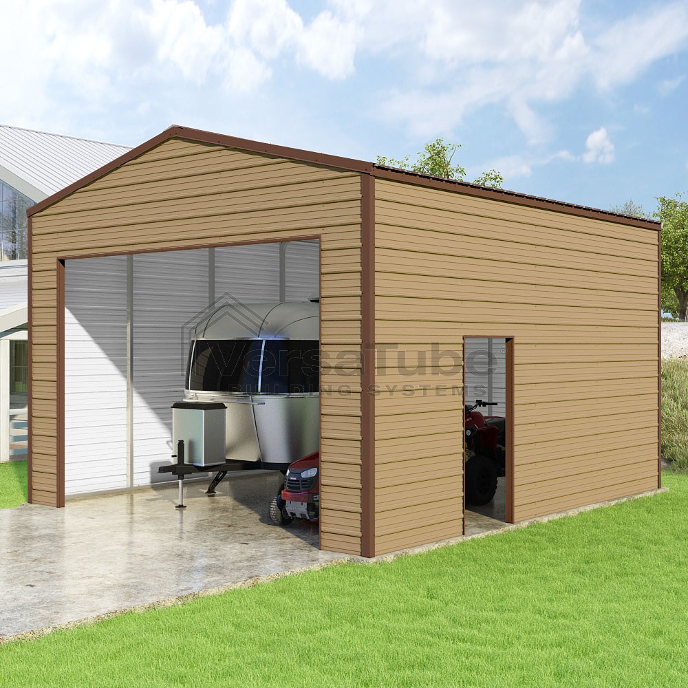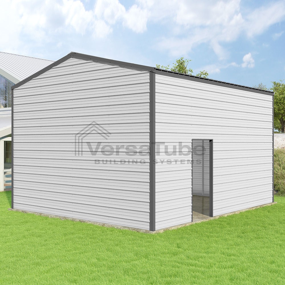 Frontier Series DIY garage kit features vertical sheet metal roof panels with horizontal siding panels..