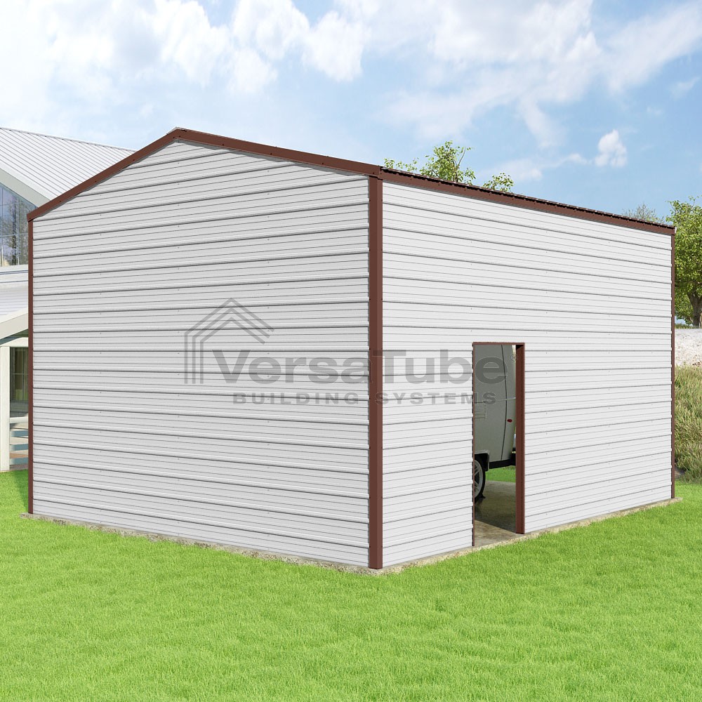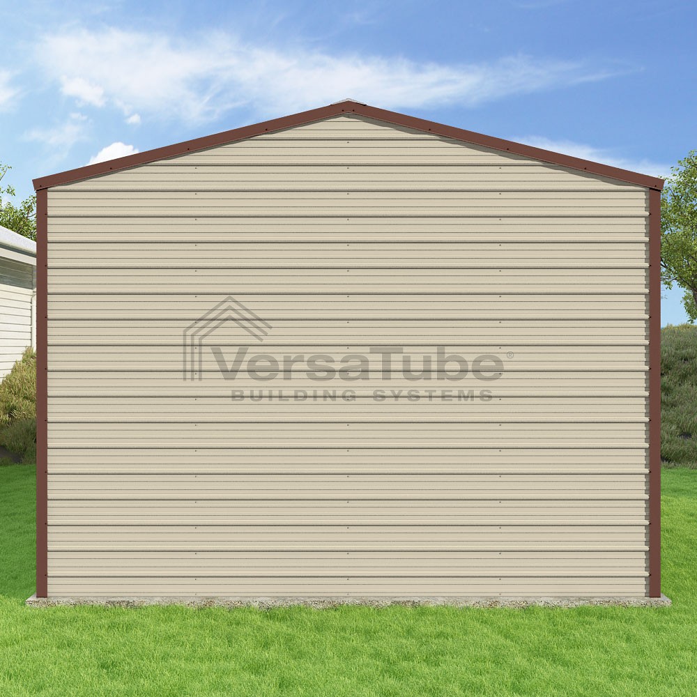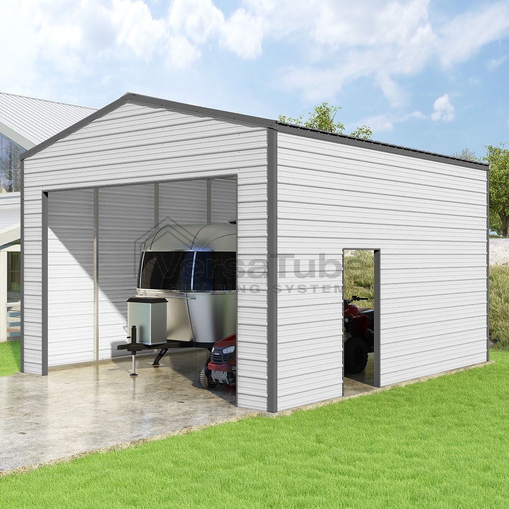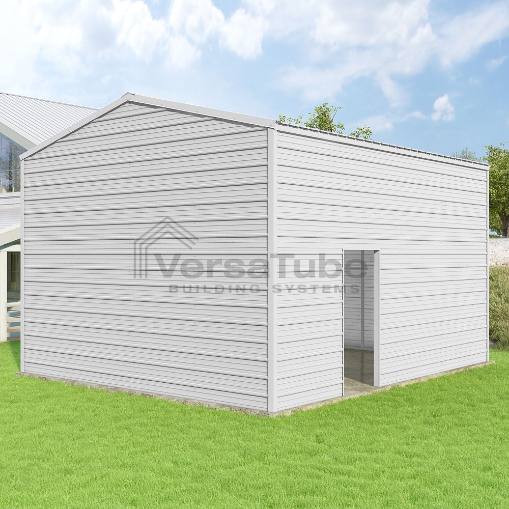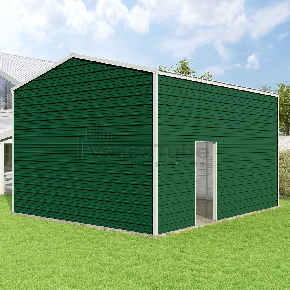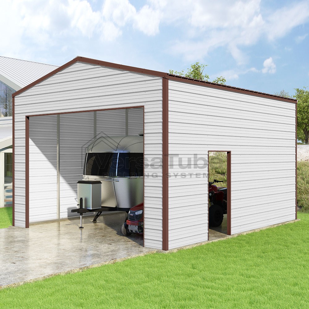 Frontier Series DIY garage kit features vertical sheet metal roof panels with horizontal siding panels..