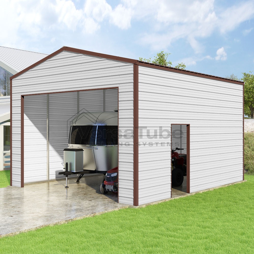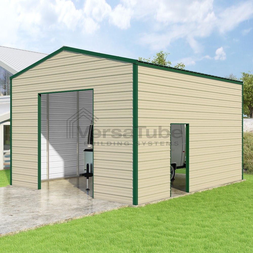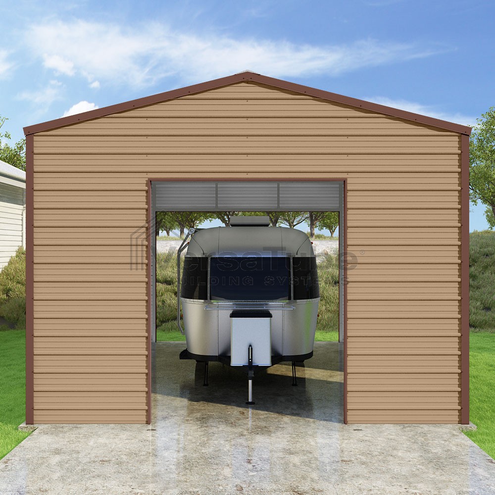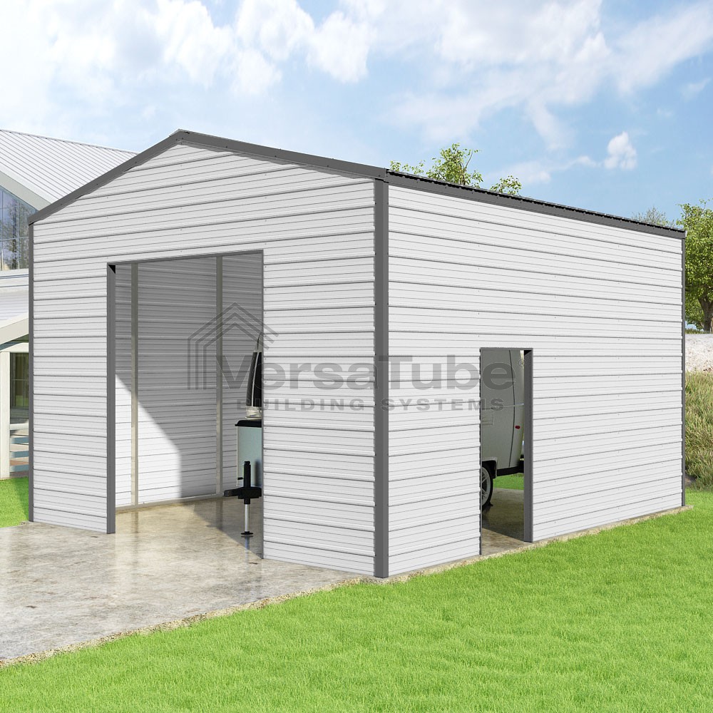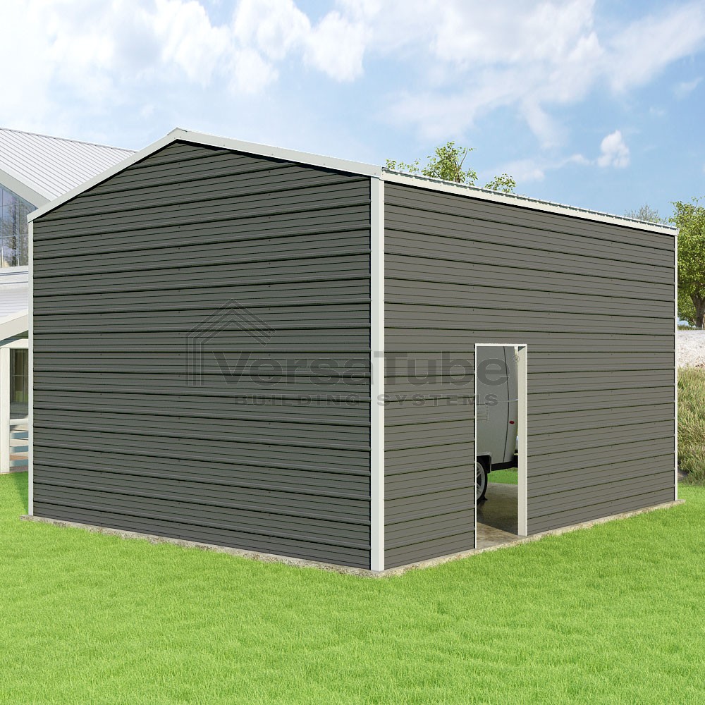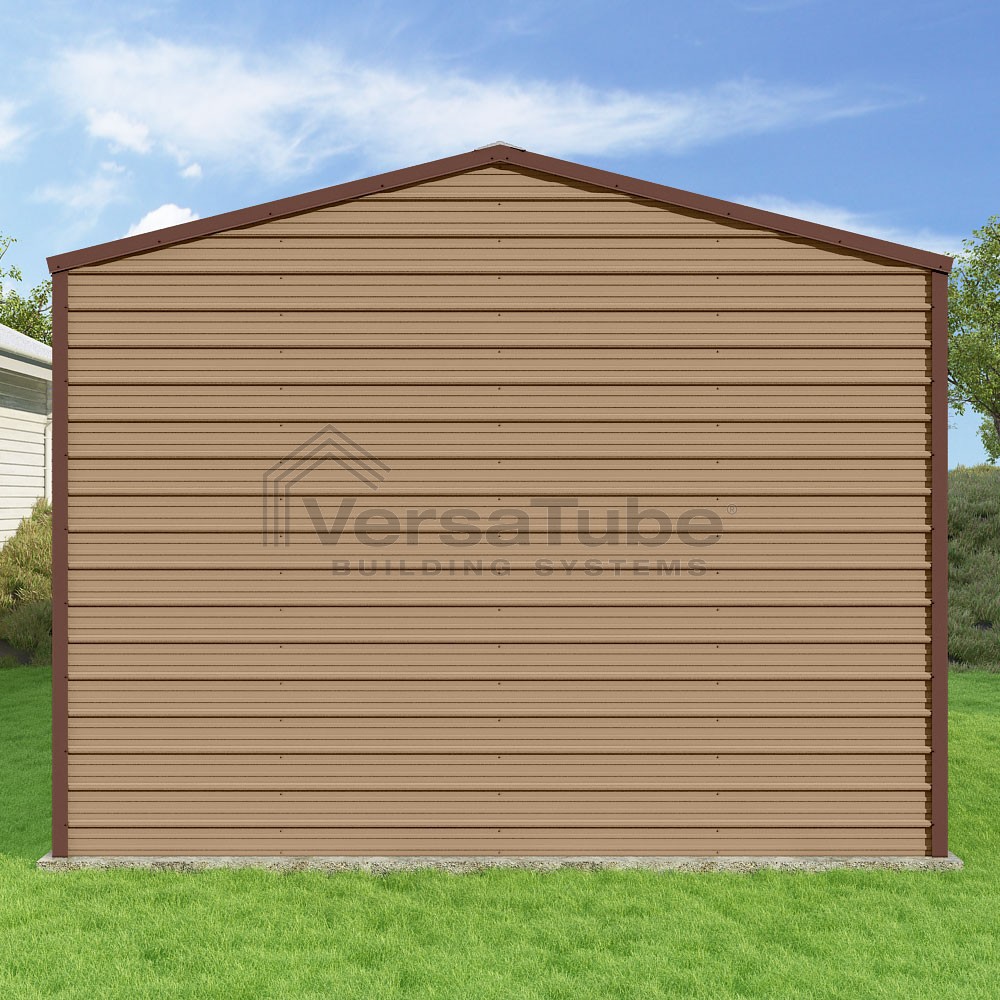 Frontier Series DIY garage kit features vertical sheet metal roof panels with horizontal siding panels..