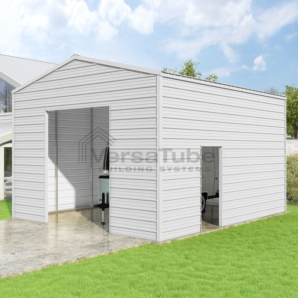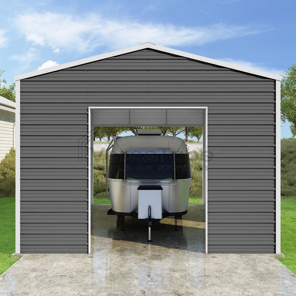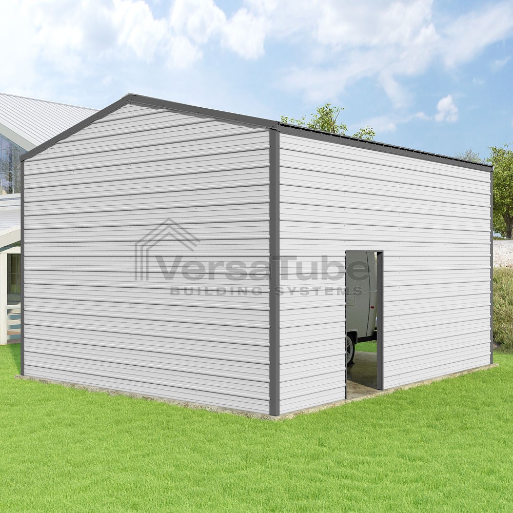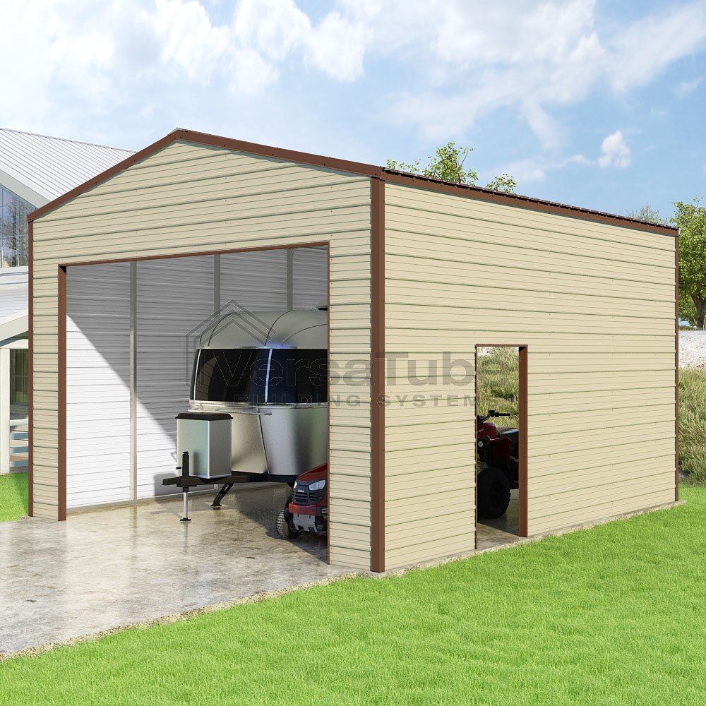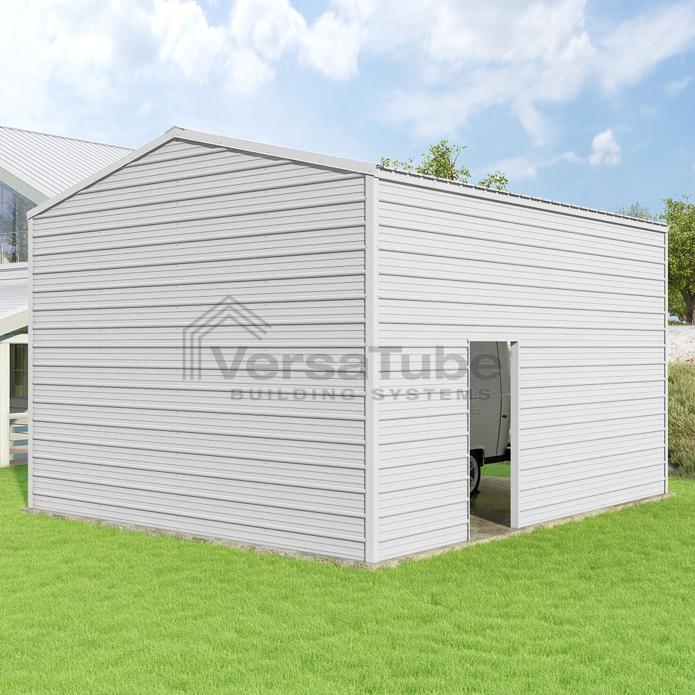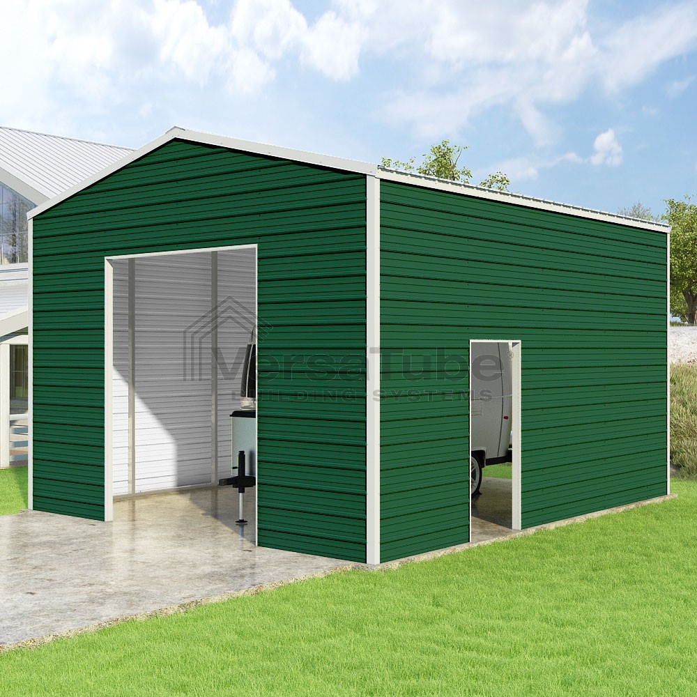 Frontier Series DIY garage kit features vertical sheet metal roof panels with horizontal siding panels..