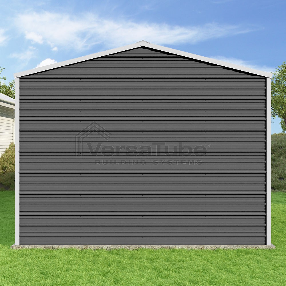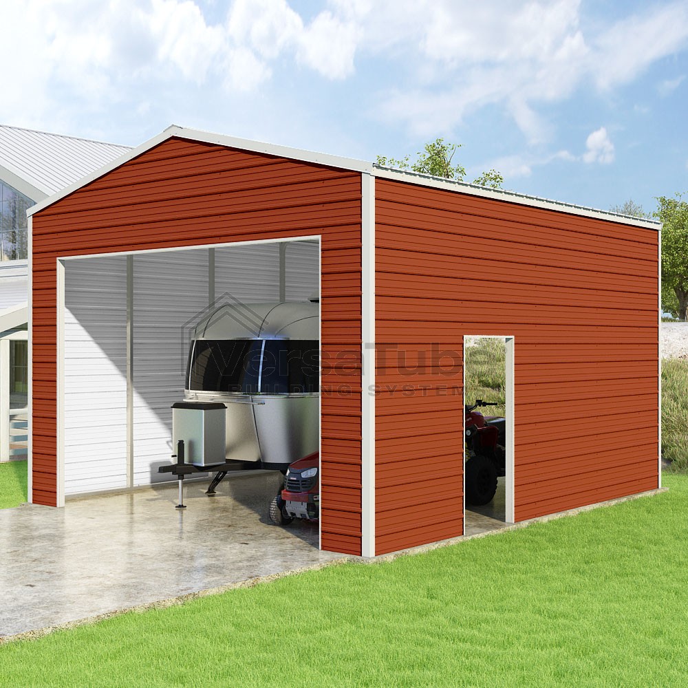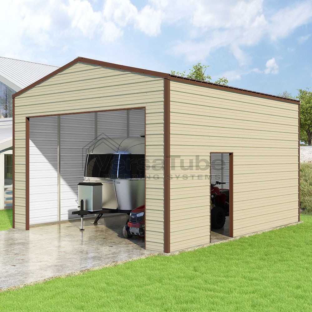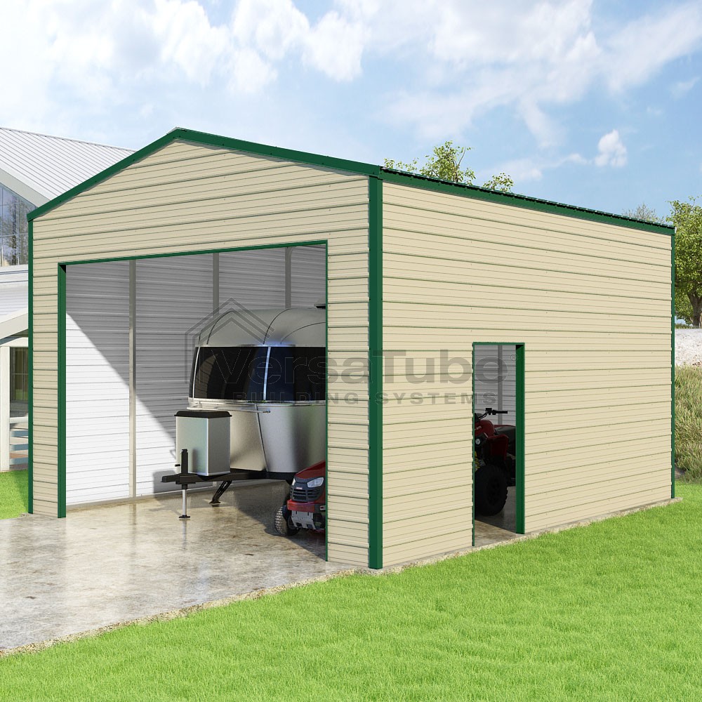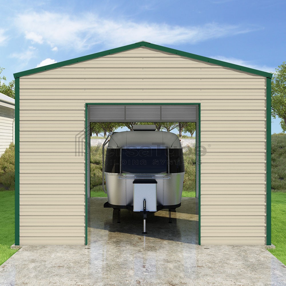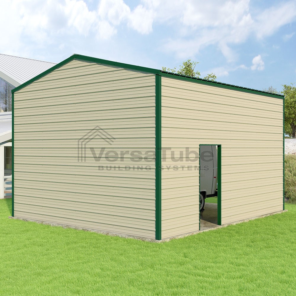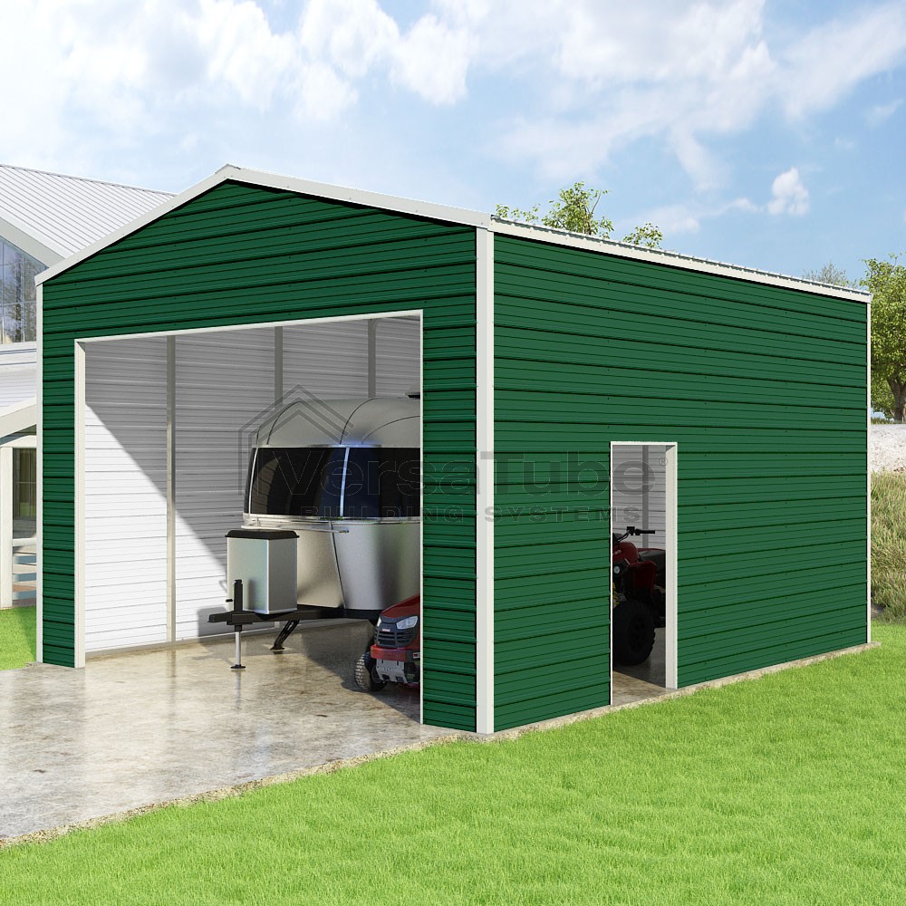 Frontier Series DIY garage kit features vertical sheet metal roof panels with horizontal siding panels..