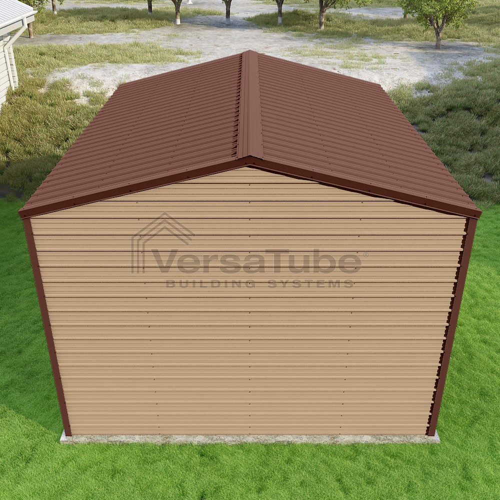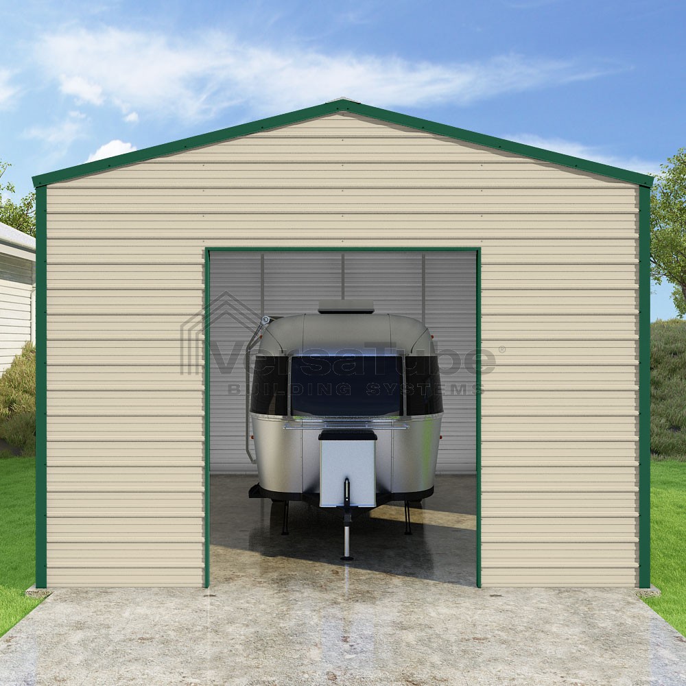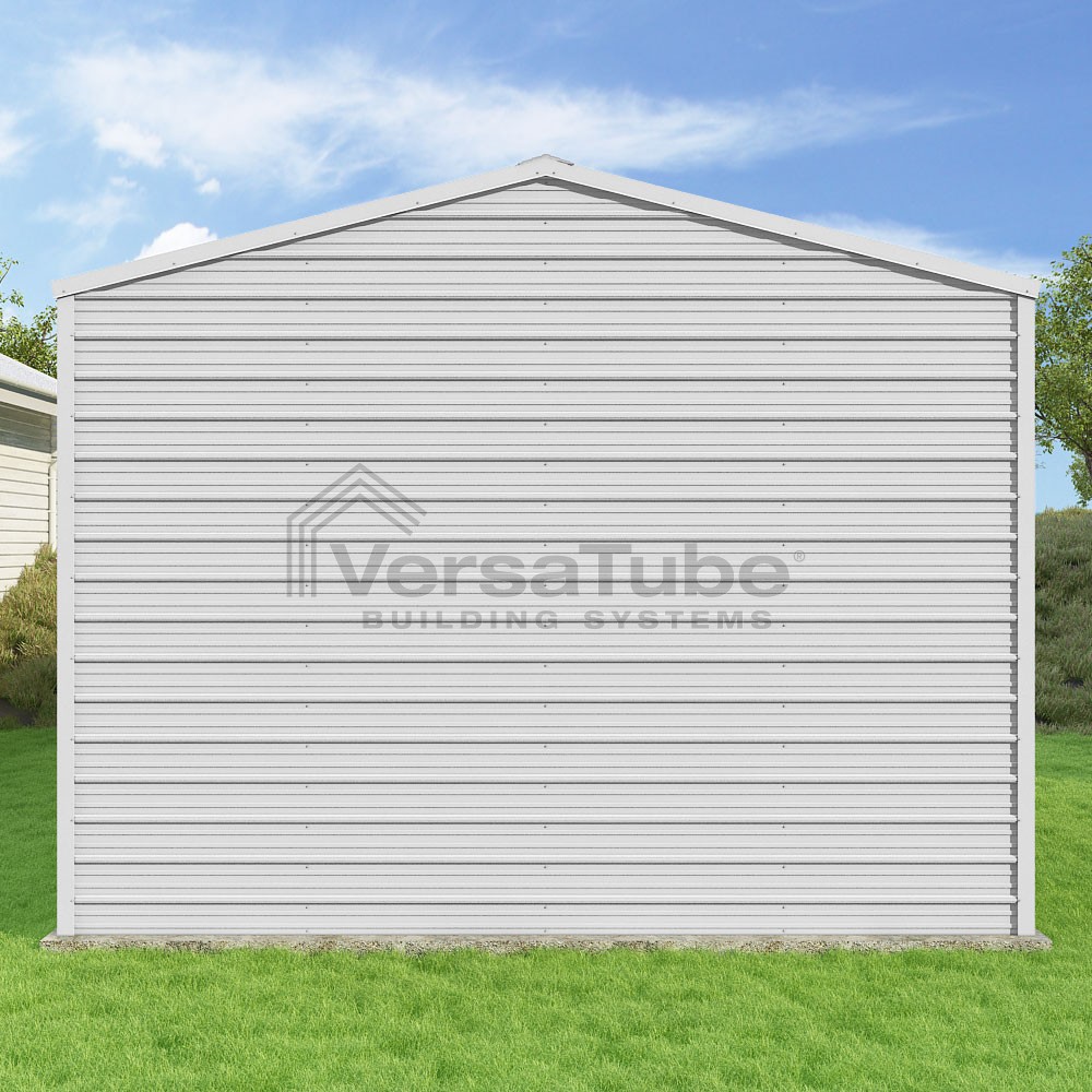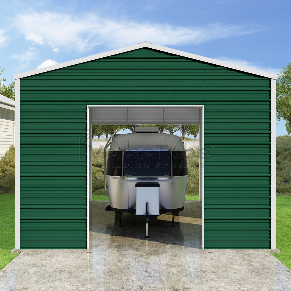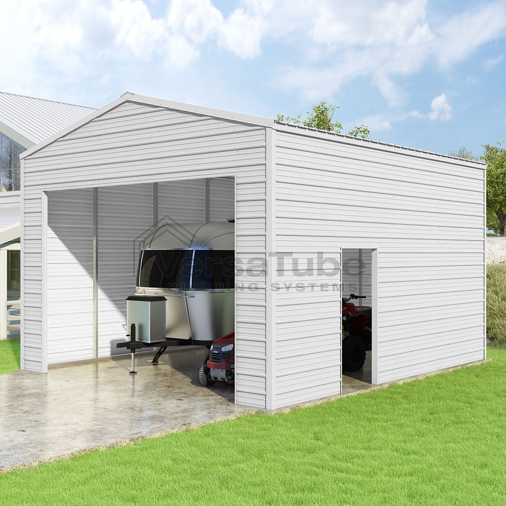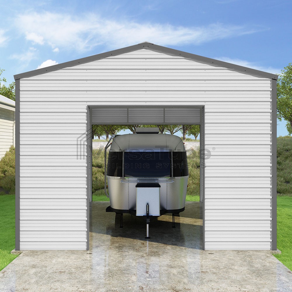 Frontier Series DIY garage kit features vertical sheet metal roof panels with horizontal siding panels..