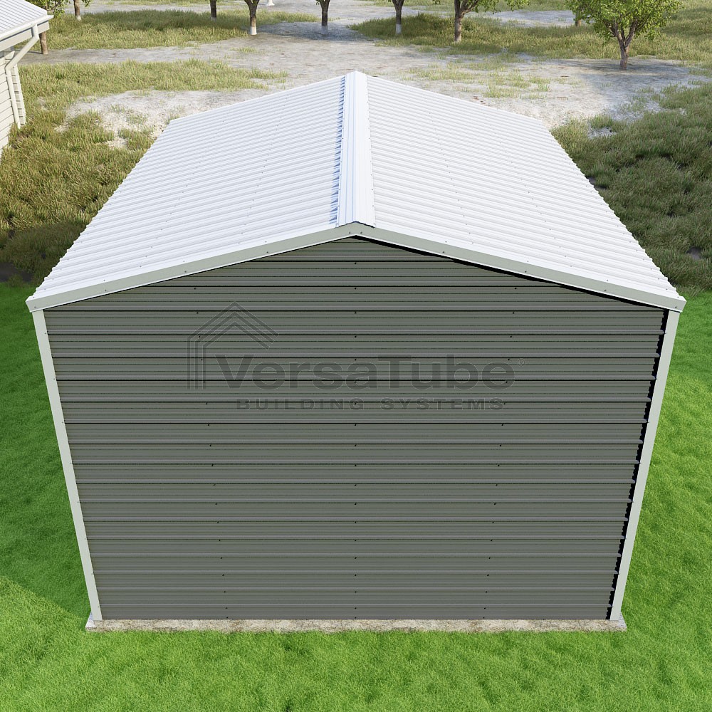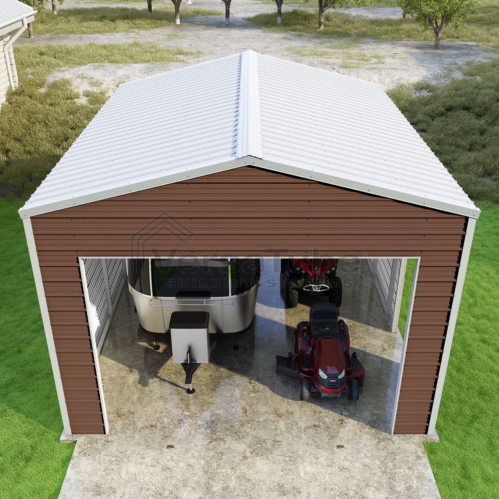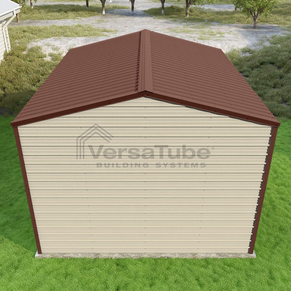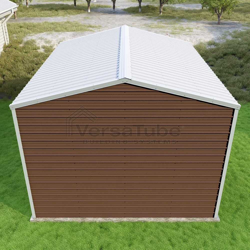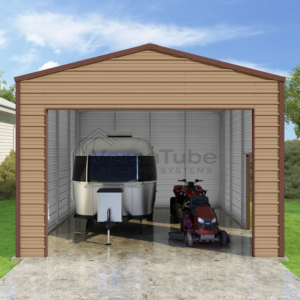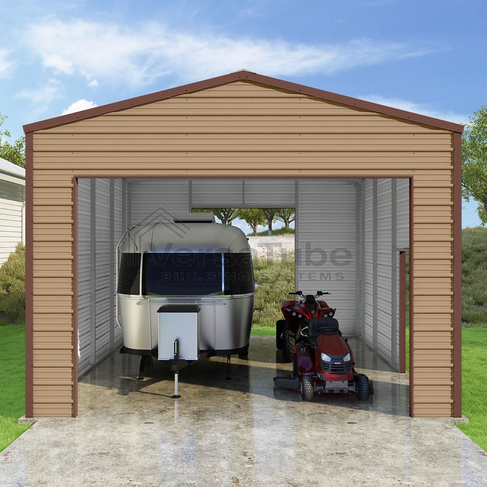 Frontier Series DIY garage kit features vertical sheet metal roof panels with horizontal siding panels..