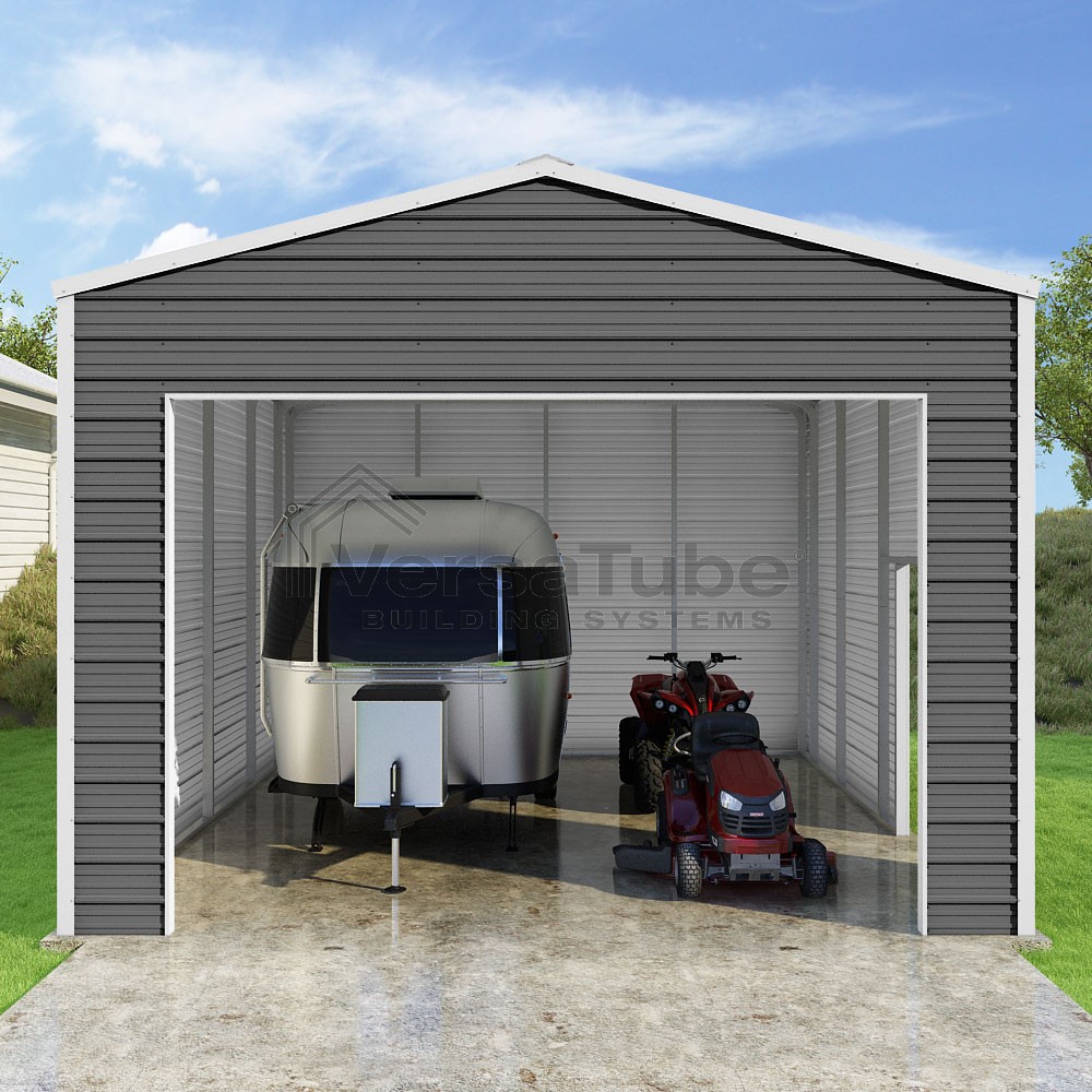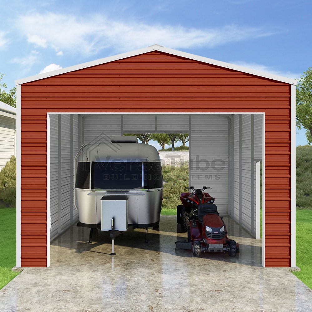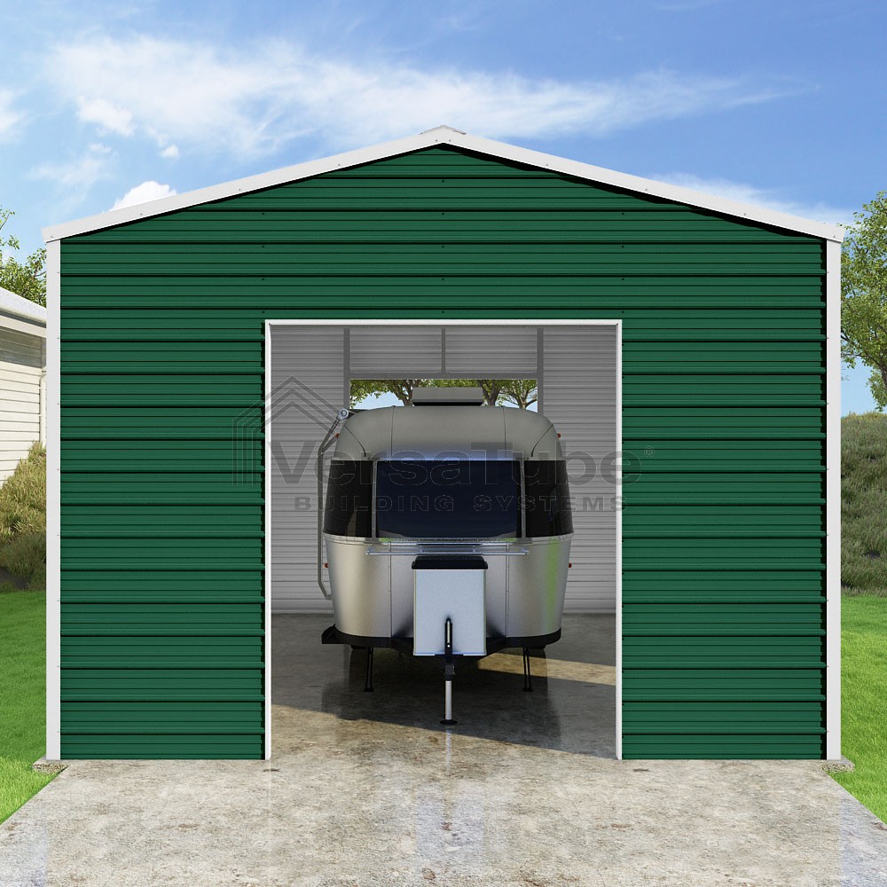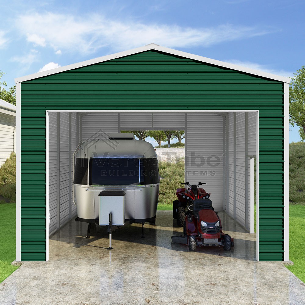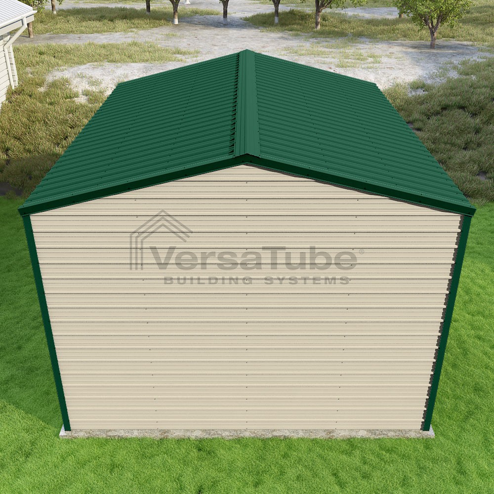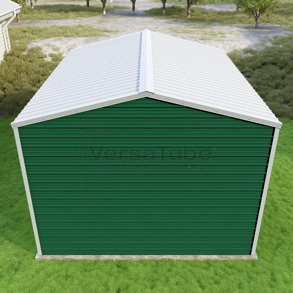 Frontier Series DIY garage kit features vertical sheet metal roof panels with horizontal siding panels..