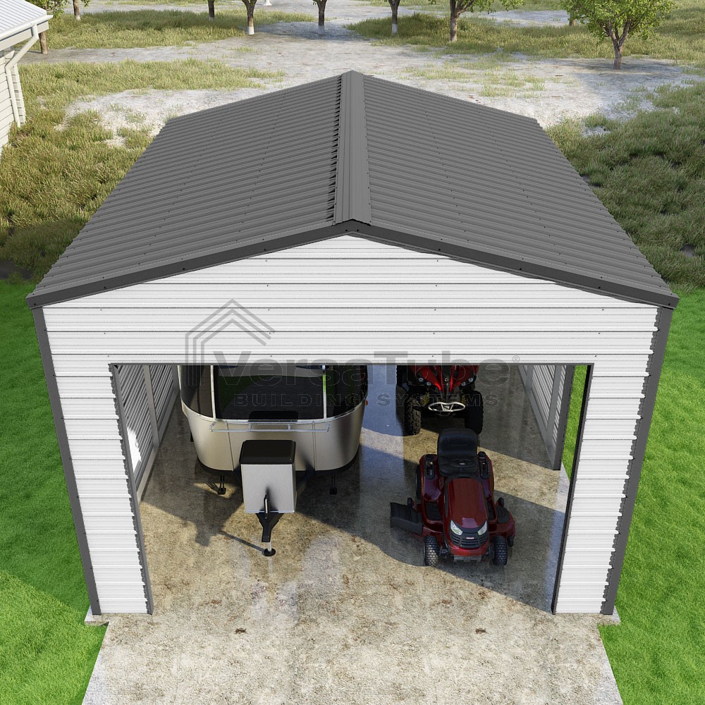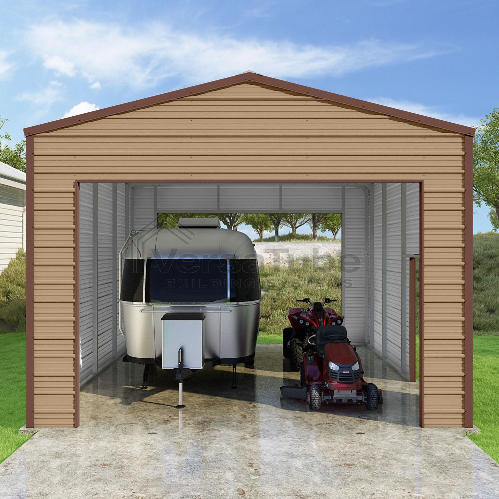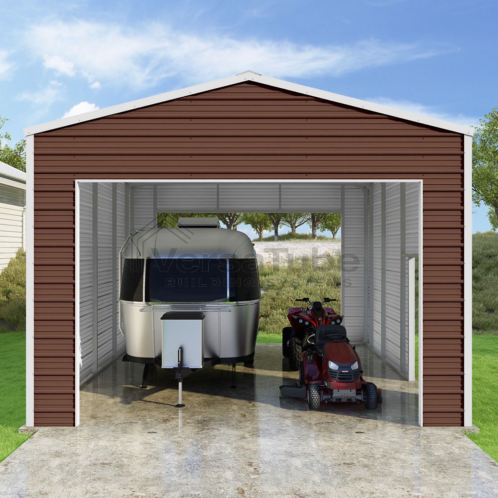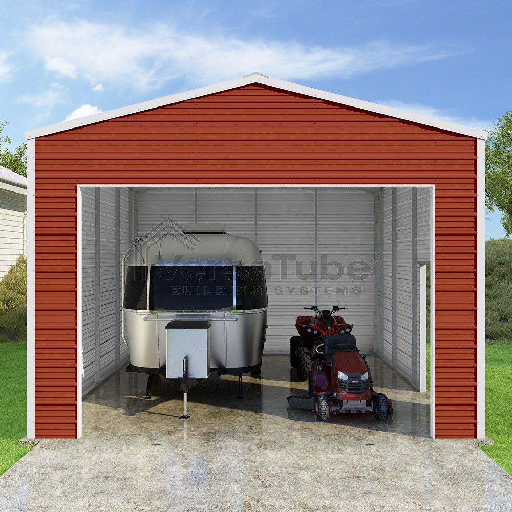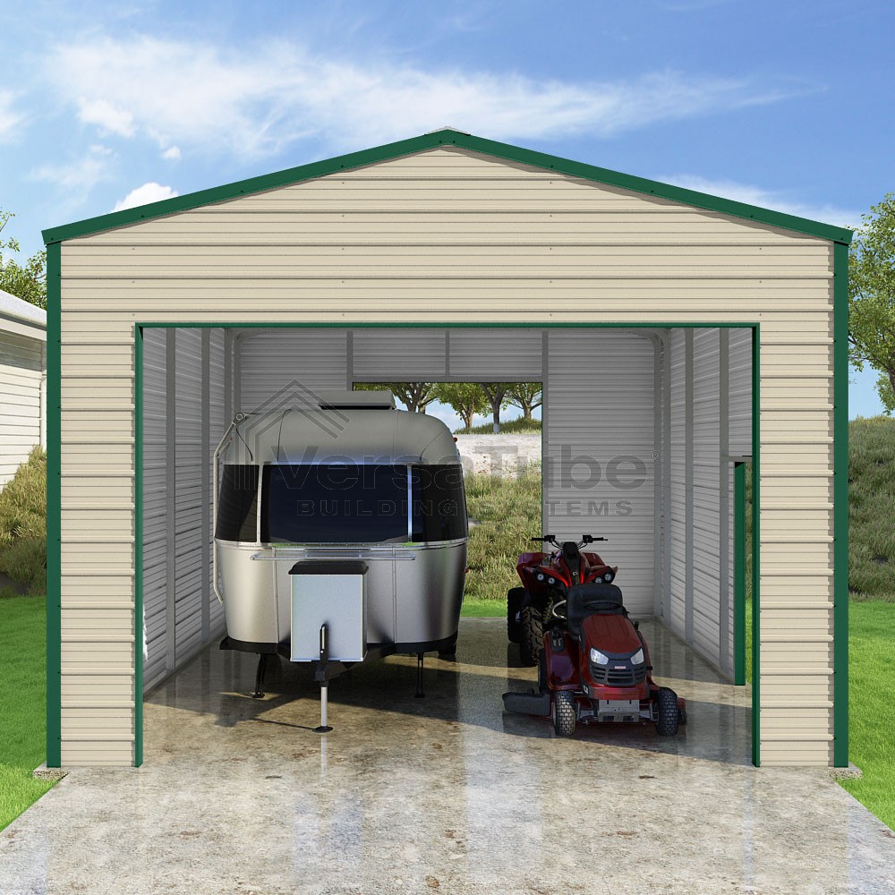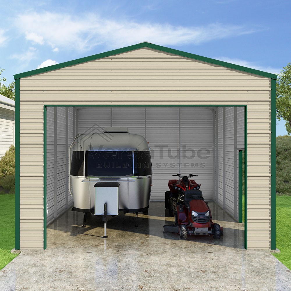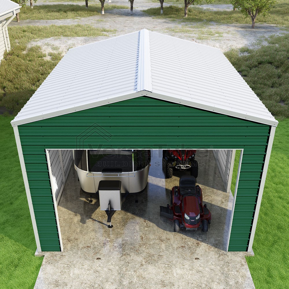 Frontier Series DIY garage kit features vertical sheet metal roof panels with horizontal siding panels..