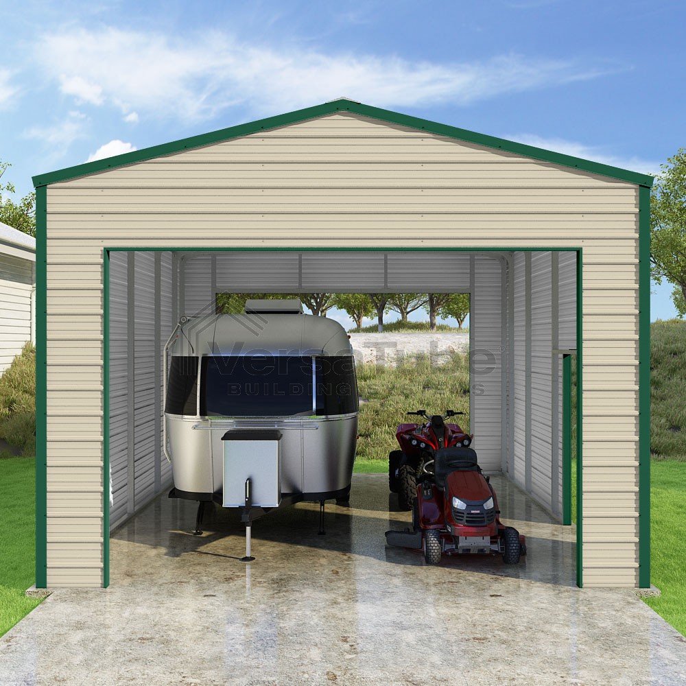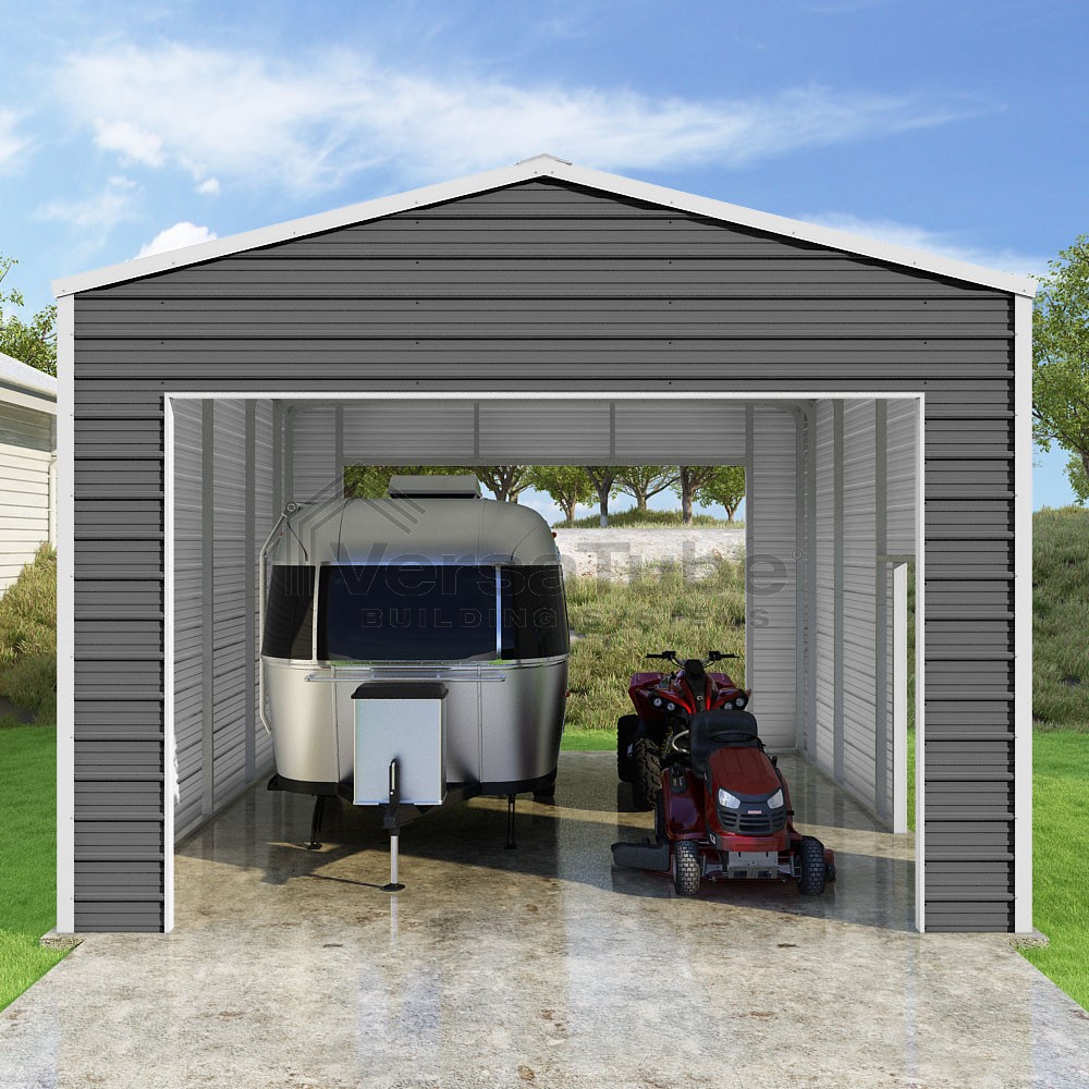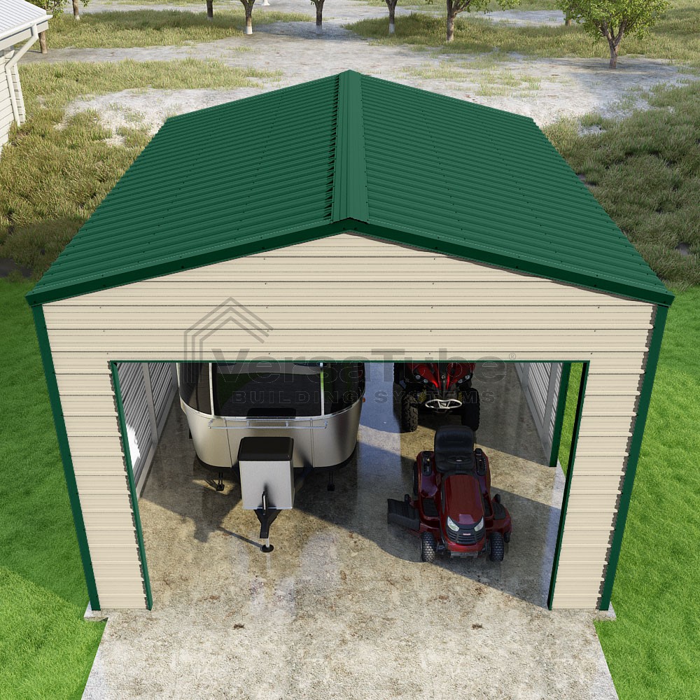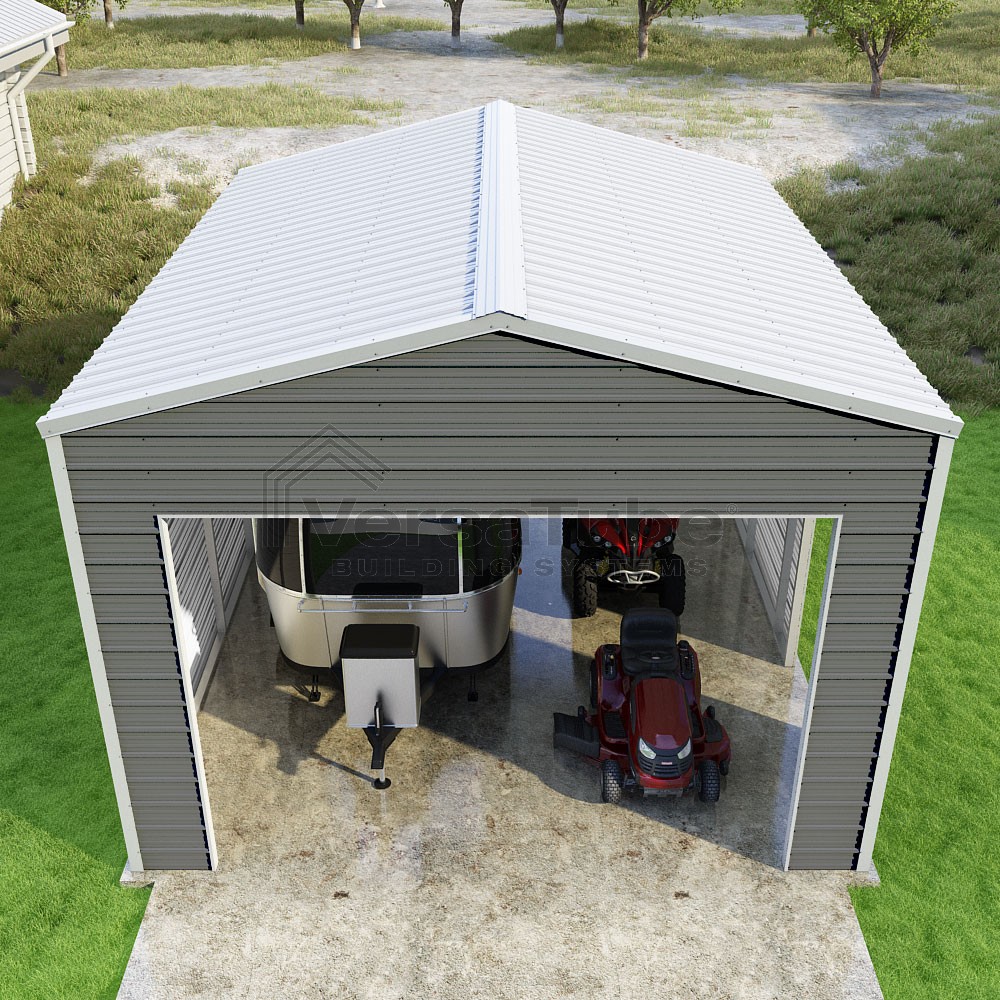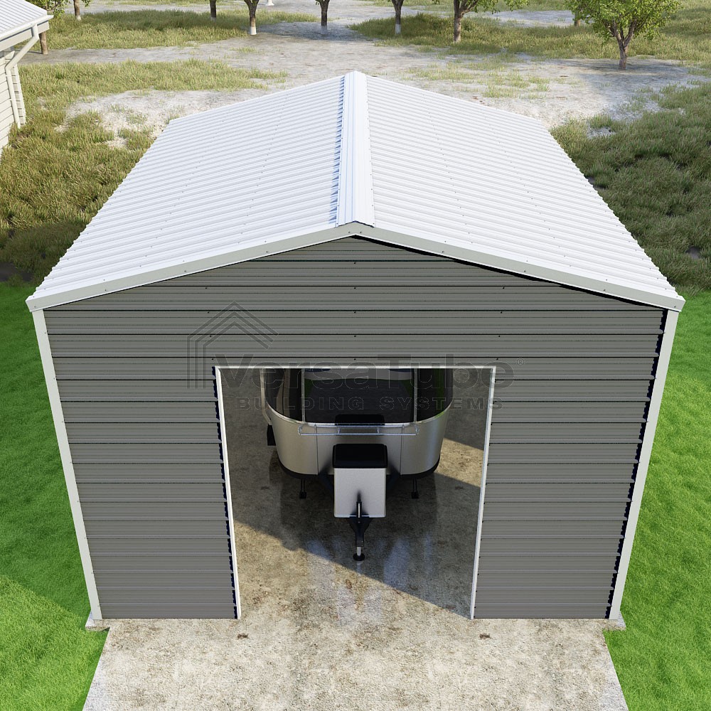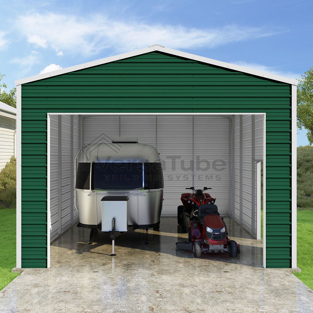 Frontier Series DIY garage kit features vertical sheet metal roof panels with horizontal siding panels..