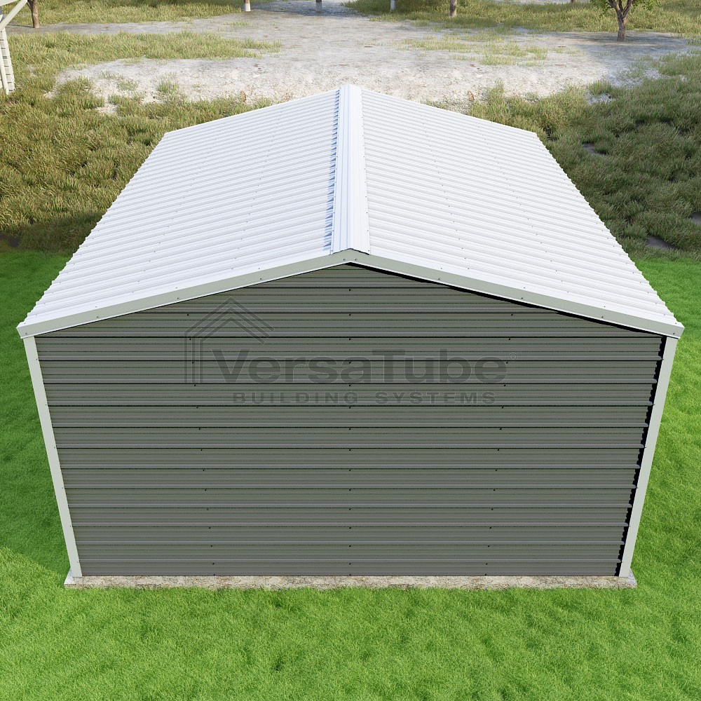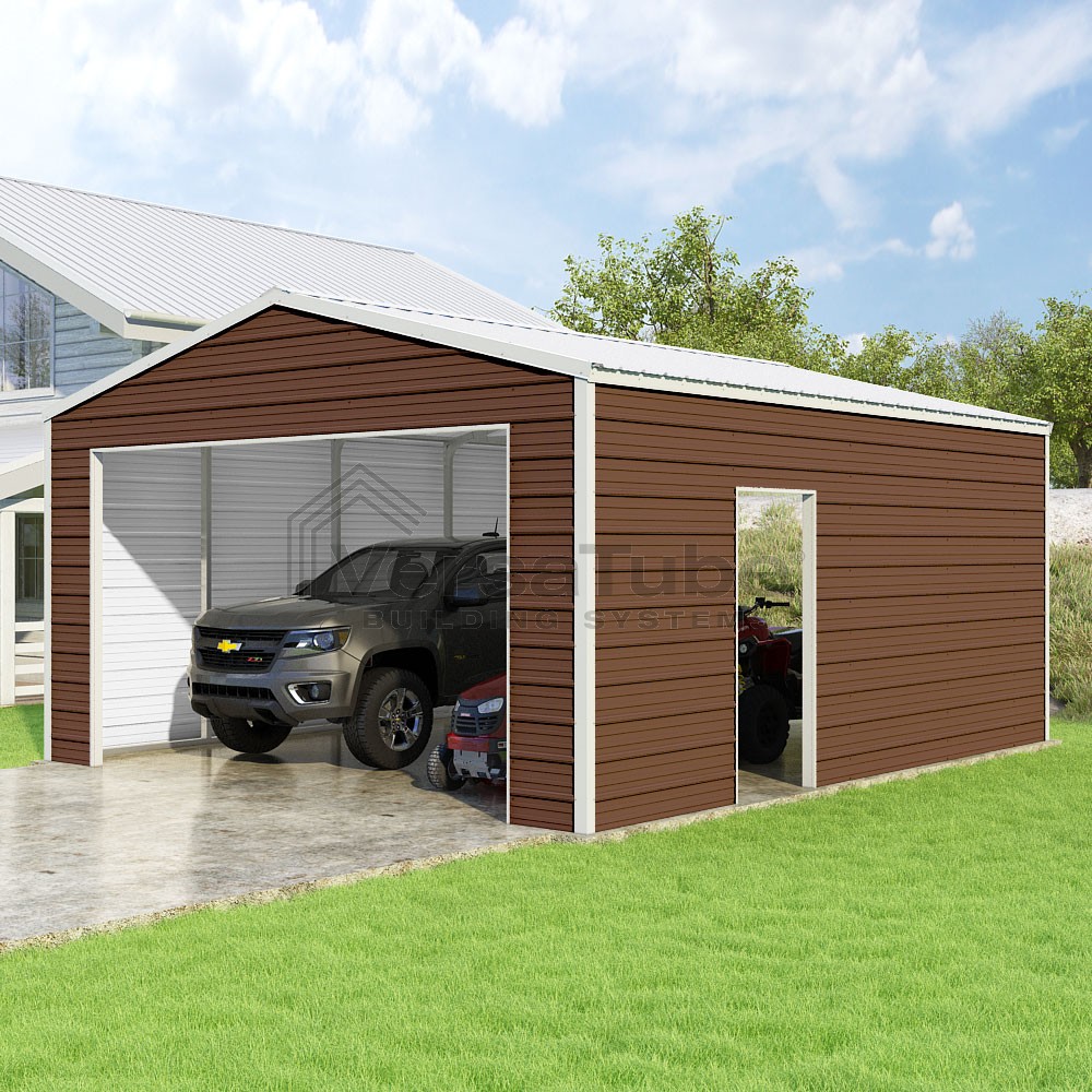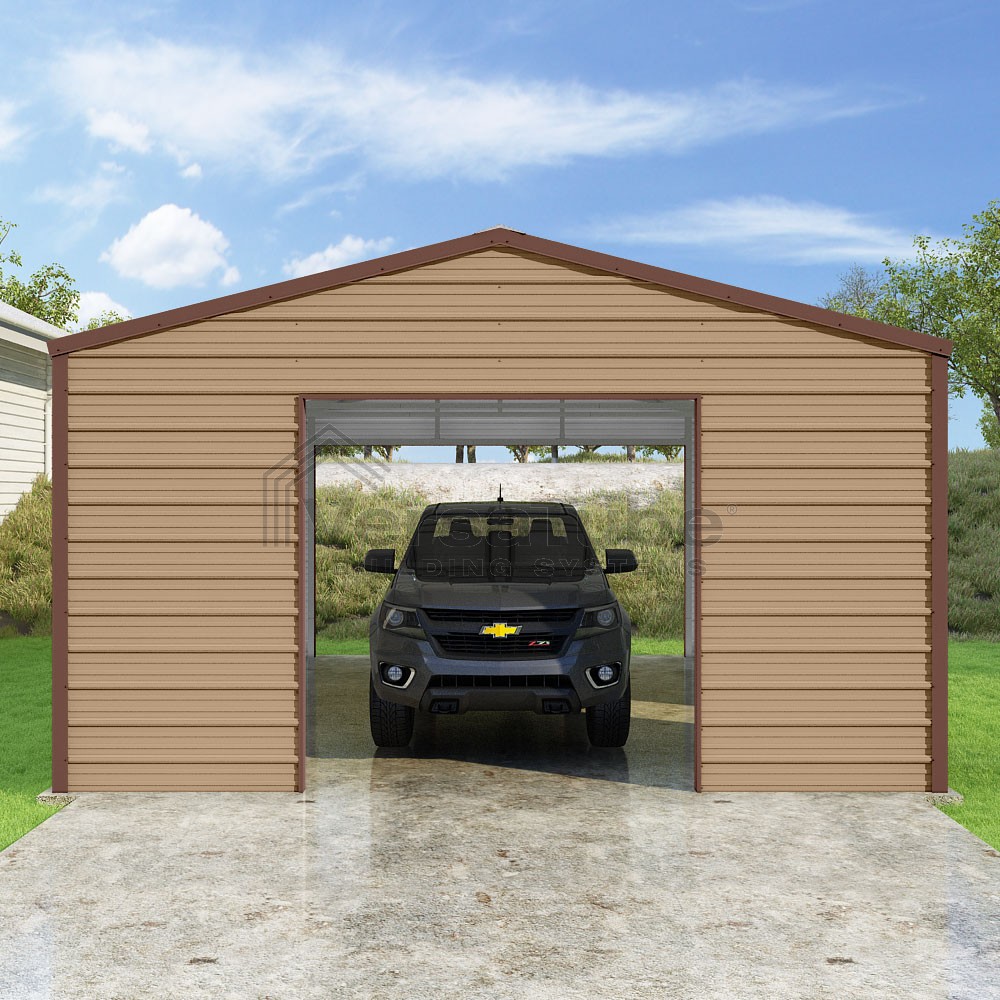 Frontier Series DIY garage kit features vertical sheet metal roof panels with horizontal siding panels..
