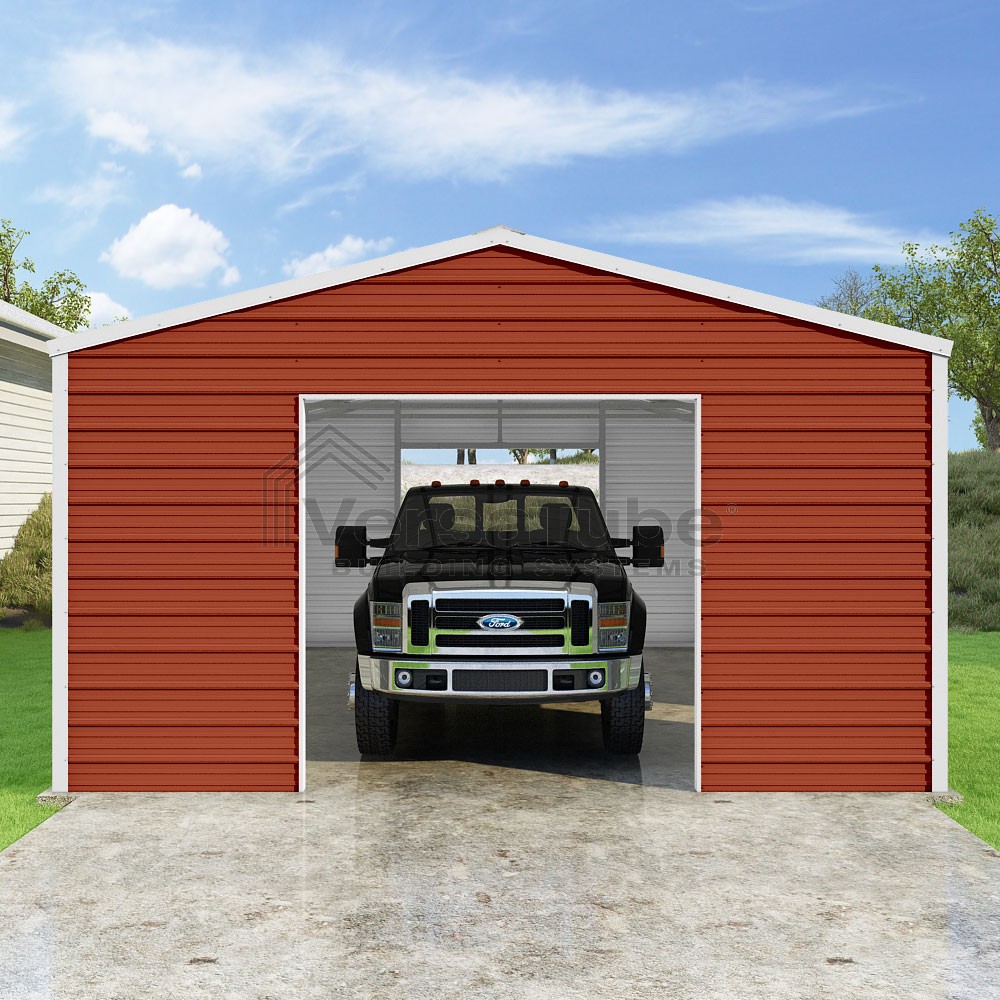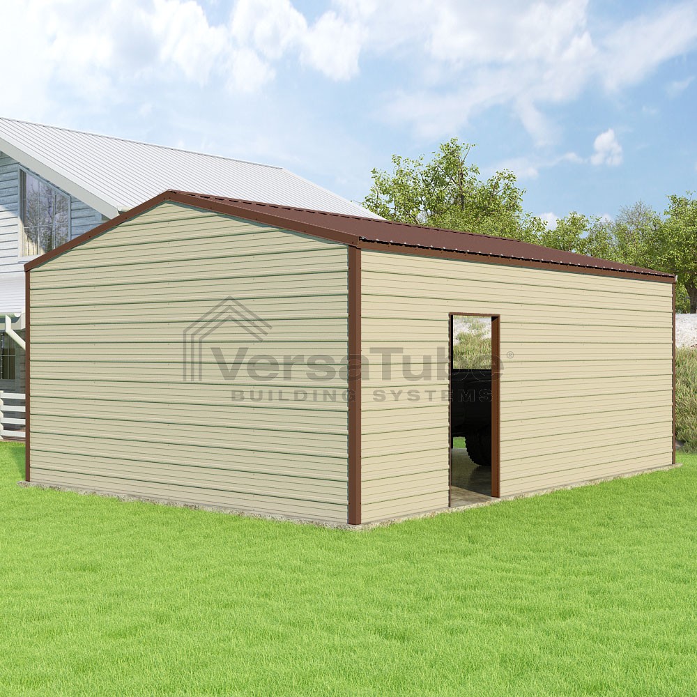 Frontier Series DIY garage kit features vertical sheet metal roof panels with horizontal siding panels..