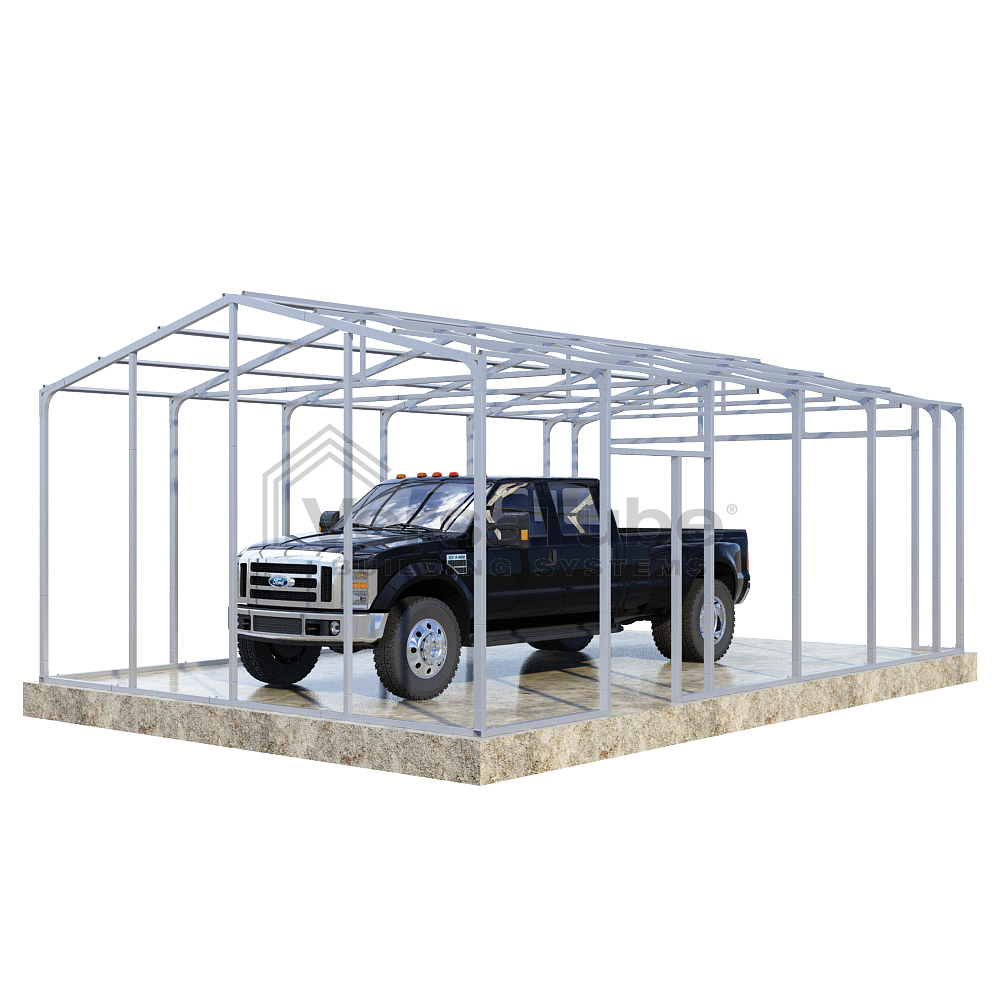 Frontier Series DIY garage frame kit includes roof purlins for applying vertical sheet metal panels or other roofing materials. No side girts are included with the Frontier frame kit.