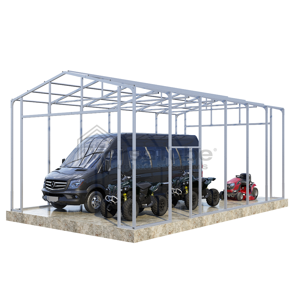 Frontier Series DIY garage frame kit includes roof purlins for applying vertical sheet metal panels or other roofing materials. No side girts are included with the Frontier frame kit.