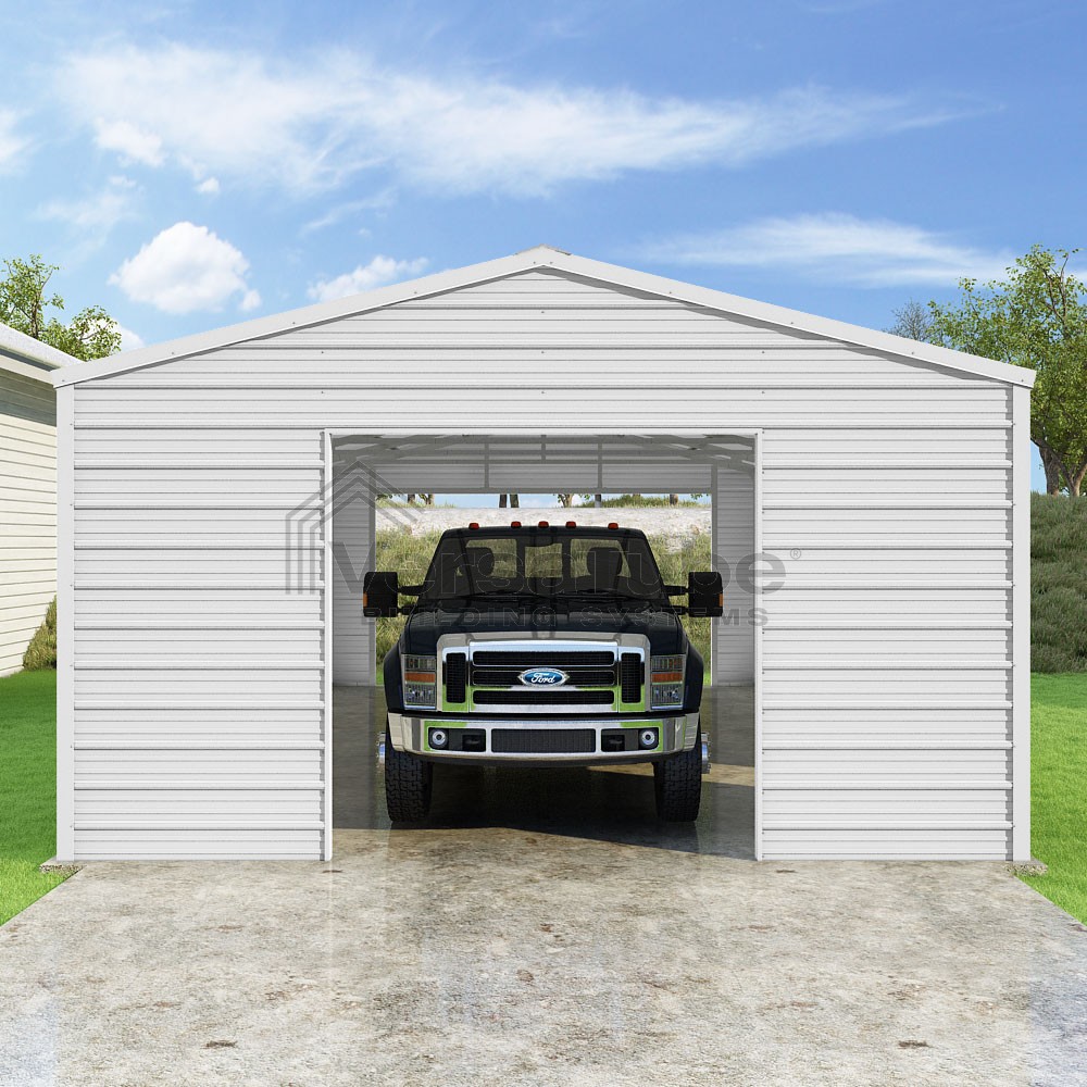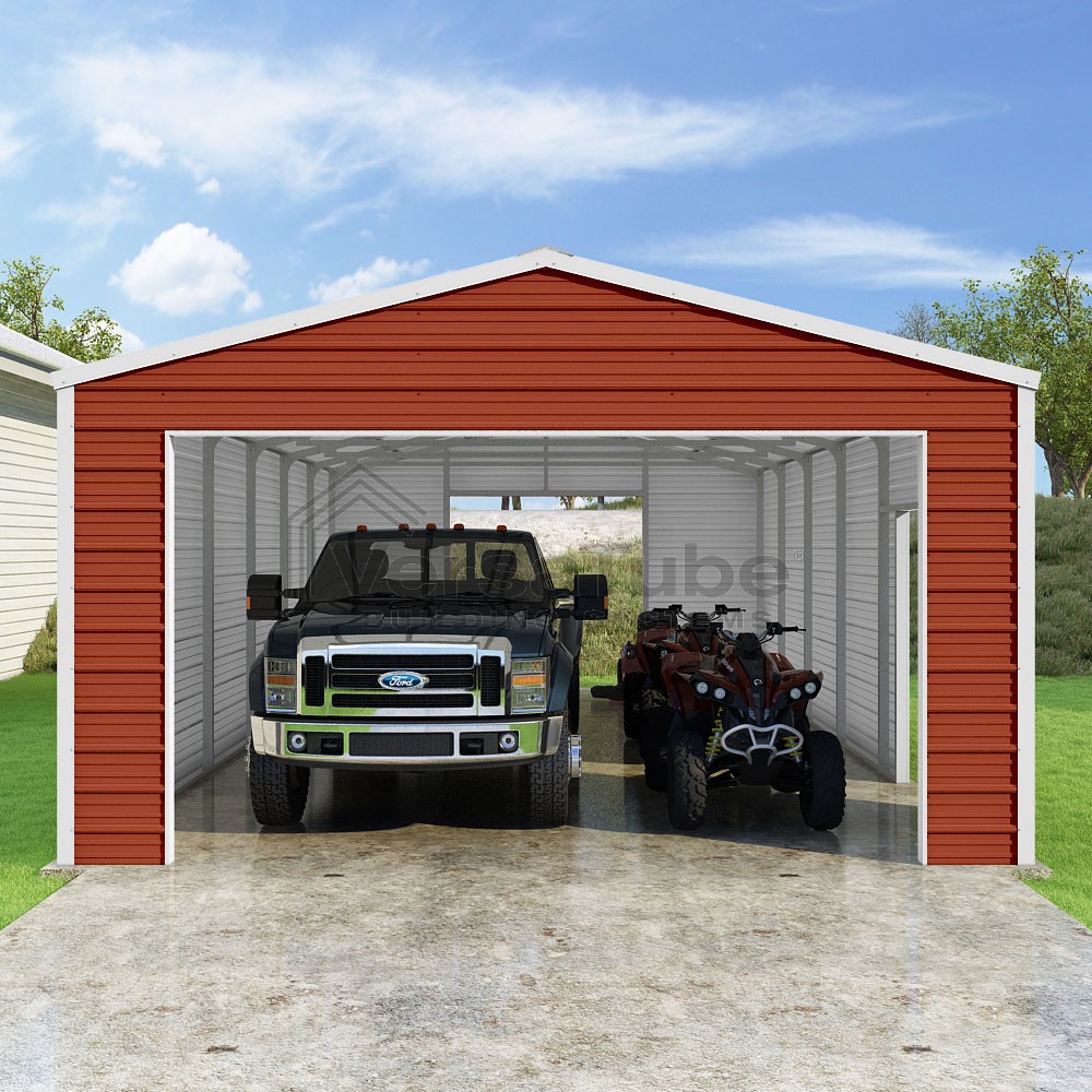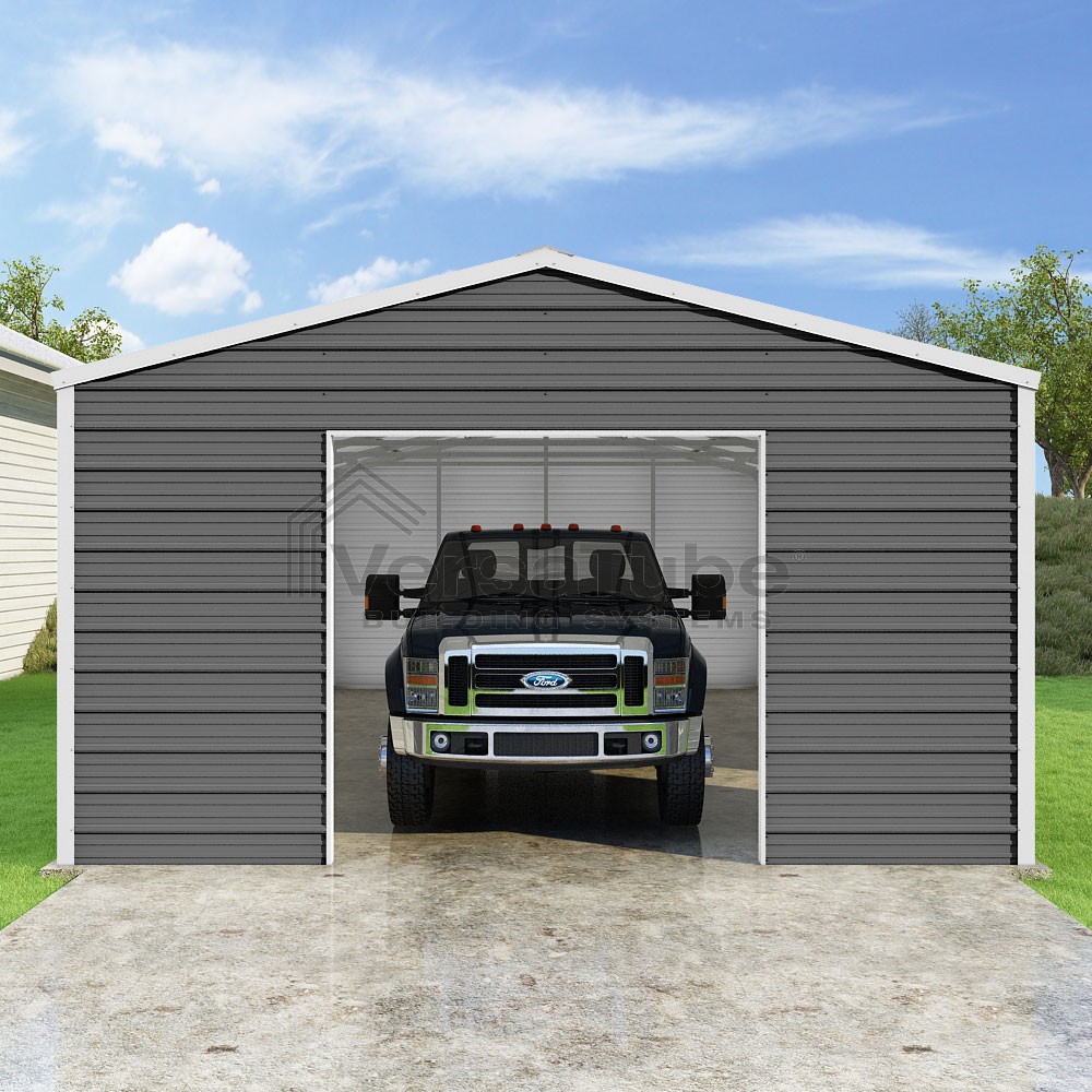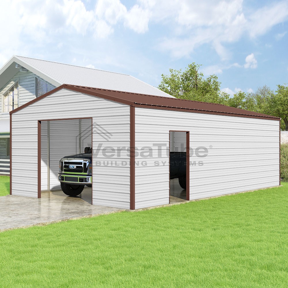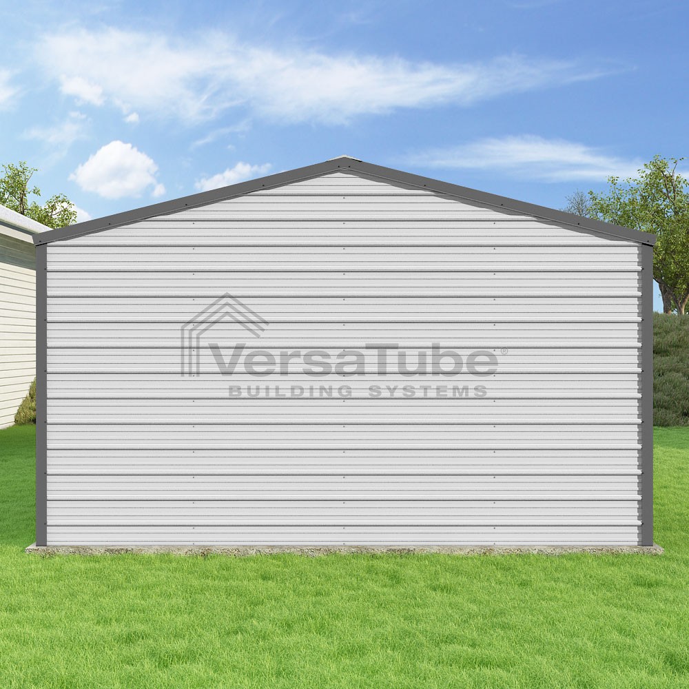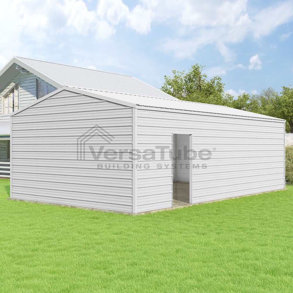 Frontier Series DIY garage kit features vertical sheet metal roof panels with horizontal siding panels..