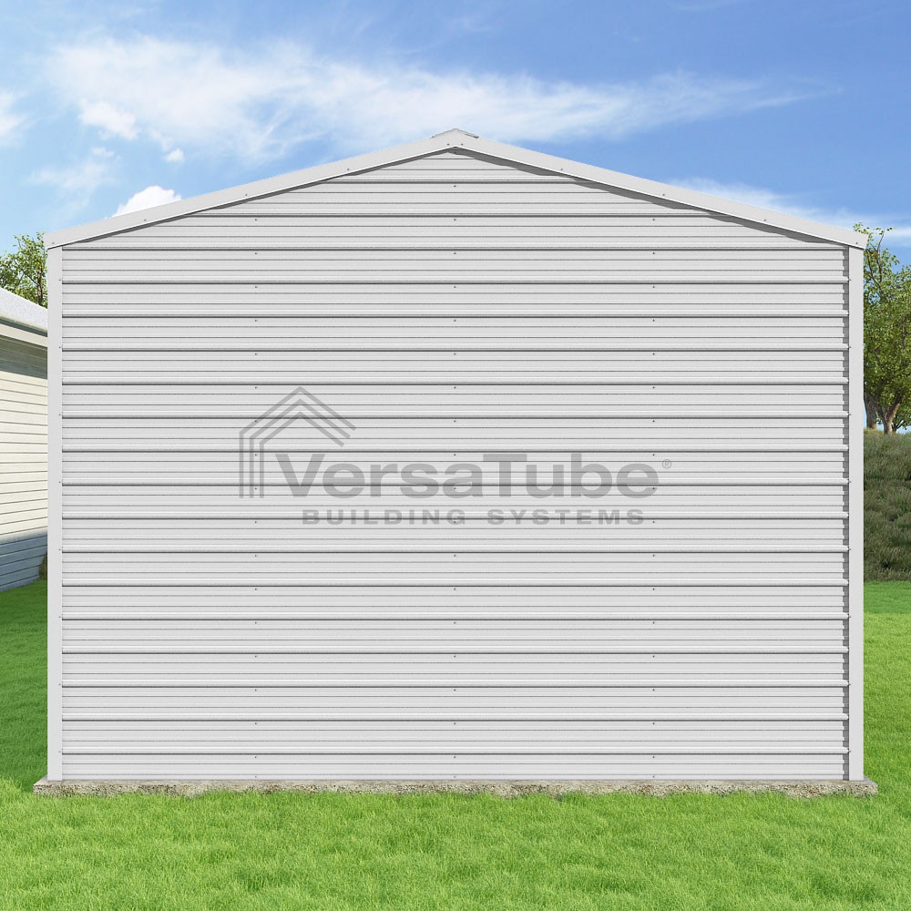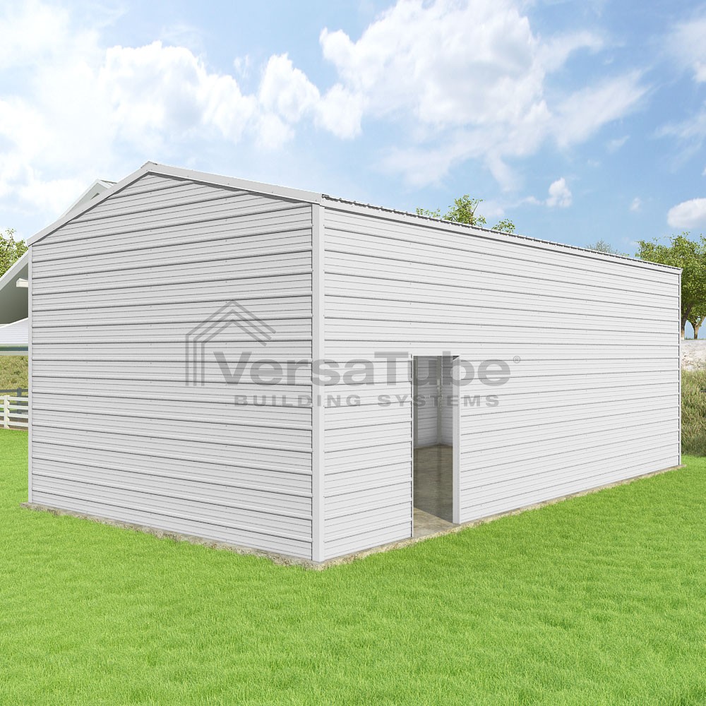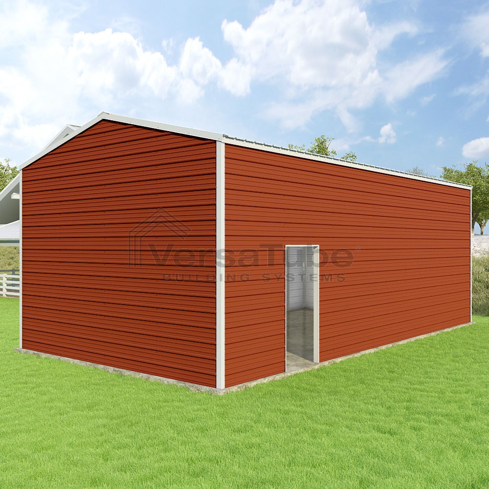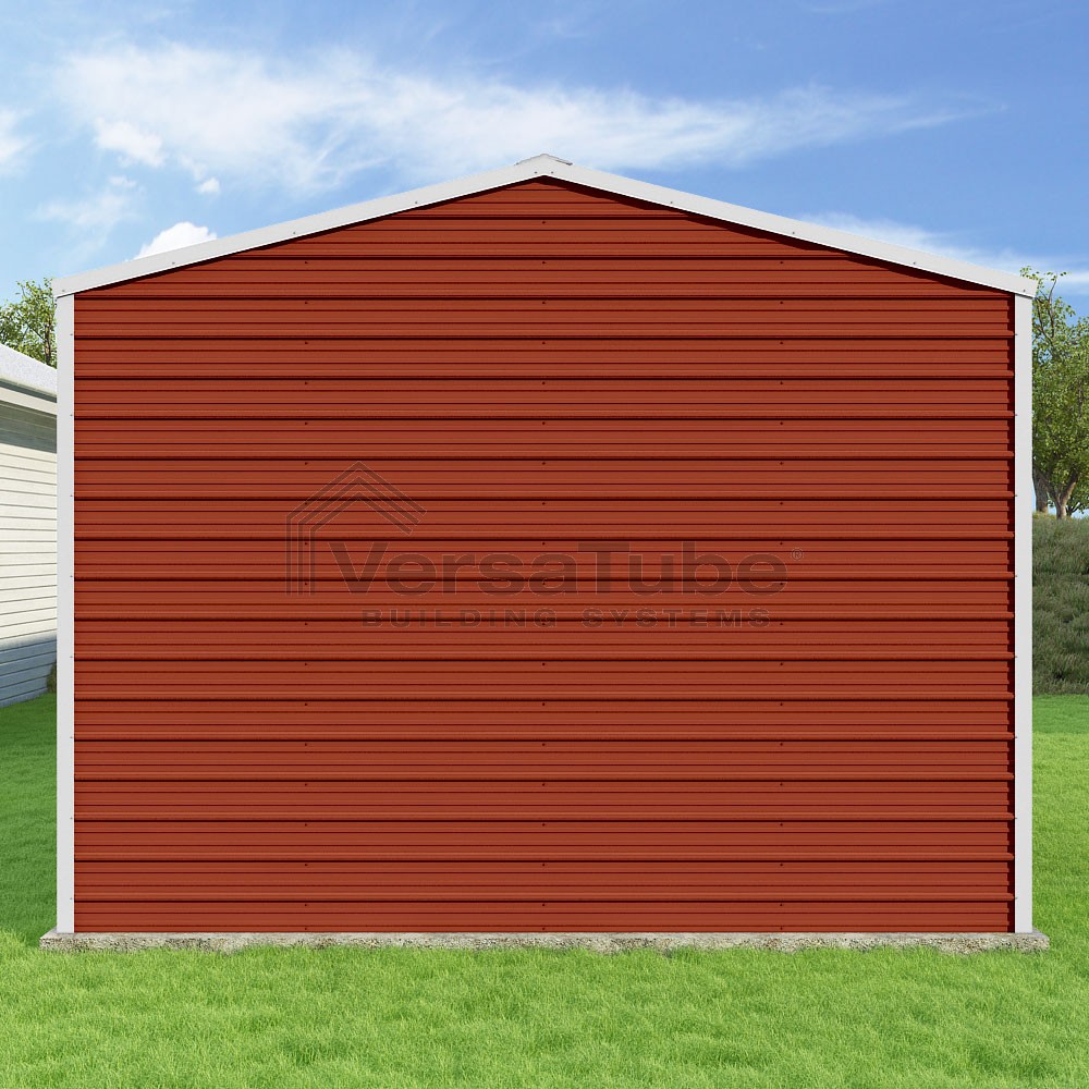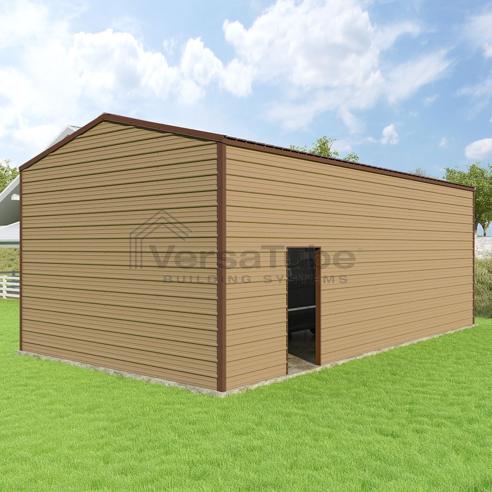 Frontier Series DIY garage kit features vertical sheet metal roof panels with horizontal siding panels..