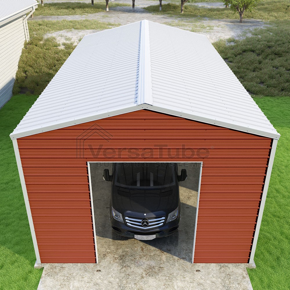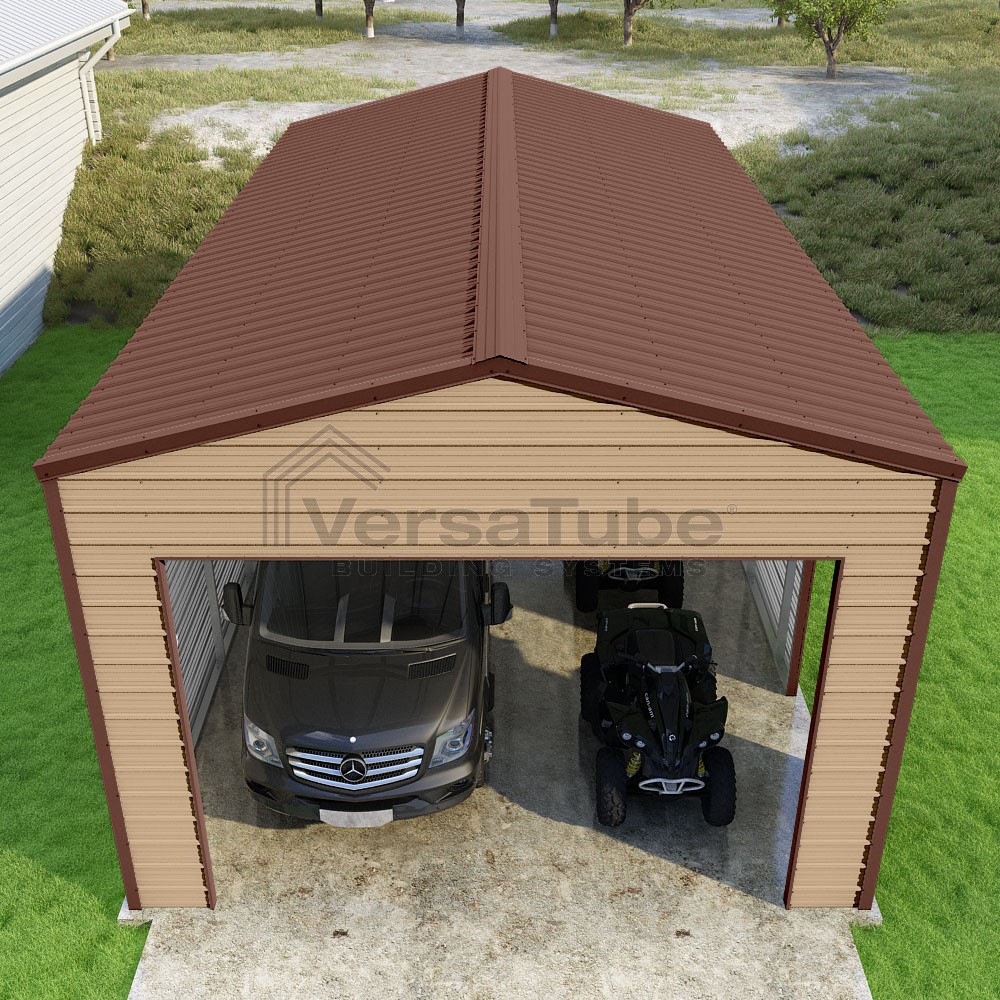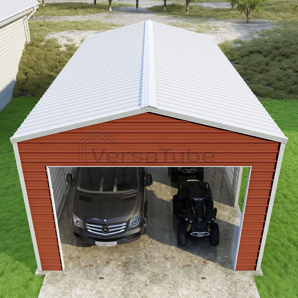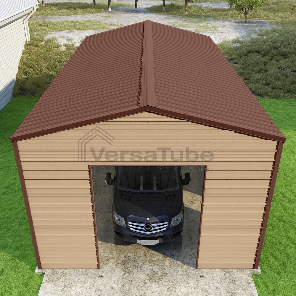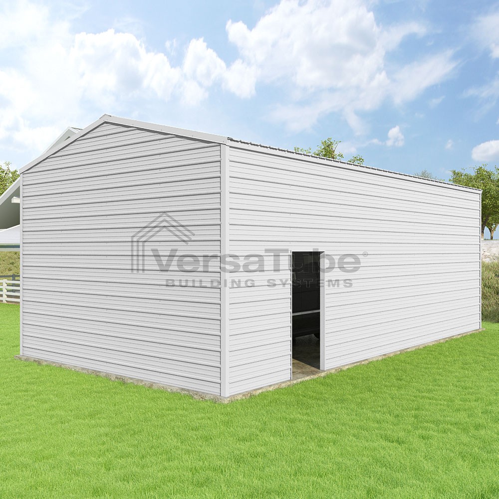 Frontier Series DIY garage kit features vertical sheet metal roof panels with horizontal siding panels..