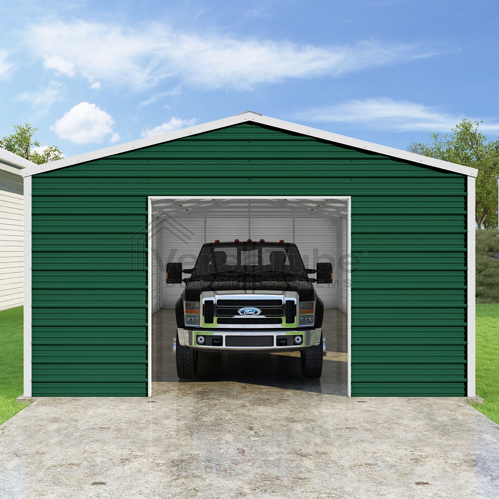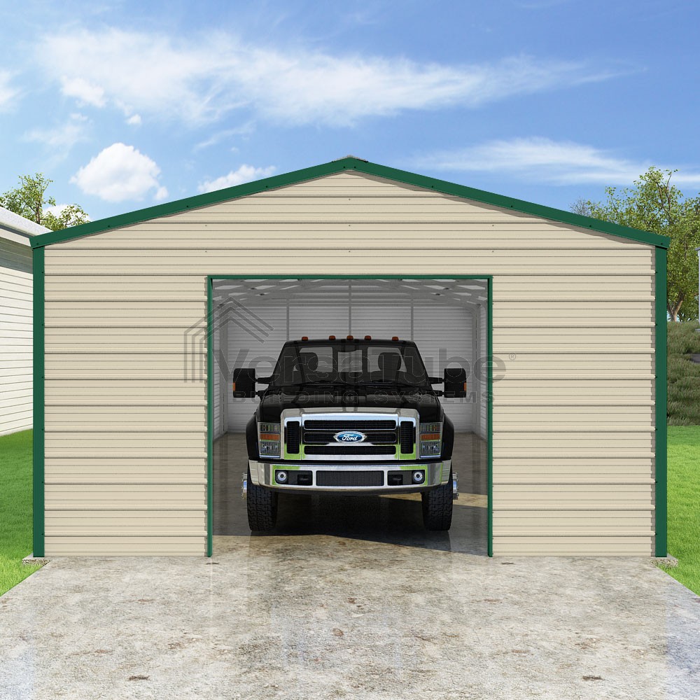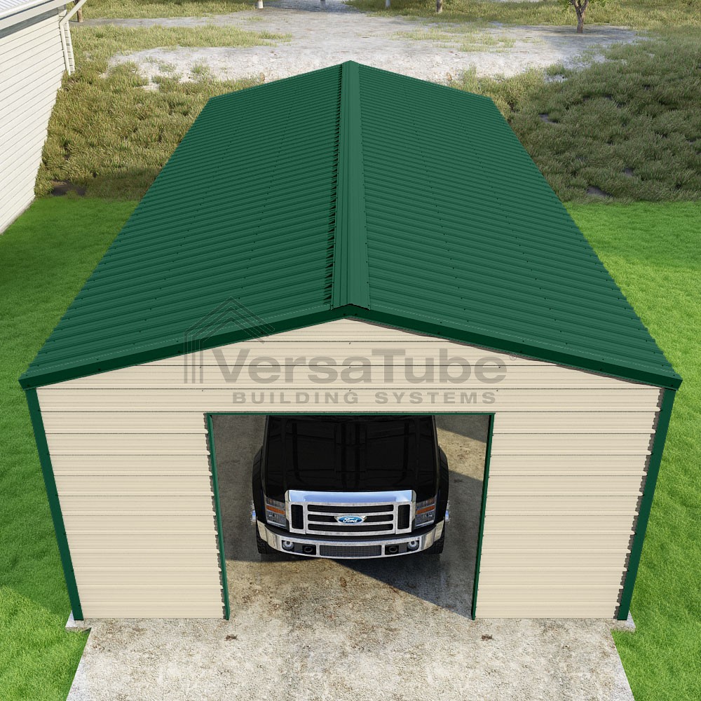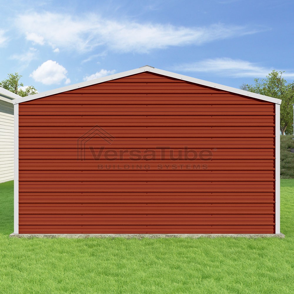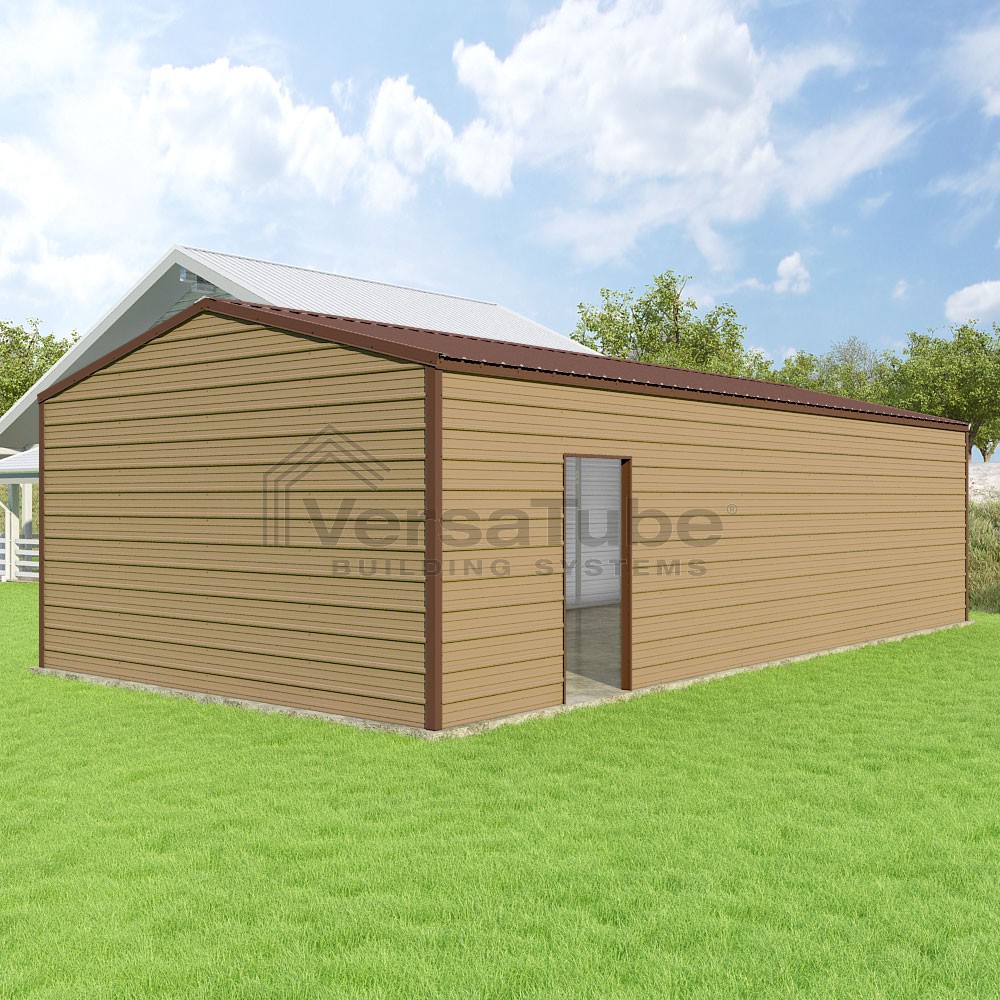 Frontier Series DIY garage kit features vertical sheet metal roof panels with horizontal siding panels..