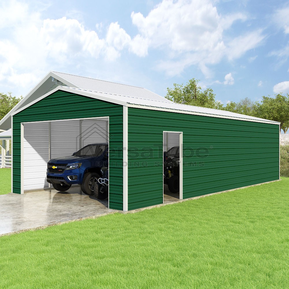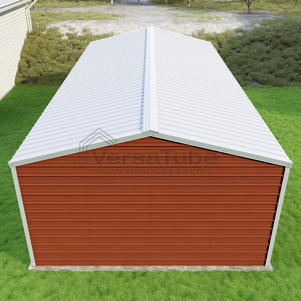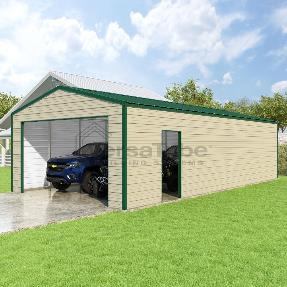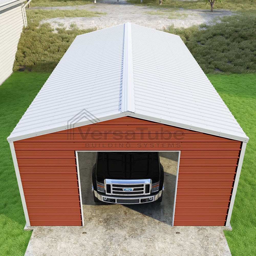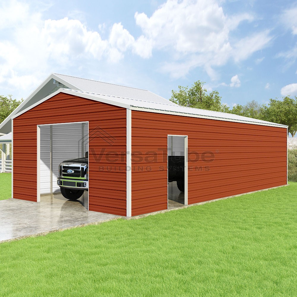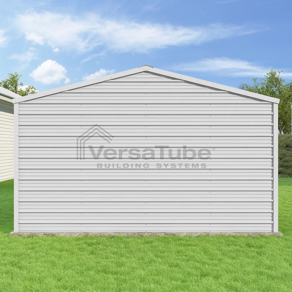 Frontier Series DIY garage kit features vertical sheet metal roof panels with horizontal siding panels..