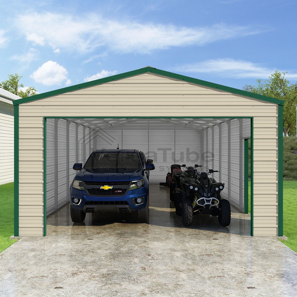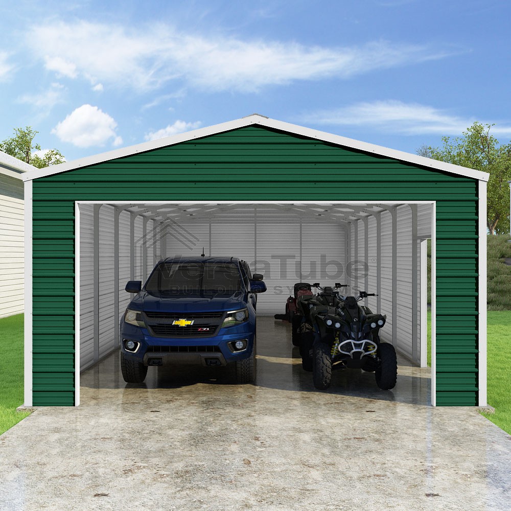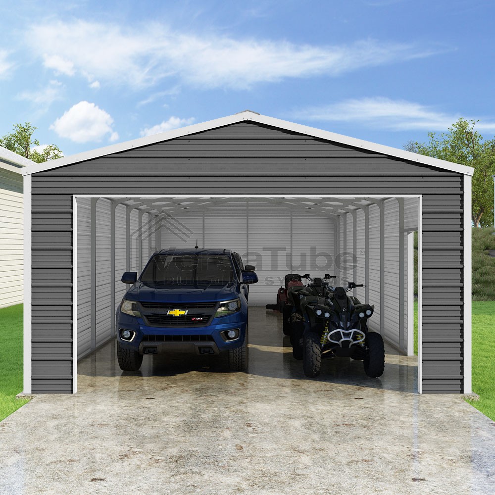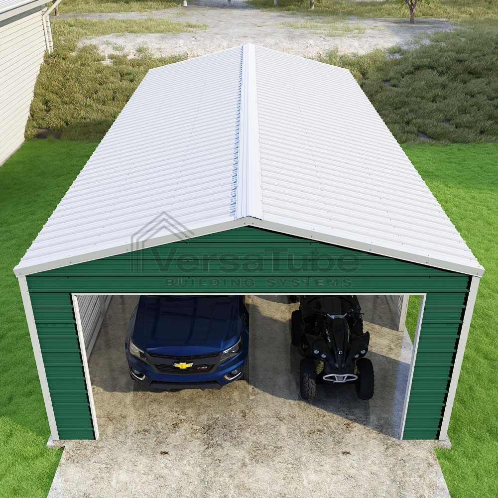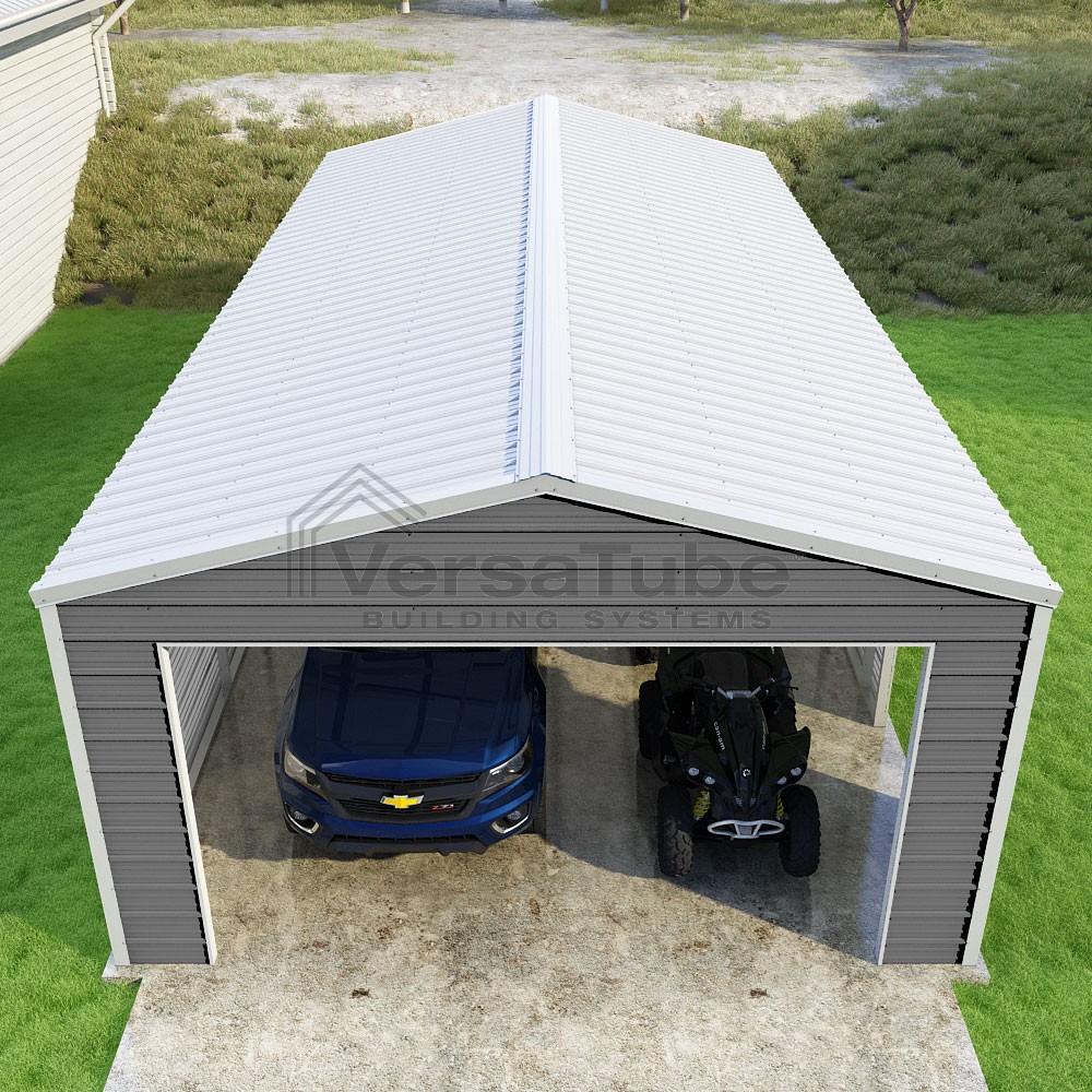 Frontier Series DIY garage kit features vertical sheet metal roof panels with horizontal siding panels..