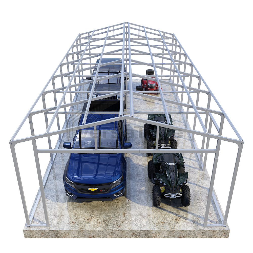 Frontier Series DIY garage frame kit includes roof purlins for applying vertical sheet metal panels or other roofing materials. No side girts are included with the Frontier frame kit.