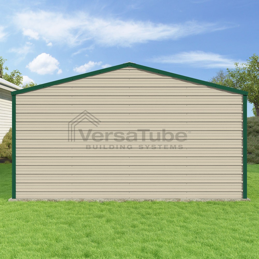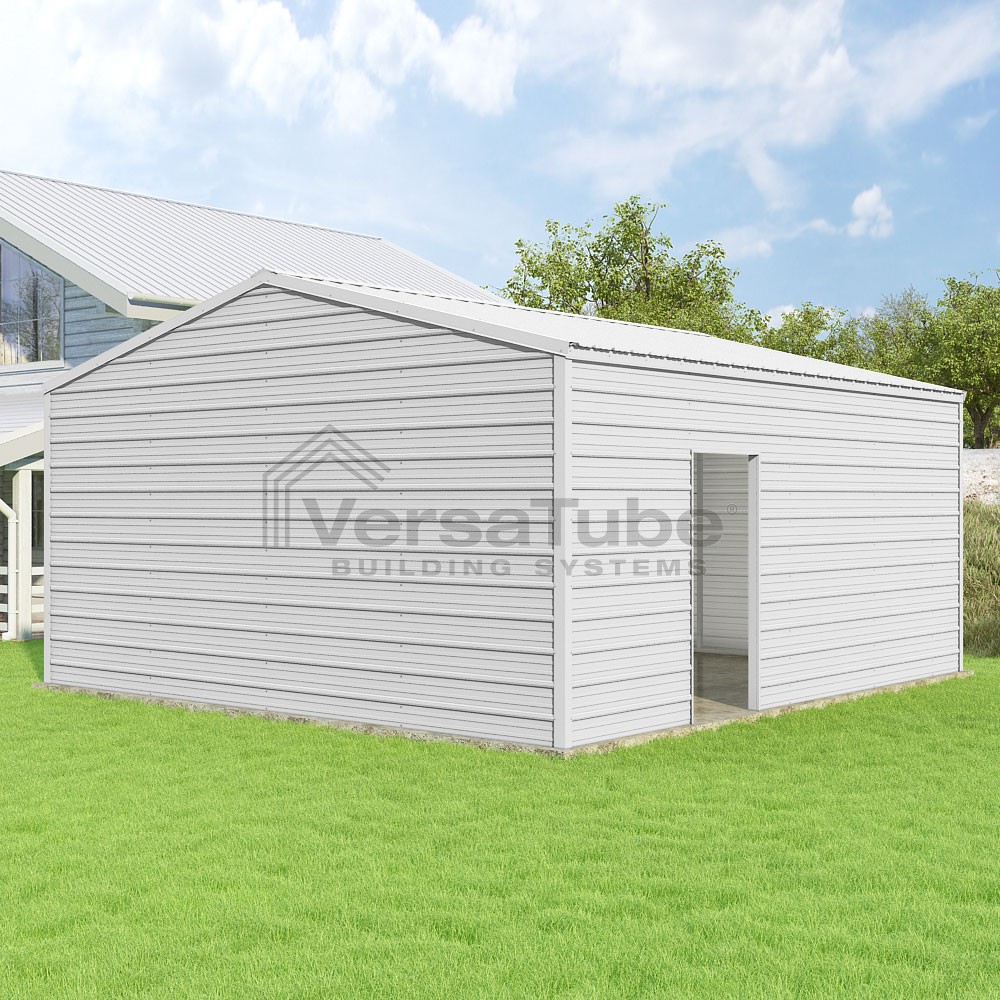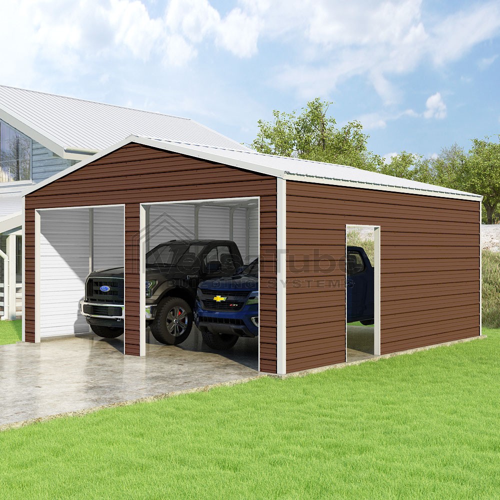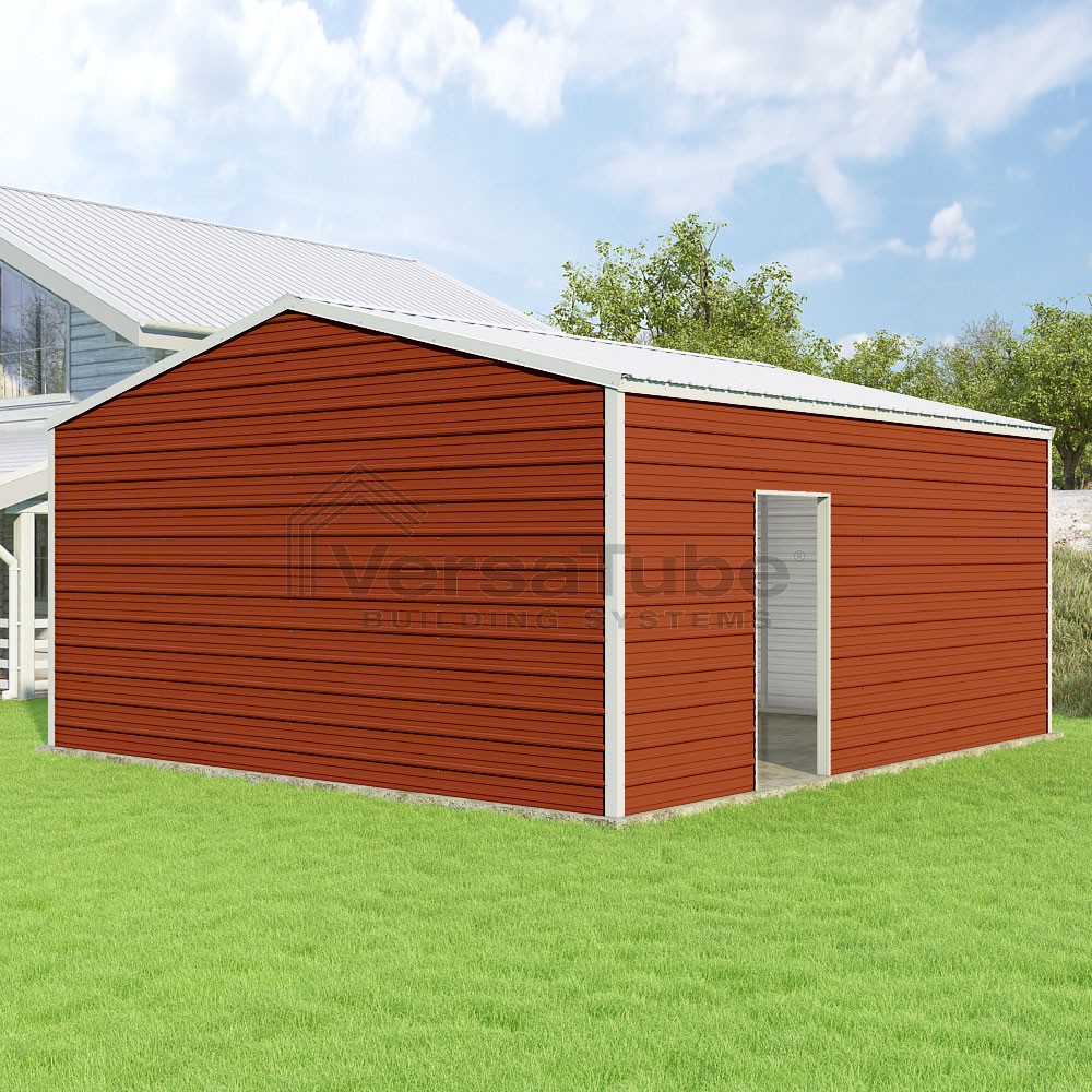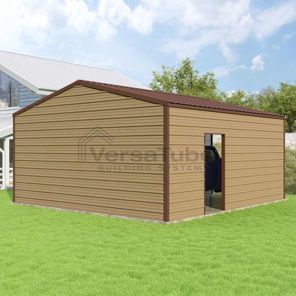 Frontier Series DIY garage kit features vertical sheet metal roof panels with horizontal siding panels..