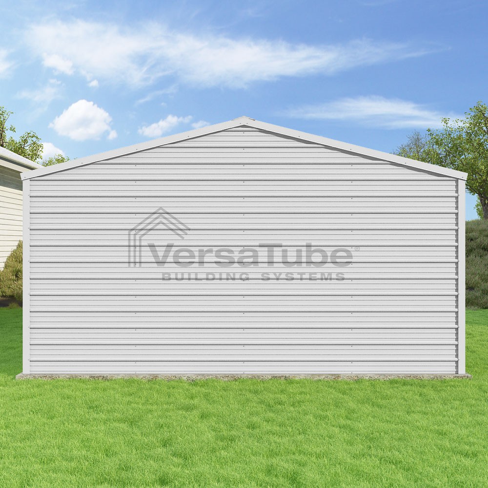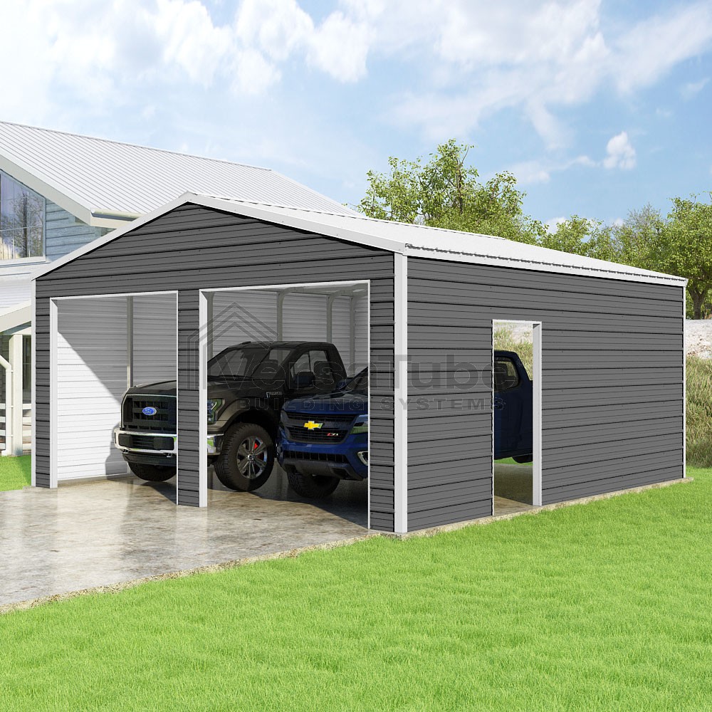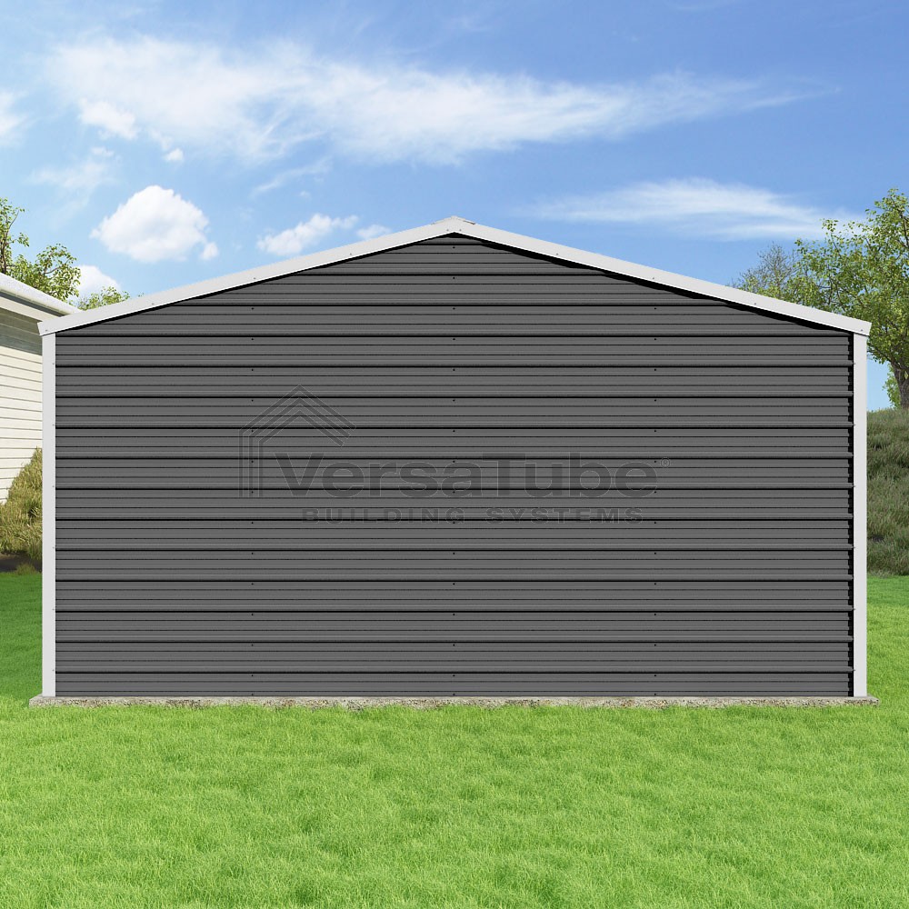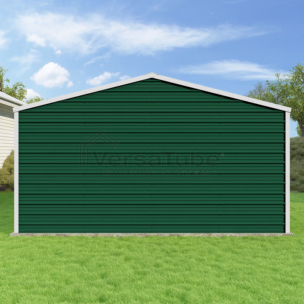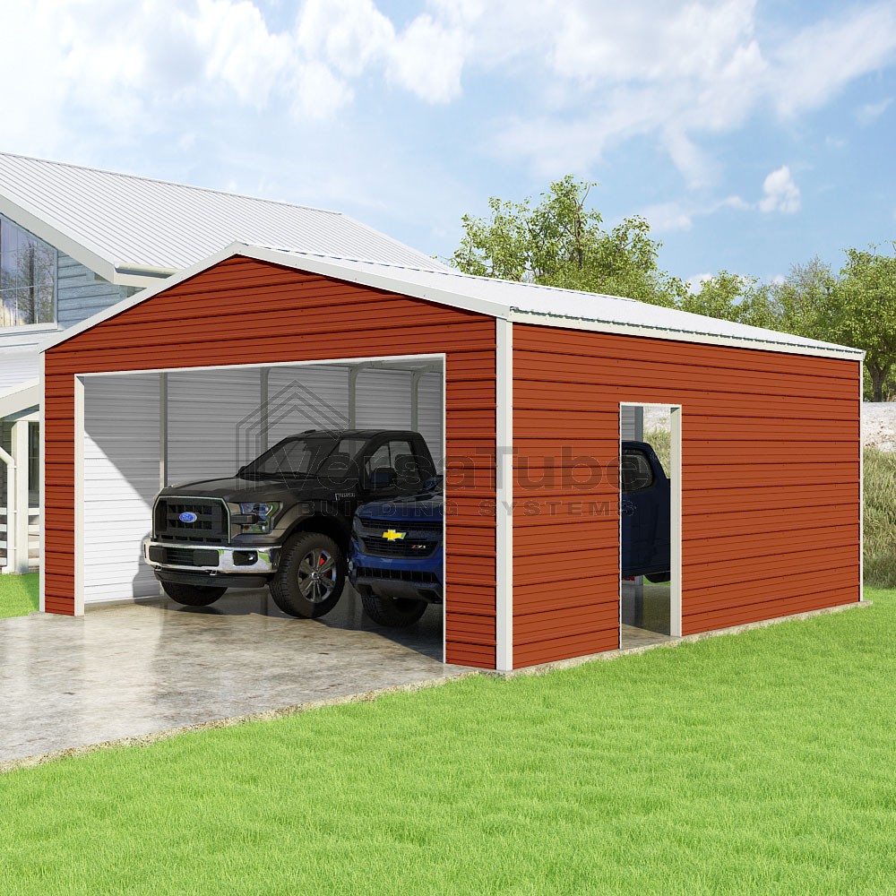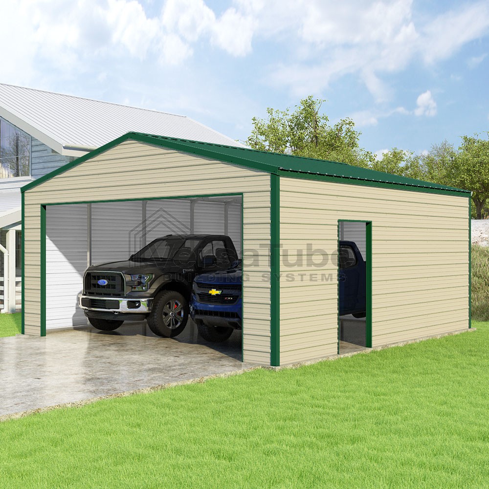 Frontier Series DIY garage kit features vertical sheet metal roof panels with horizontal siding panels..