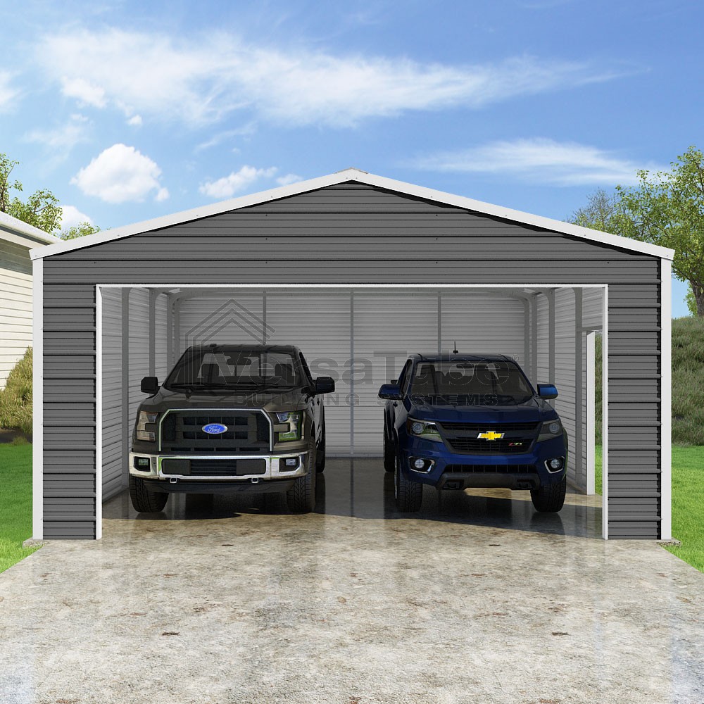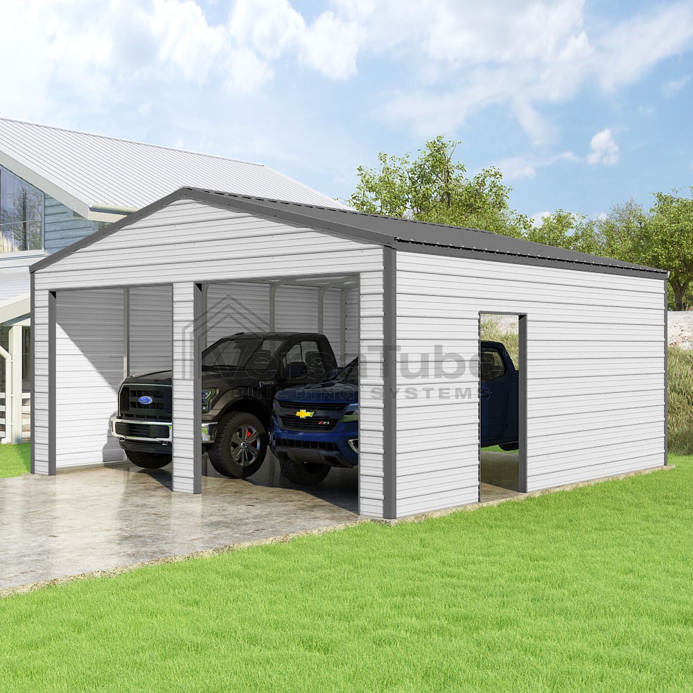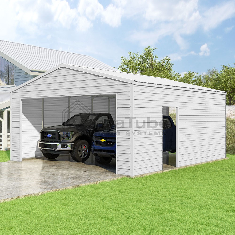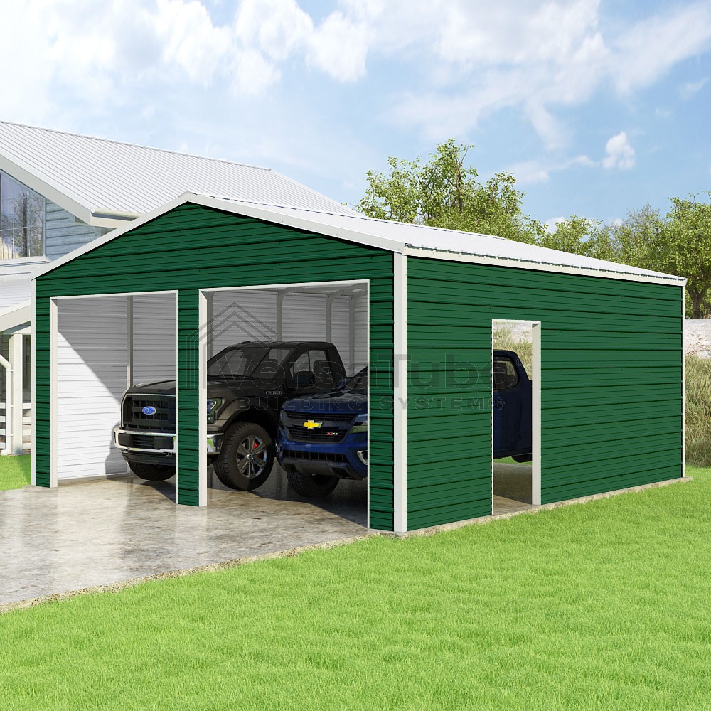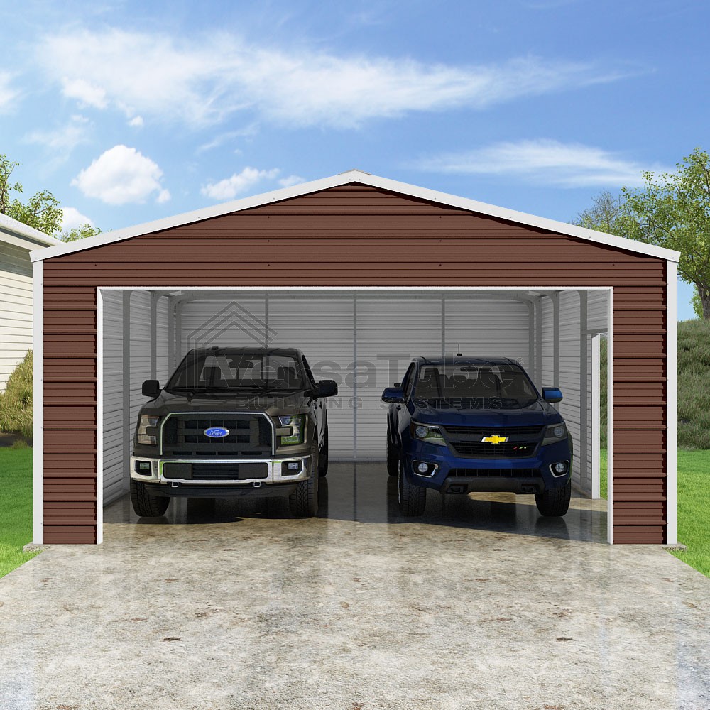 Frontier Series DIY garage kit features vertical sheet metal roof panels with horizontal siding panels..