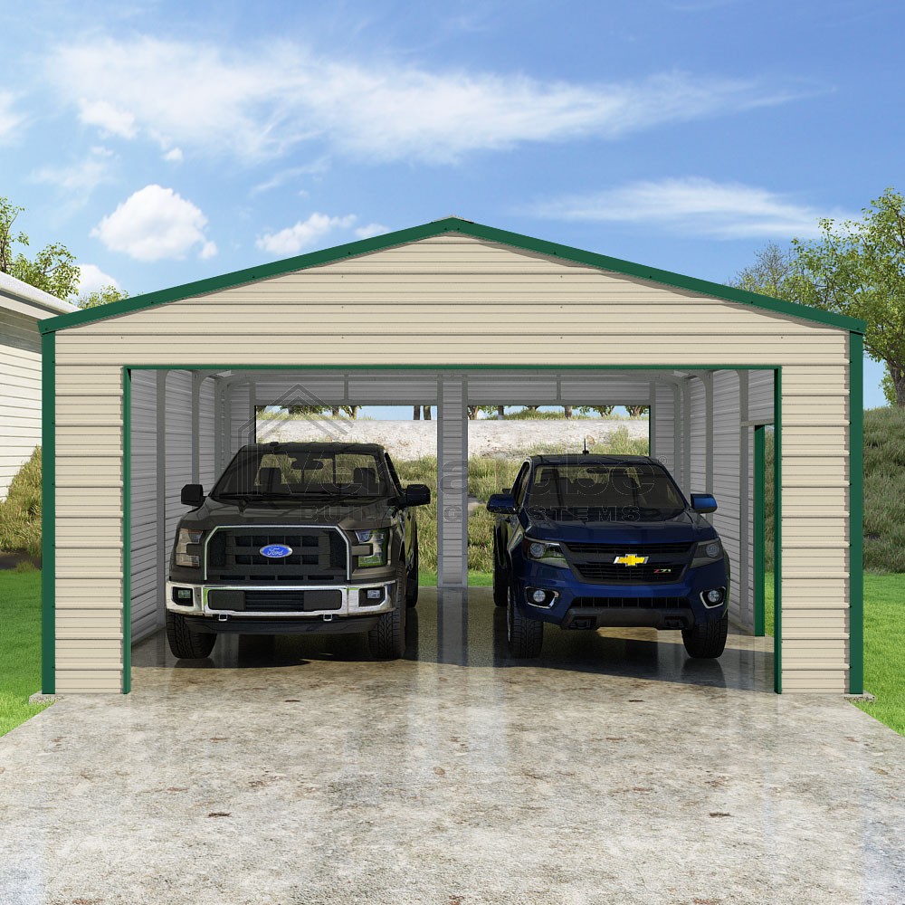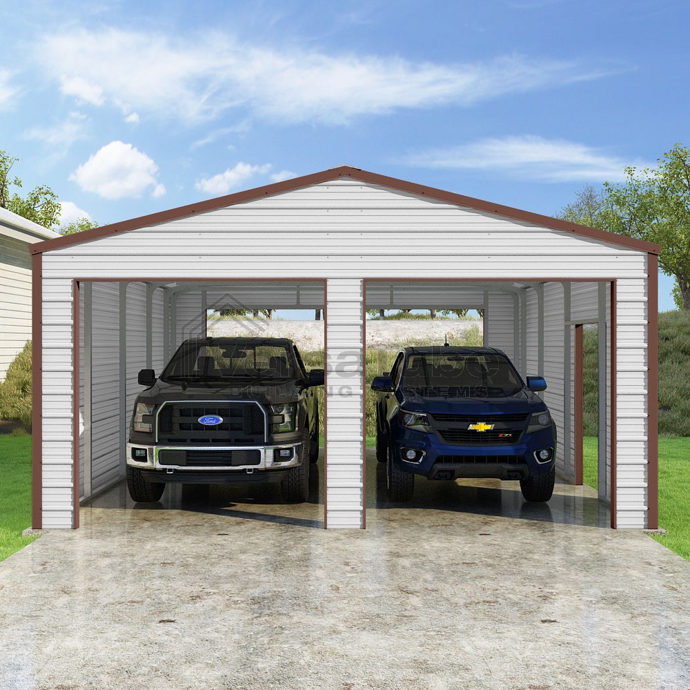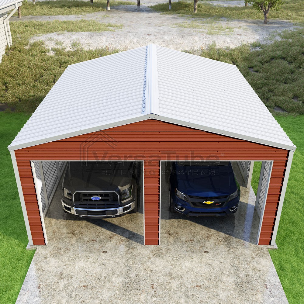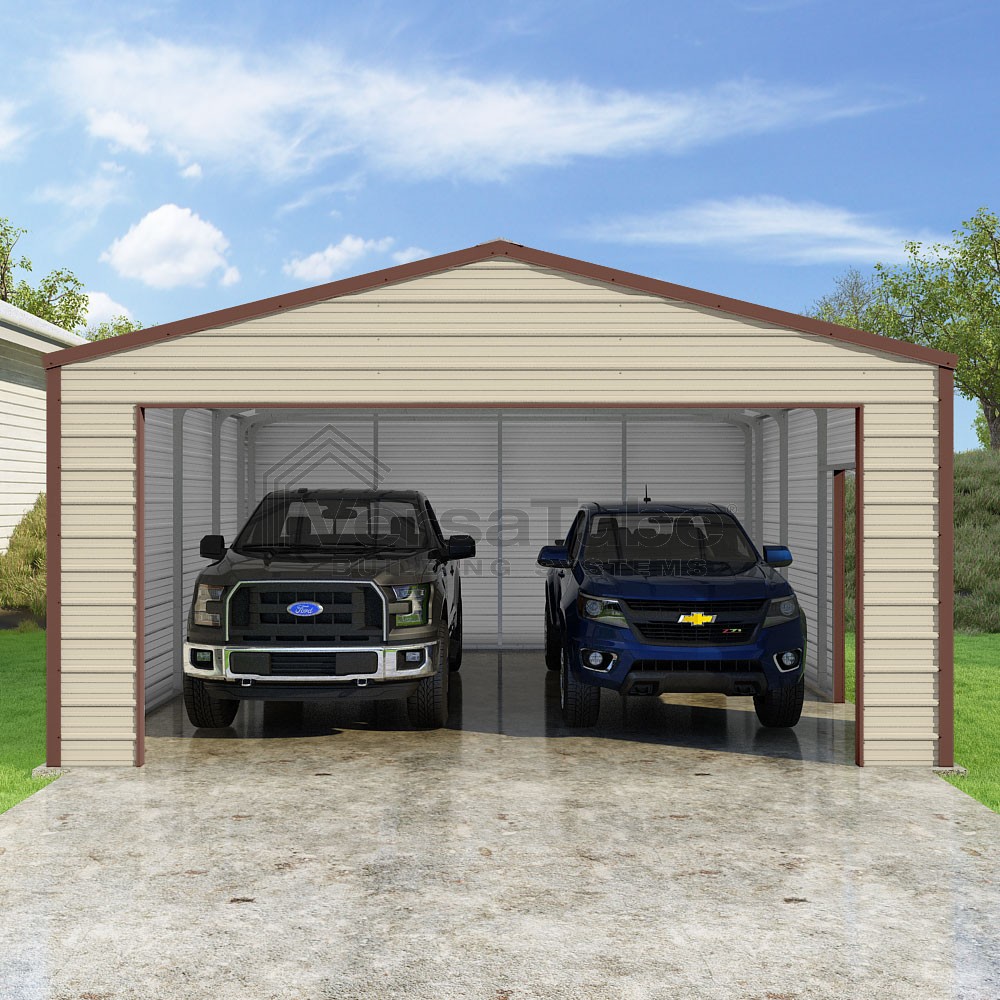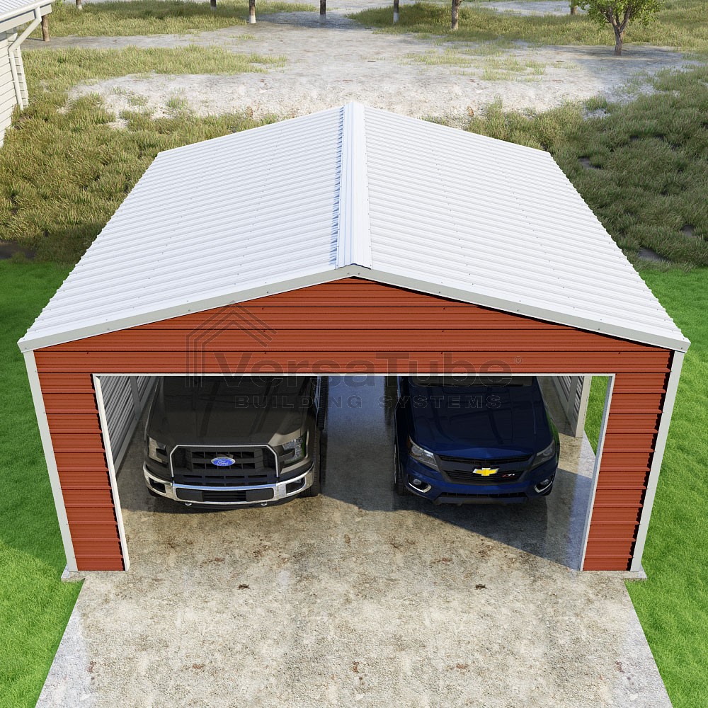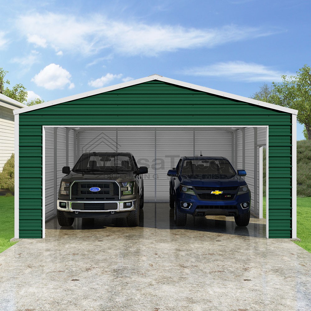 Frontier Series DIY garage kit features vertical sheet metal roof panels with horizontal siding panels..